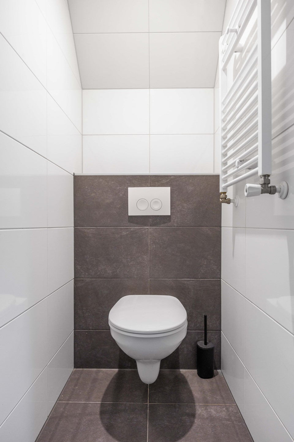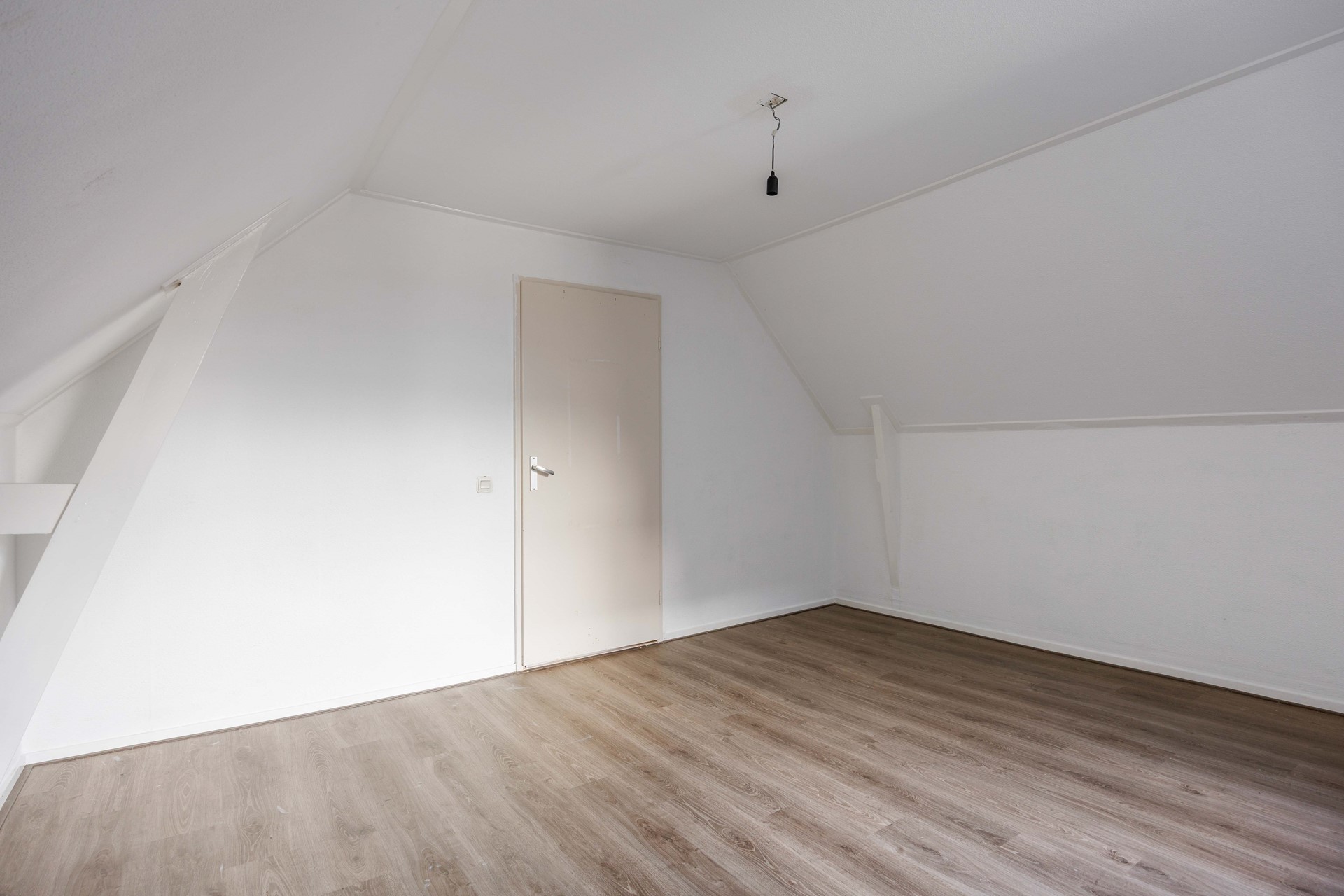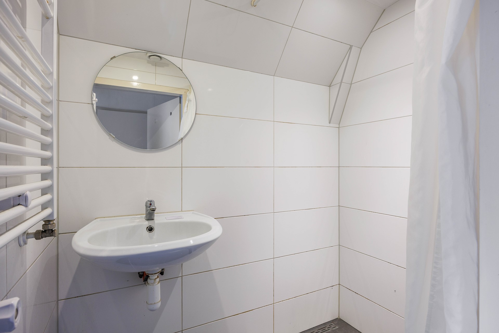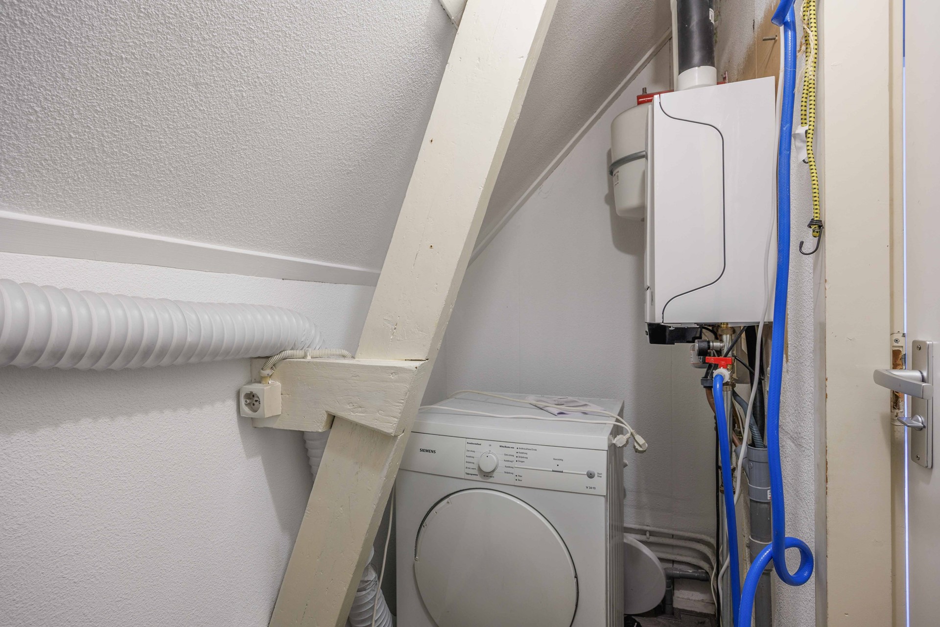 Terug op de overloop vind je de overige ruimtes: de badkamer met douche en wastafel en een apart toilet direct ernaast. Aan het einde van de overloop ligt de tweede slaapkamer, met een oppervlakte van circa 13 m². Daarnaast is er een handige bergkast van bijna 3 m² met aansluiting voor de wasmachine en de Cv-installatie.