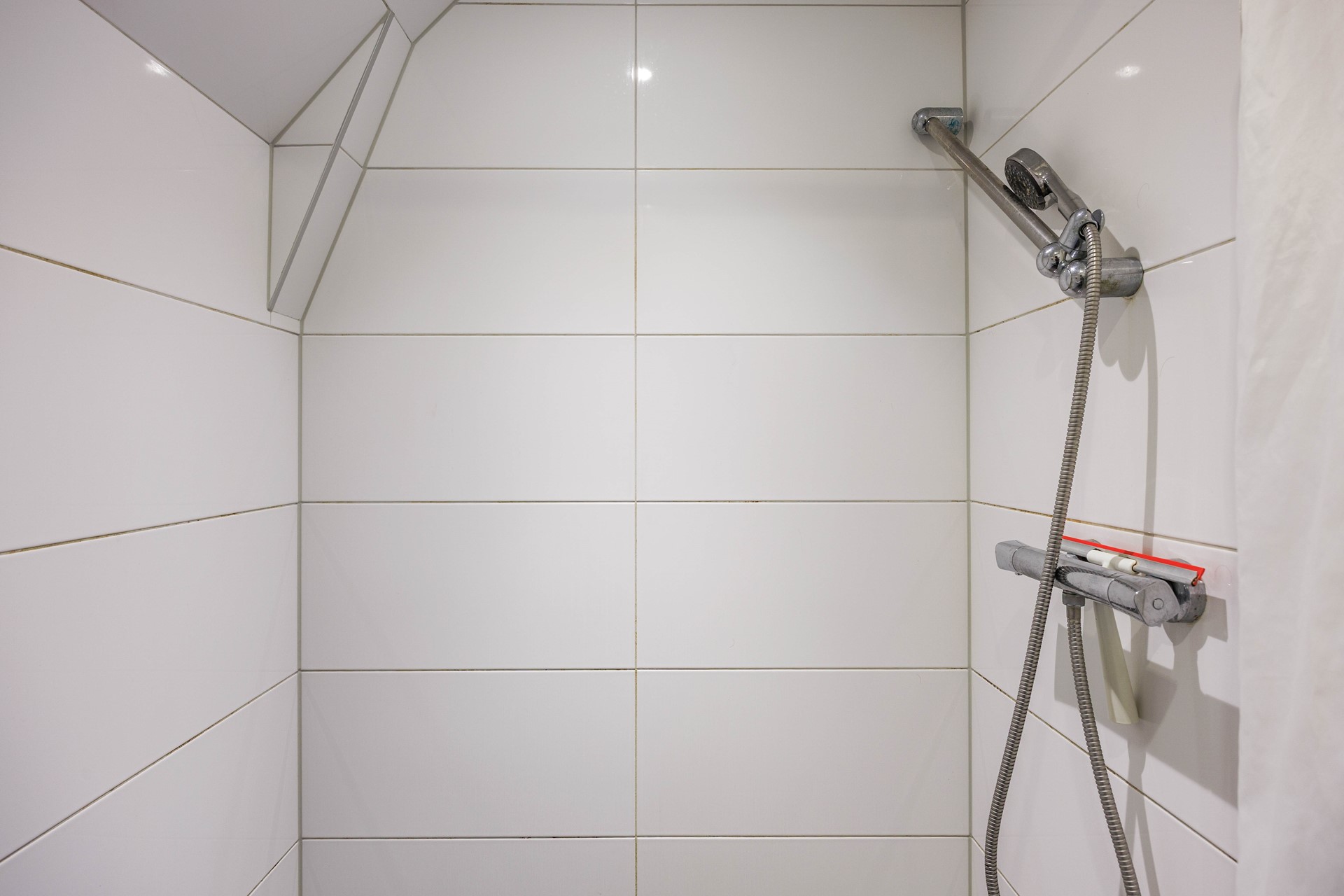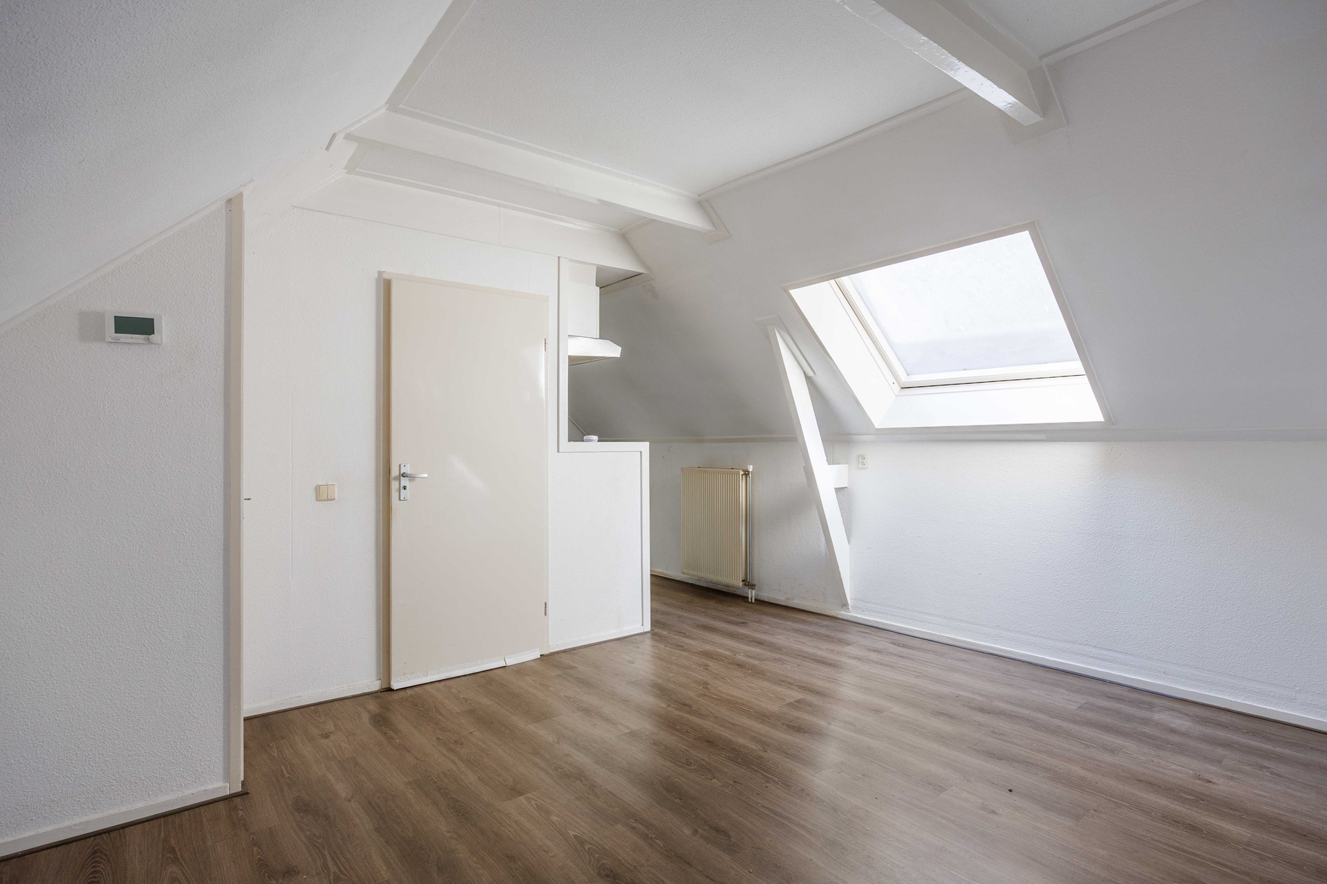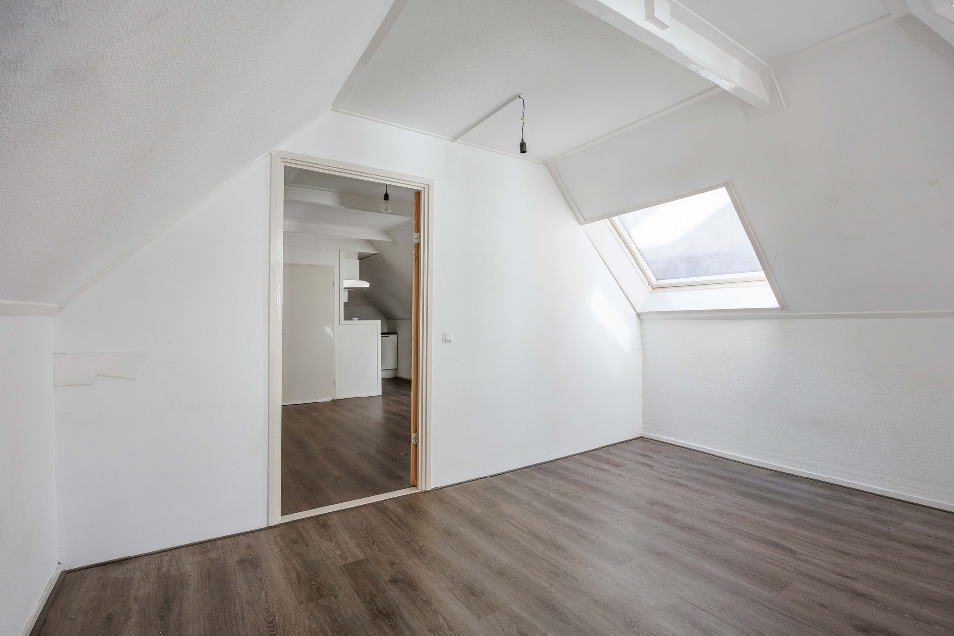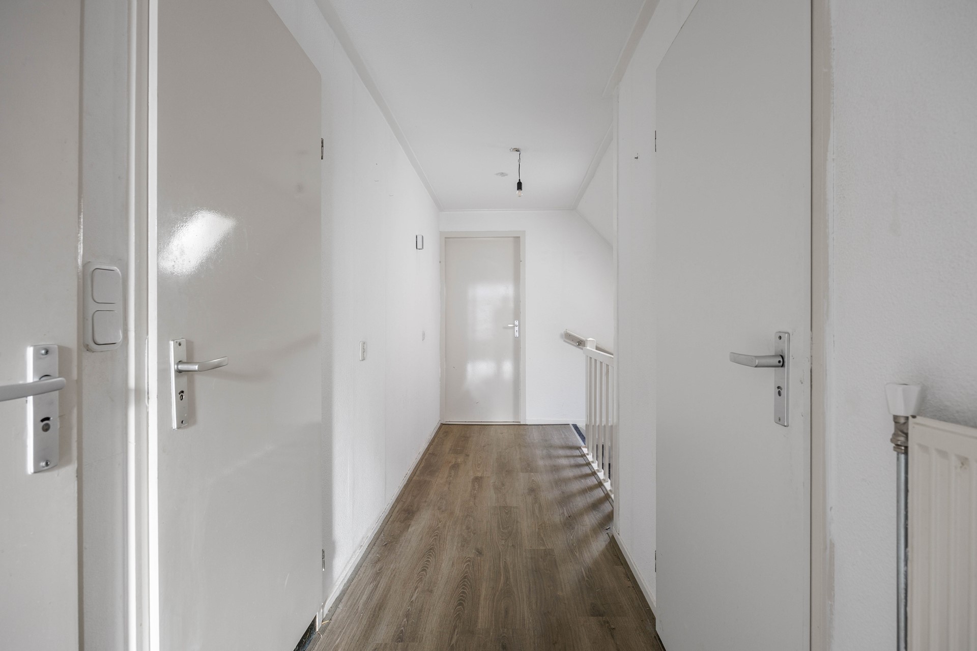Terug op de overloop vind je de overige ruimtes: de badkamer met douche en wastafel en een apart toilet direct ernaast. Aan het einde van de overloop ligt de tweede slaapkamer, met een oppervlakte van circa 13 m². Daarnaast is er een handige bergkast van bijna 3 m² met aansluiting voor de wasmachine en de Cv-installatie.