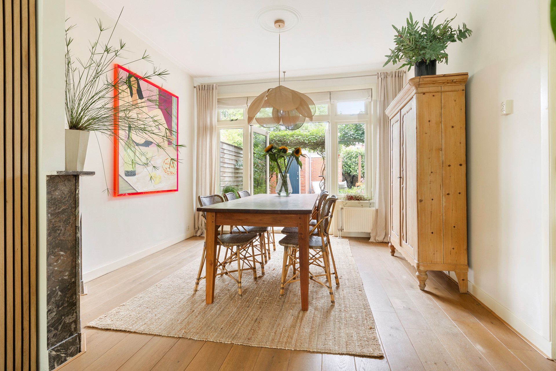 Aan de linkerkant bevindt zich de ruime doorzon woonkamer van bijna 32 m². Deze is voorzien van een ruime bergkast die de ruimte op een speelse manier opdeelt. De woonkamer is groot genoeg voor zowel een comfortabele zithoek als een gezellige eettafel. Via de openslaande deuren heb je direct toegang tot de tuin.