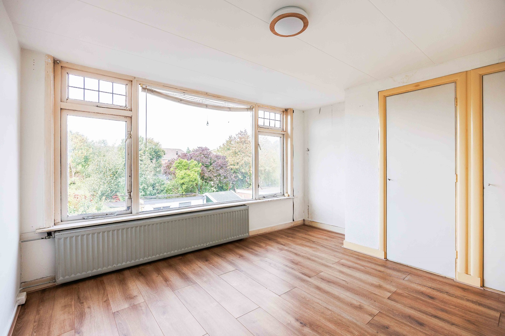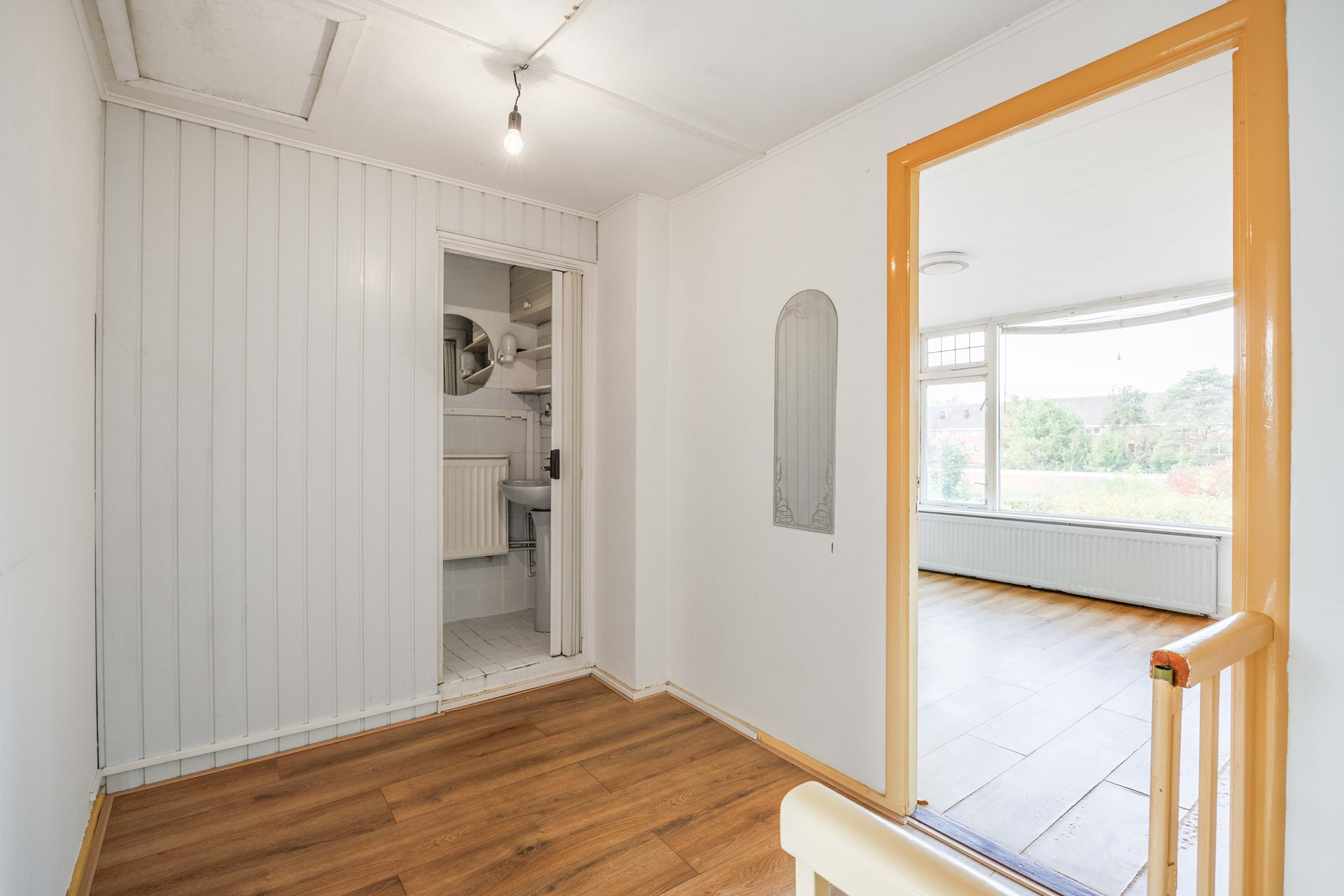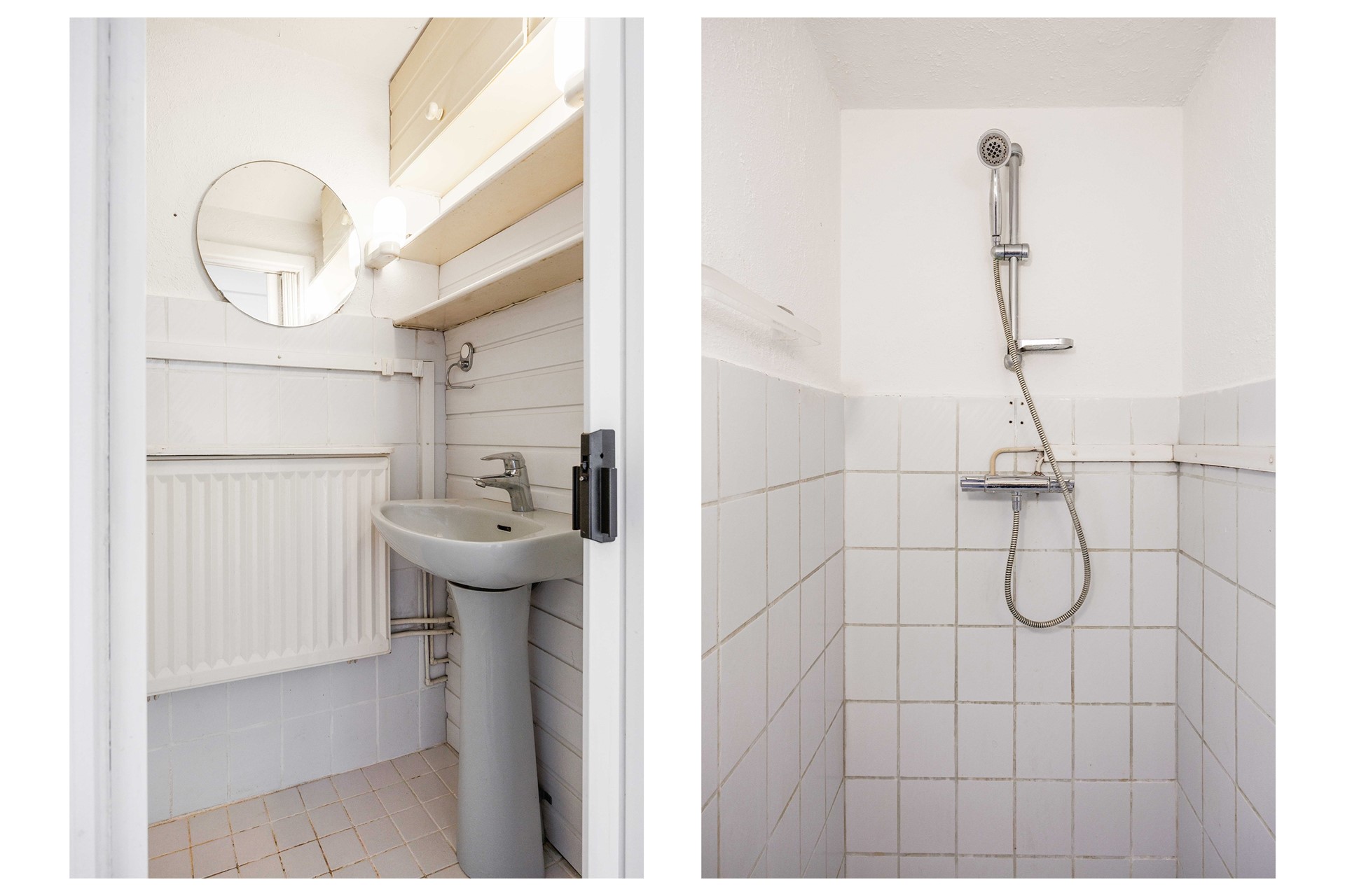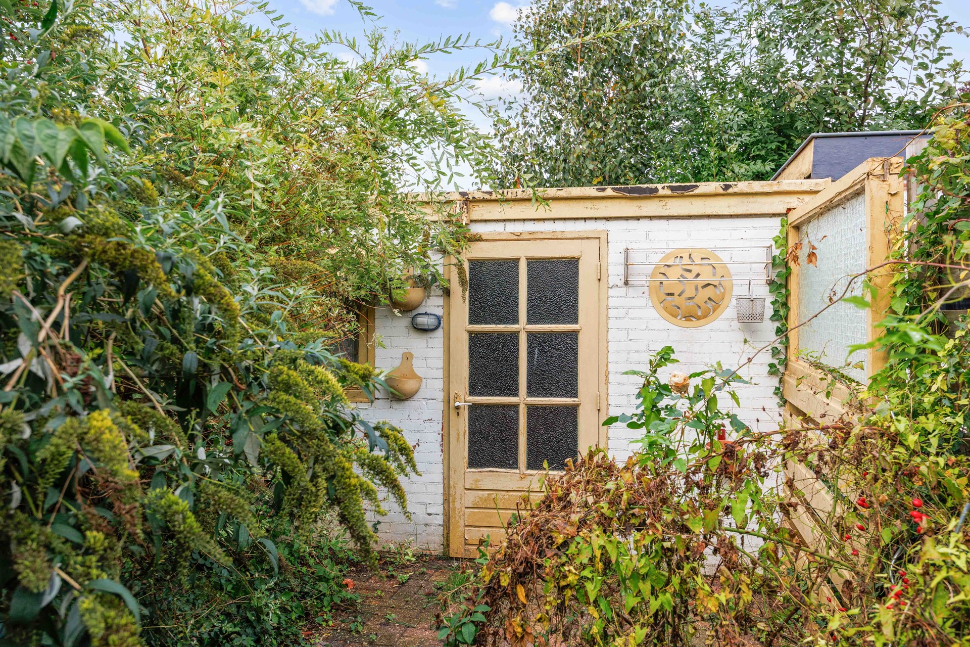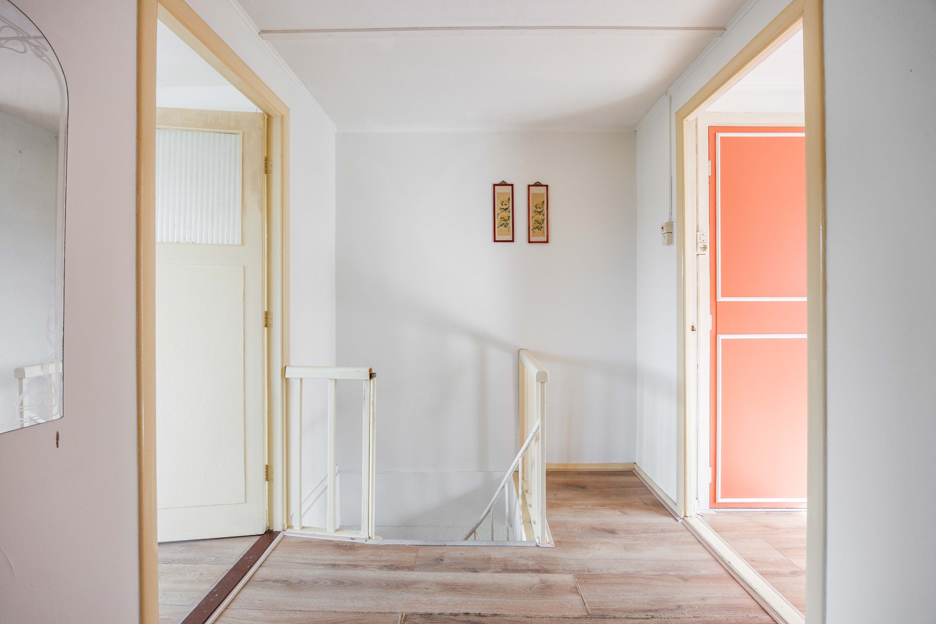 De trap in de woonkamer leidt naar de eerste verdieping, waar zich een ruime hal, twee slaapkamers (ca. 13 m² en 12,3 m²) met beide handige inbouwkasten en de badkamer bevinden. Dankzij de brede dakkapel op de voorkant is er op deze verdieping extra ruimte ontstaan. Ook op de achterkant van de woning is een plat dak en dus geen schuine wanden. Achterin de tuin staat een schuur (ca. 9,5 m²), ideaal als berging of voor het uitoefenen van een hobby.