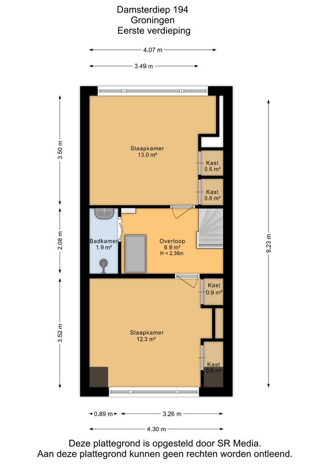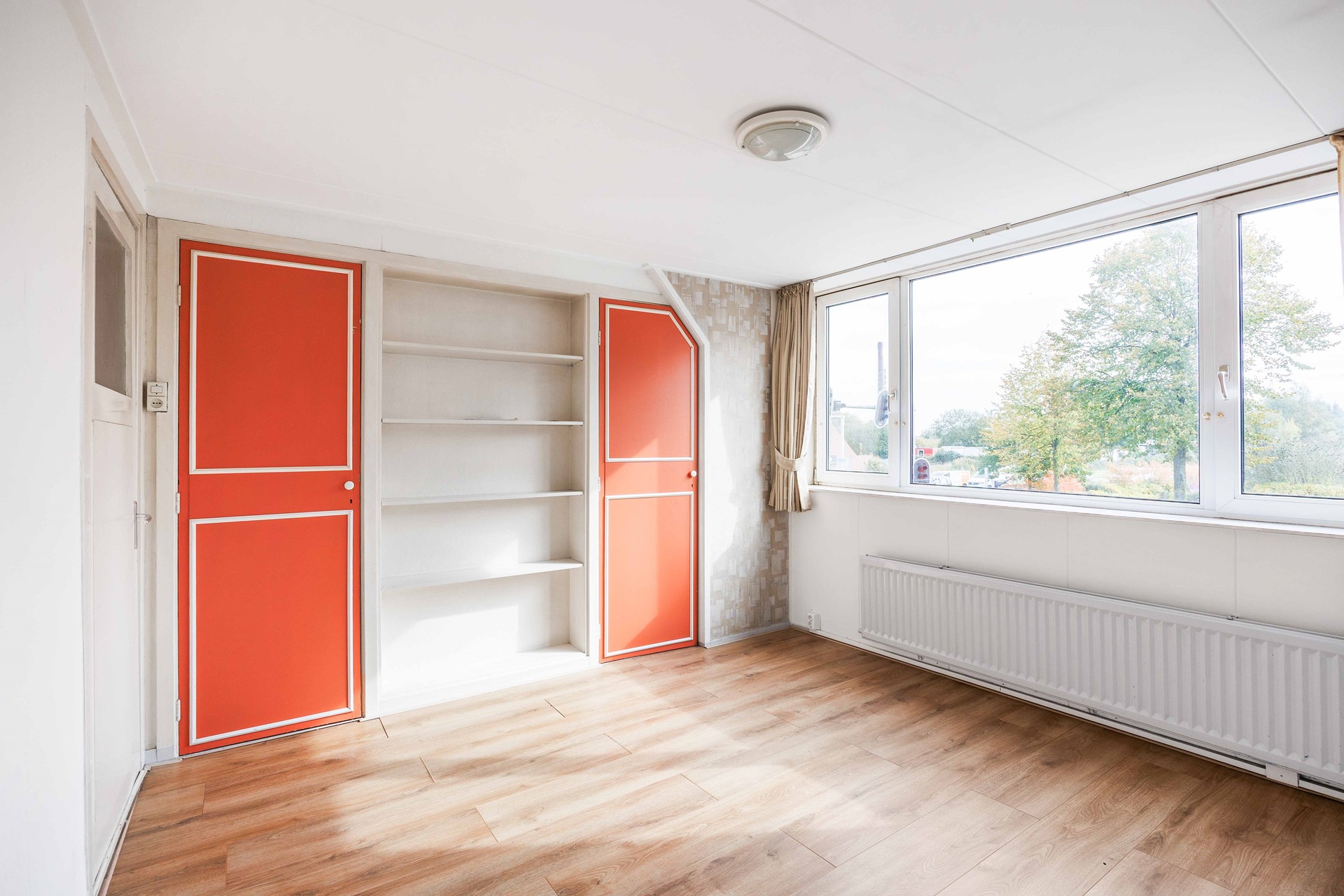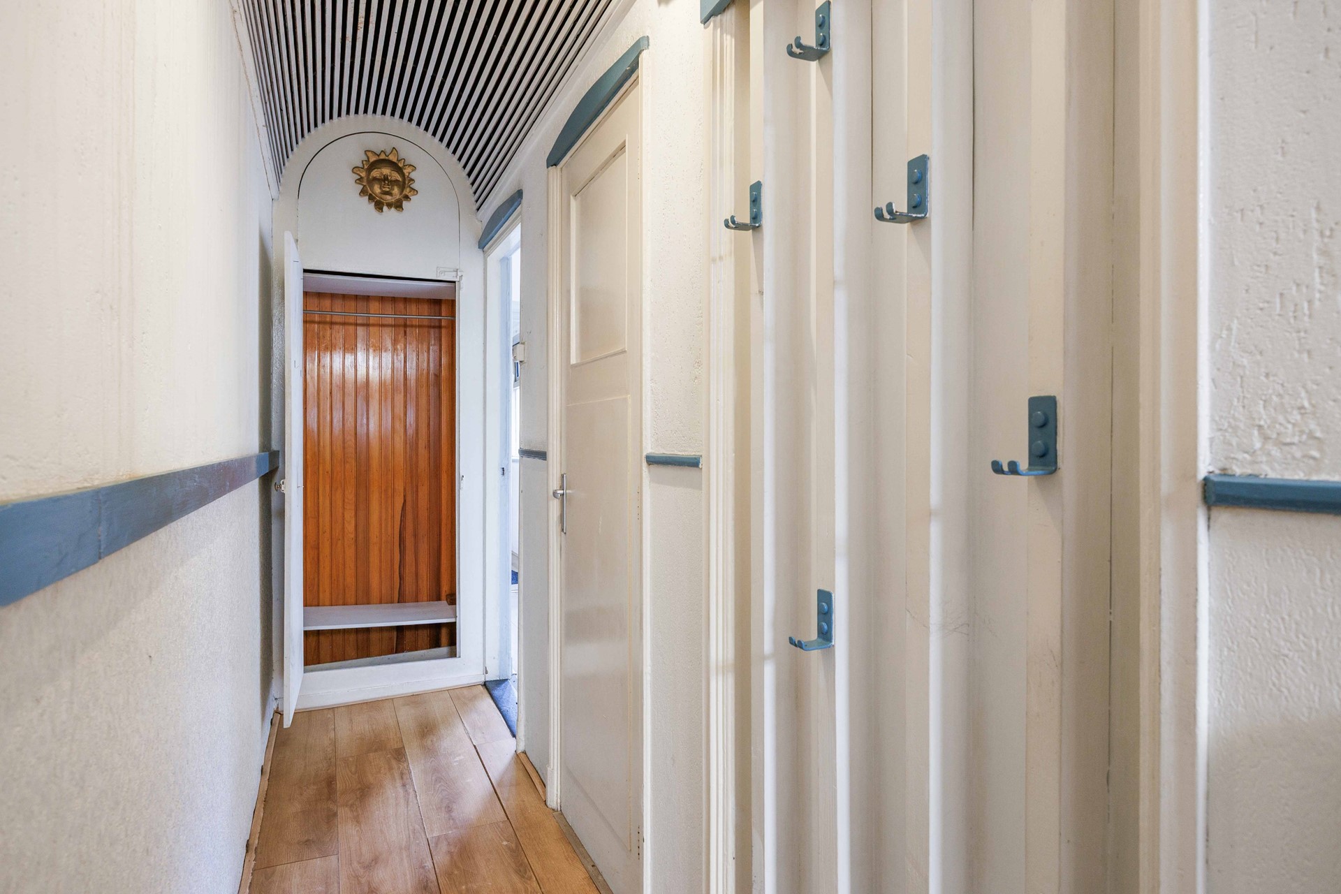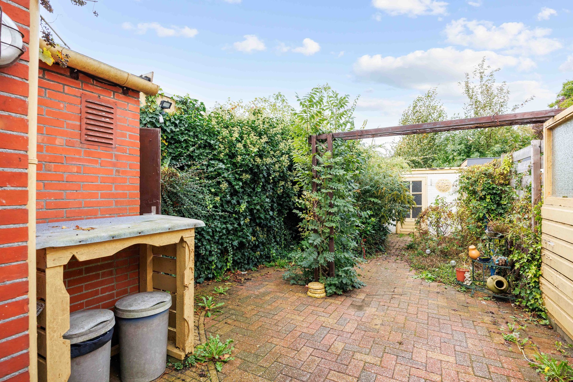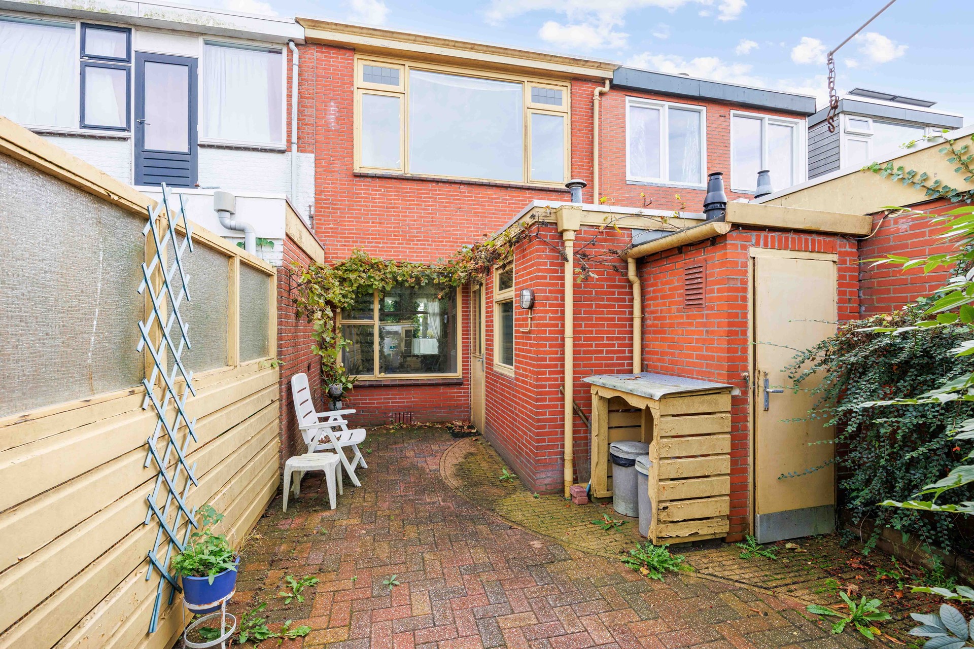 De trap in de woonkamer leidt naar de eerste verdieping, waar zich een ruime hal, twee slaapkamers (ca. 13 m² en 12,3 m²) met beide handige inbouwkasten en de badkamer bevinden. Dankzij de brede dakkapel op de voorkant is er op deze verdieping extra ruimte ontstaan. Ook op de achterkant van de woning is een plat dak en dus geen schuine wanden. Achterin de tuin staat een schuur (ca. 9,5 m²), ideaal als berging of voor het uitoefenen van een hobby.