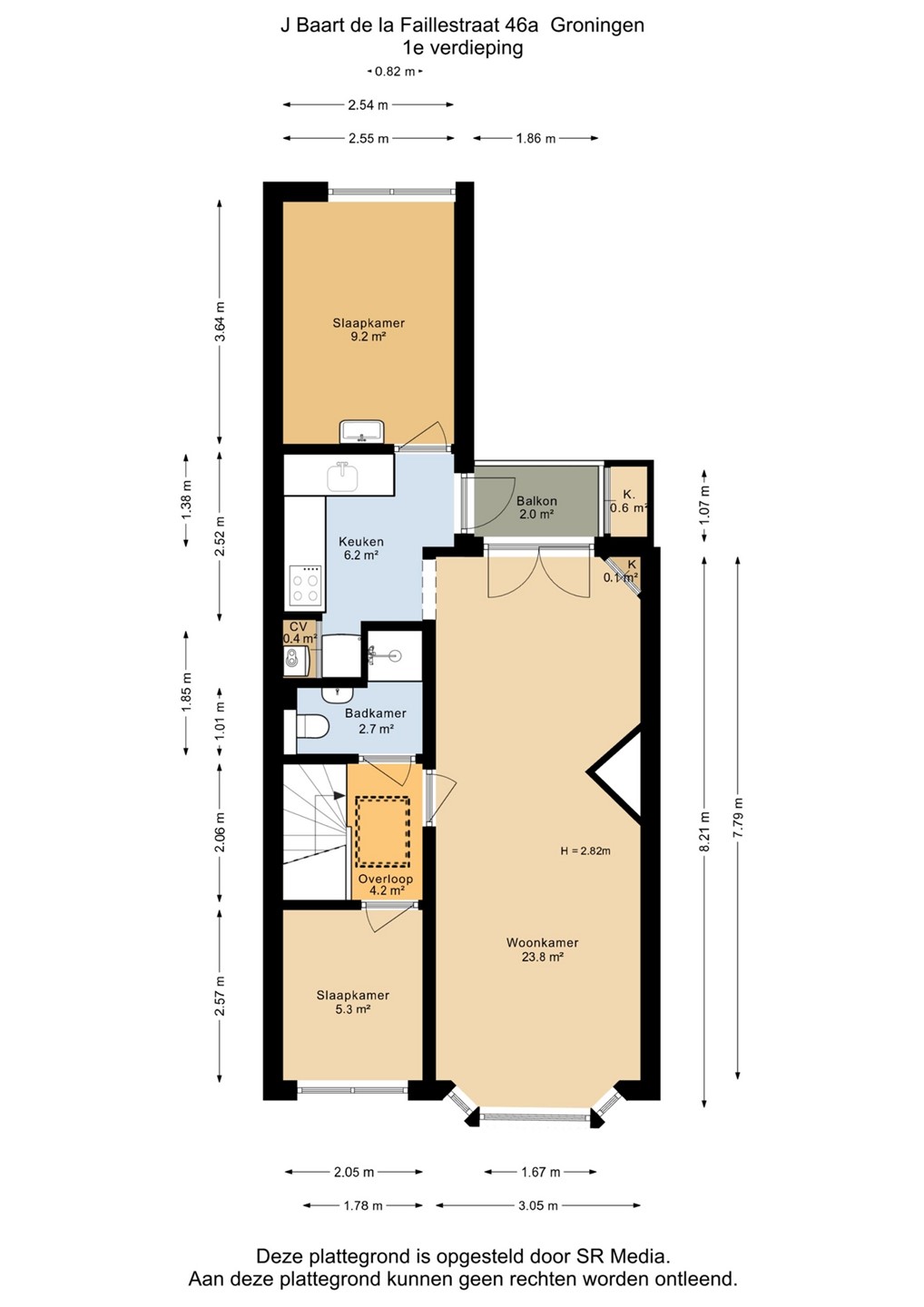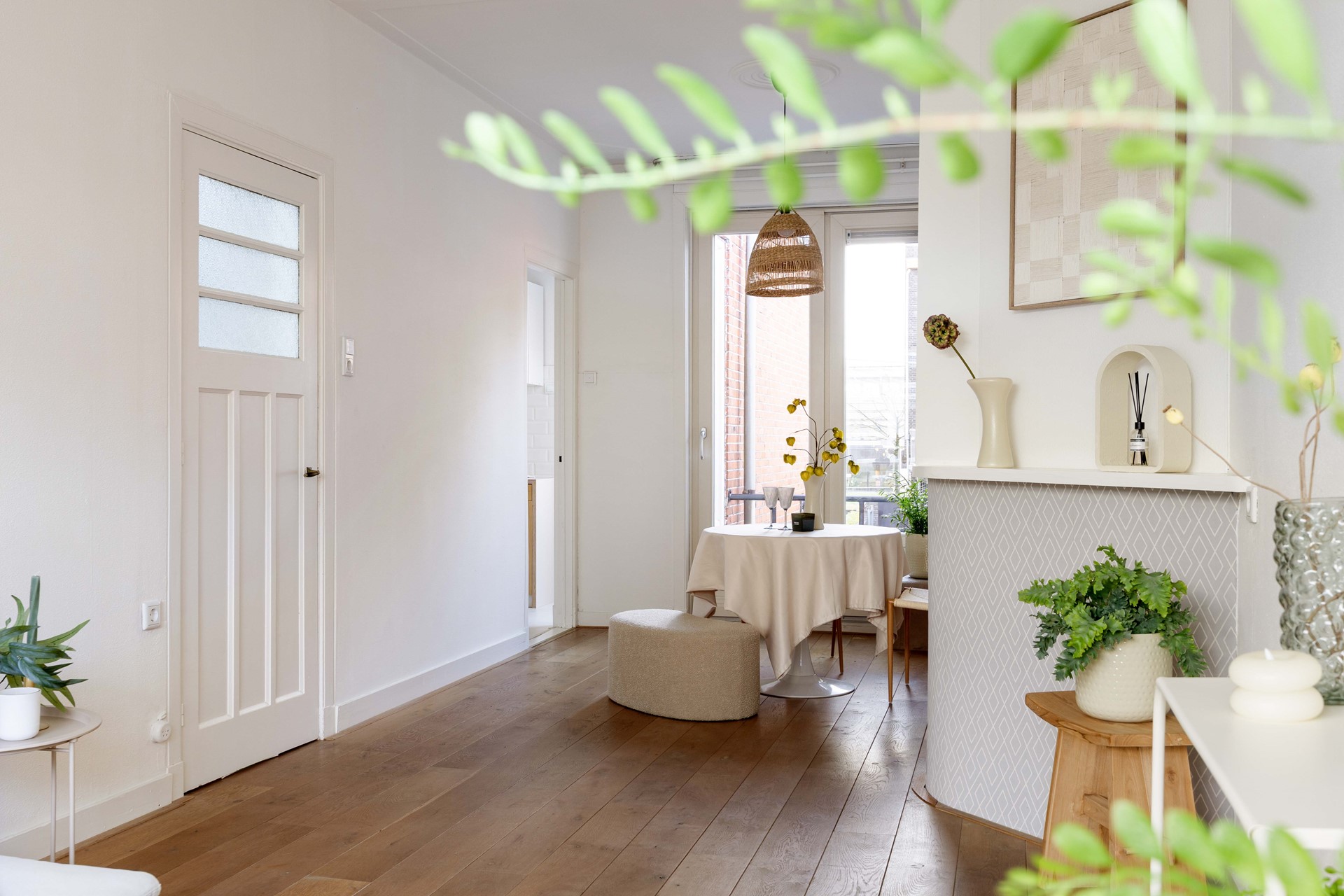 Via de trap kom je op de eerste verdieping, waar het appartement zich bevindt. Vanuit de hal heb je toegang tot de woonkamer, badkamer en de eerste slaapkamer.