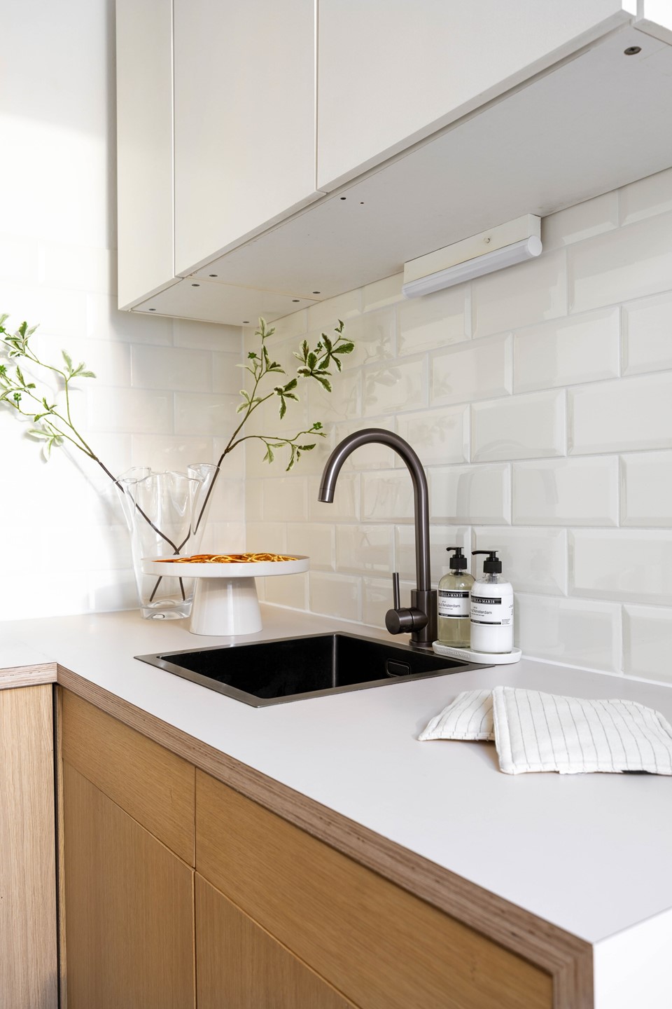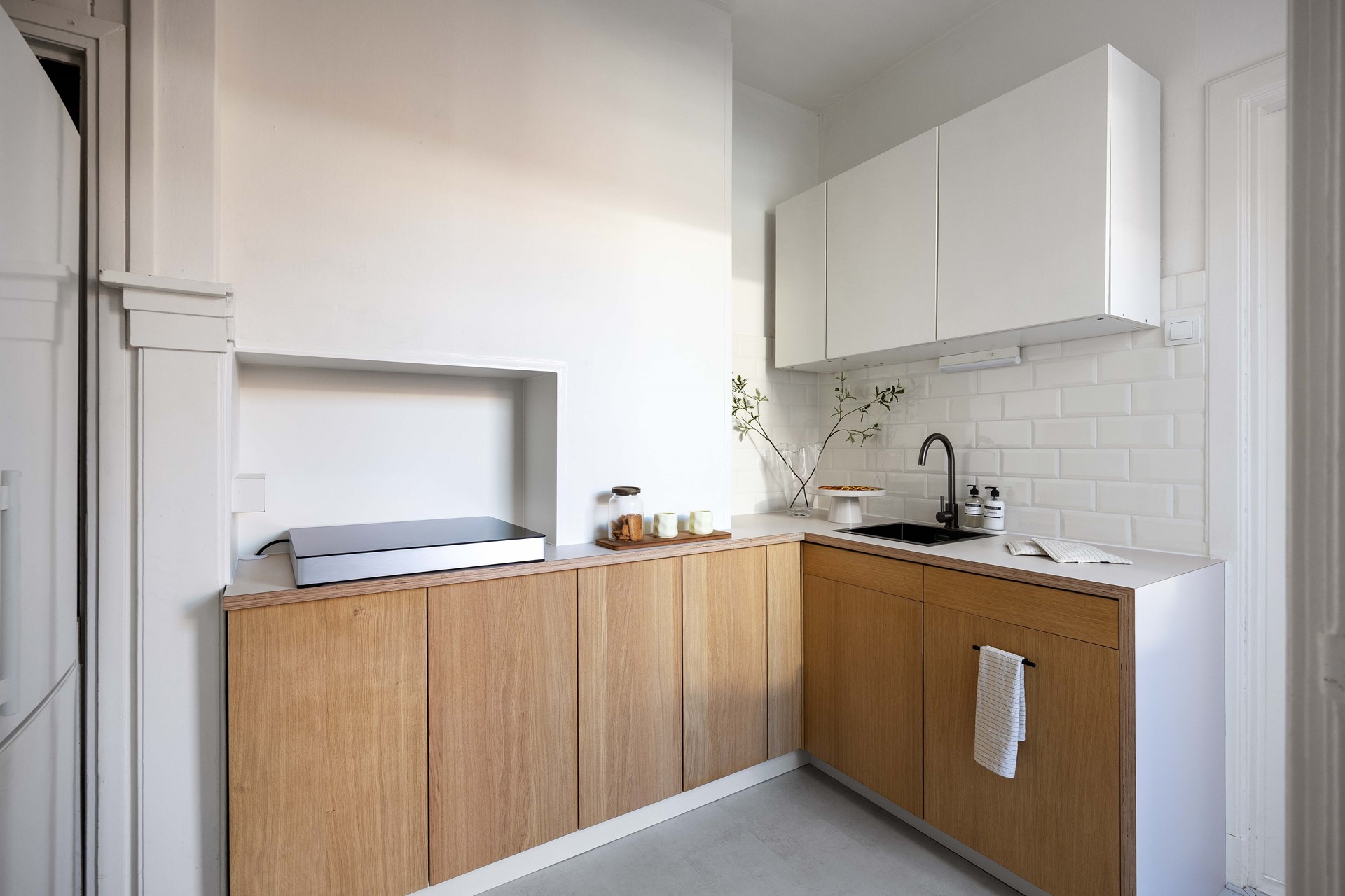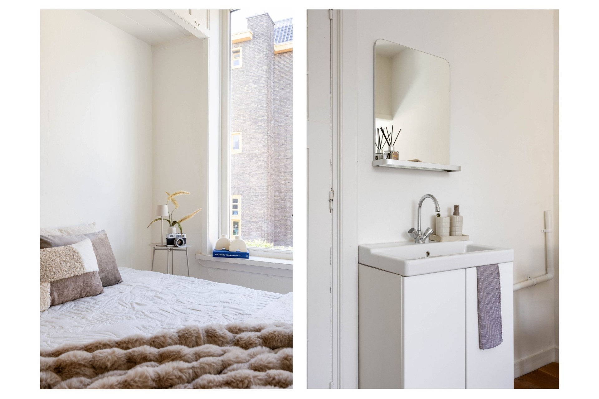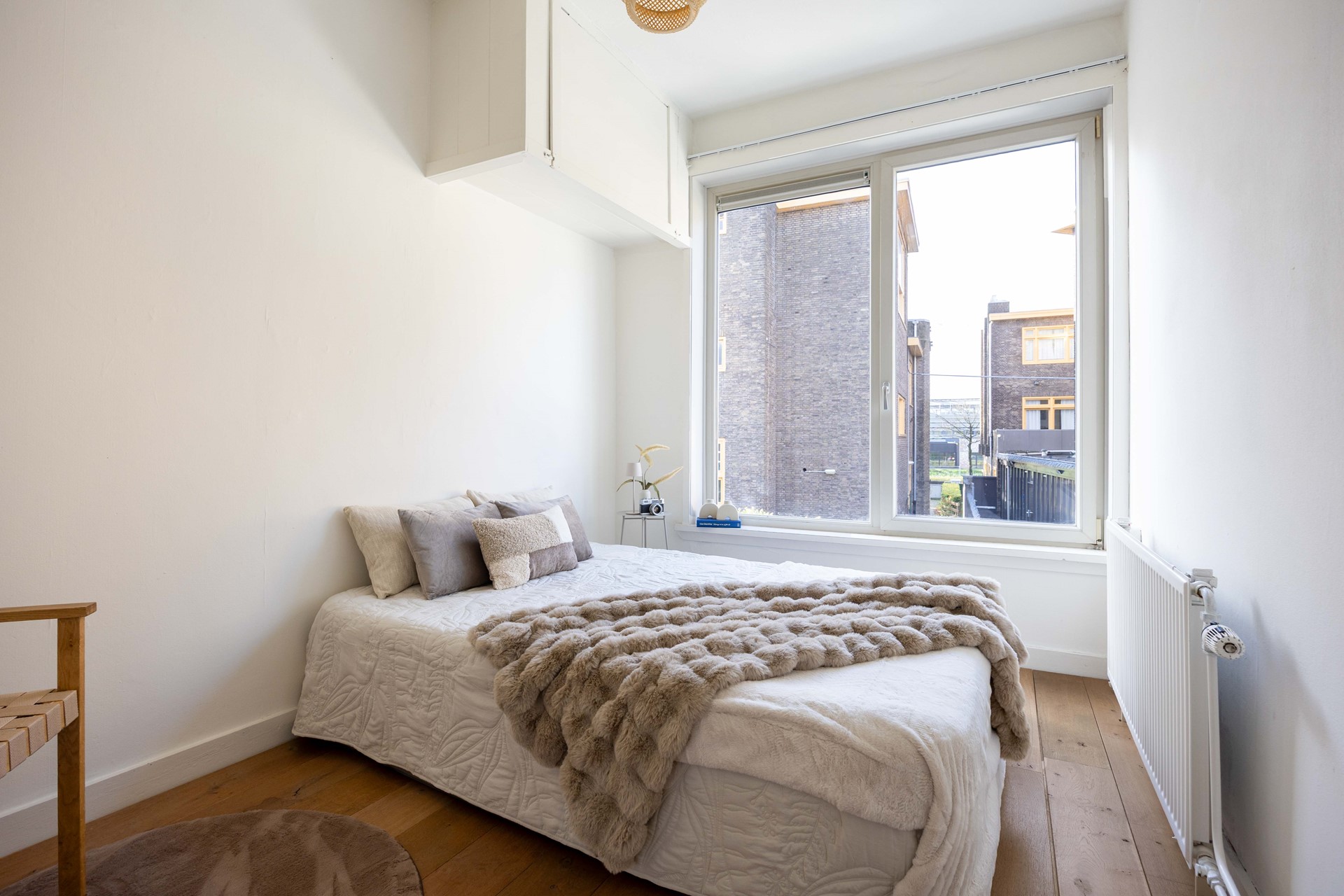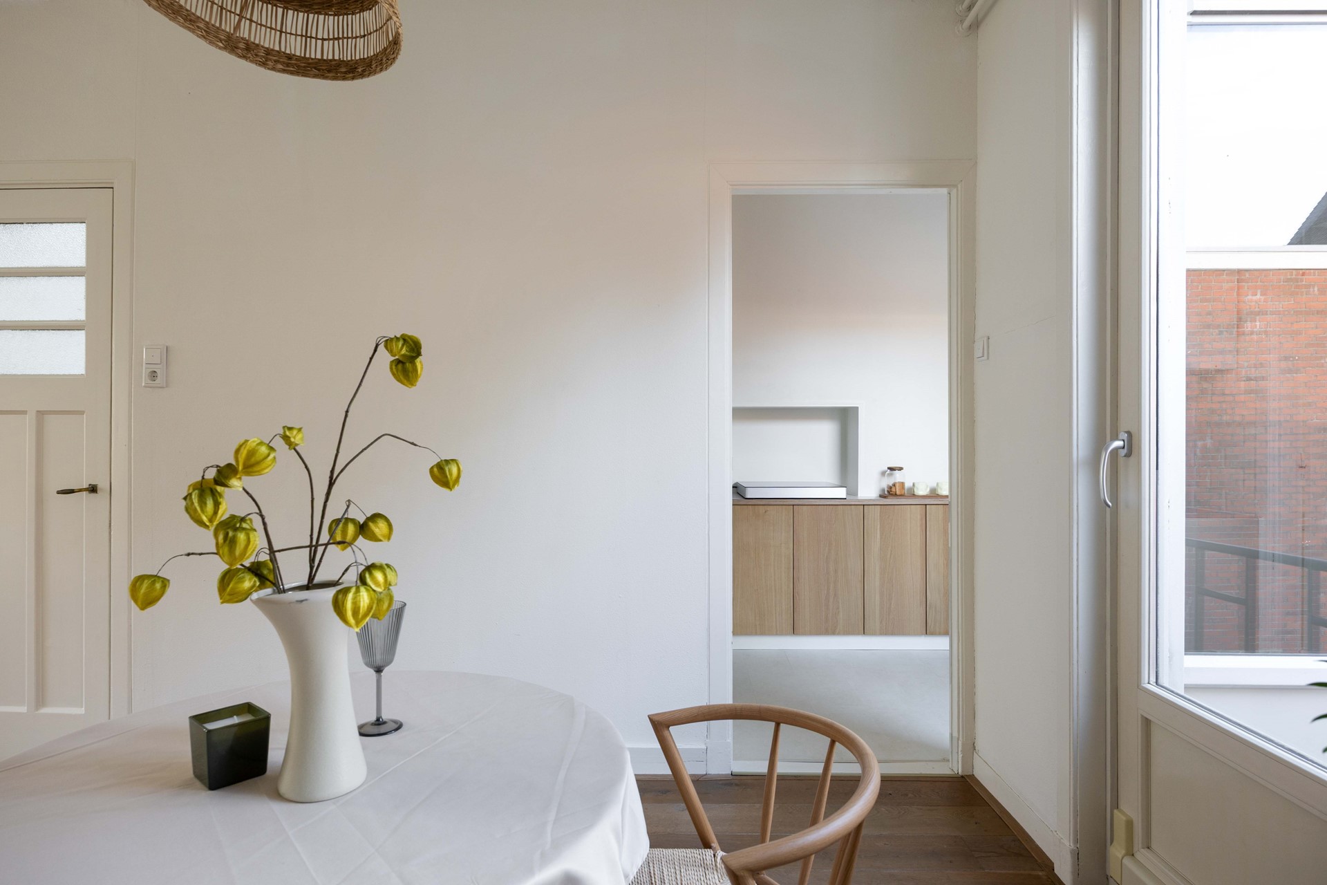 De keuken grenst aan de woon- en eetkamer, is ongeveer 6 m² groot en in 2025 deels vernieuwd. Vanuit hier bereik je de tweede slaapkamer (circa 9 m²), voorzien van een wastafel en grote ramen waardoor het licht volop naar binnen valt.