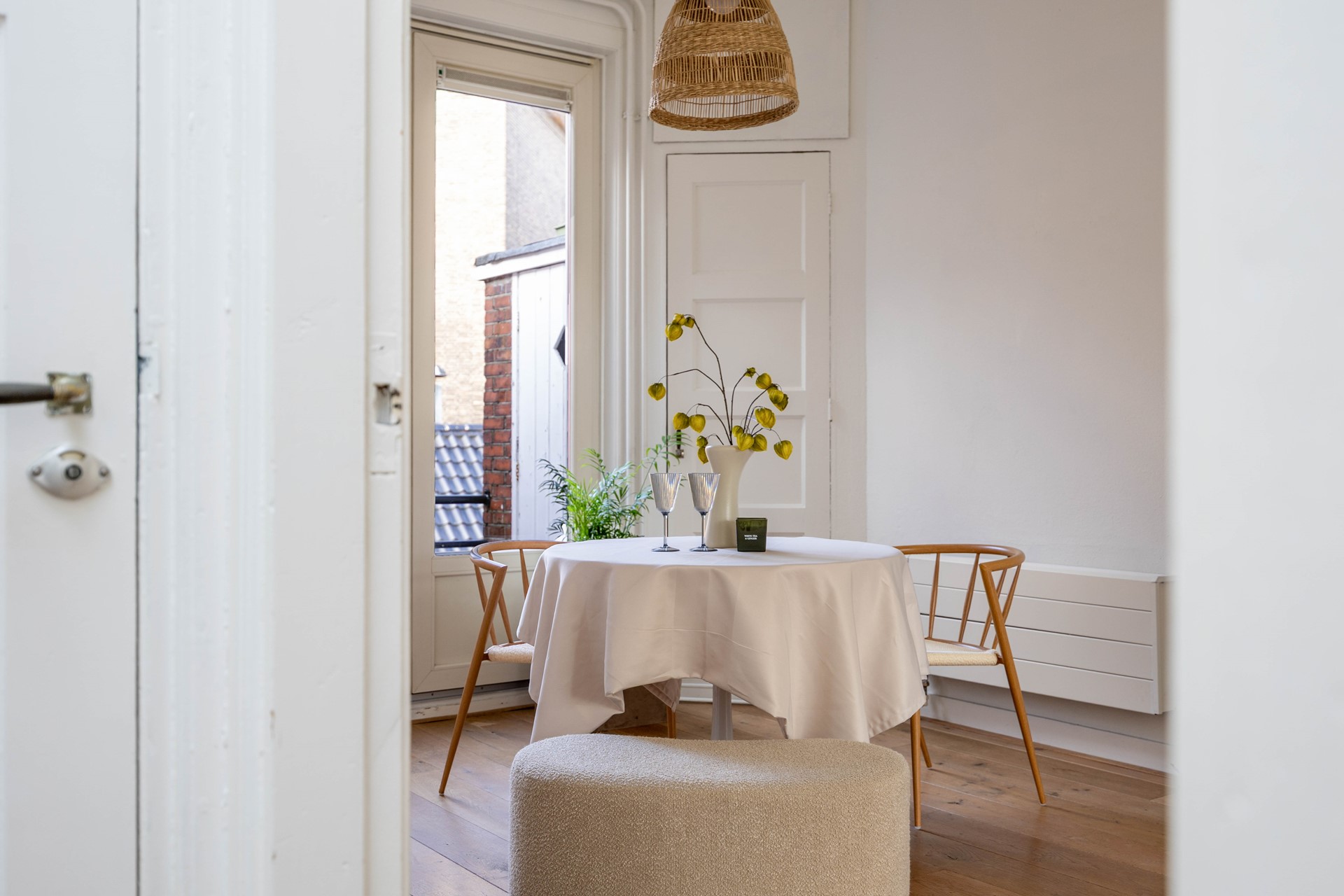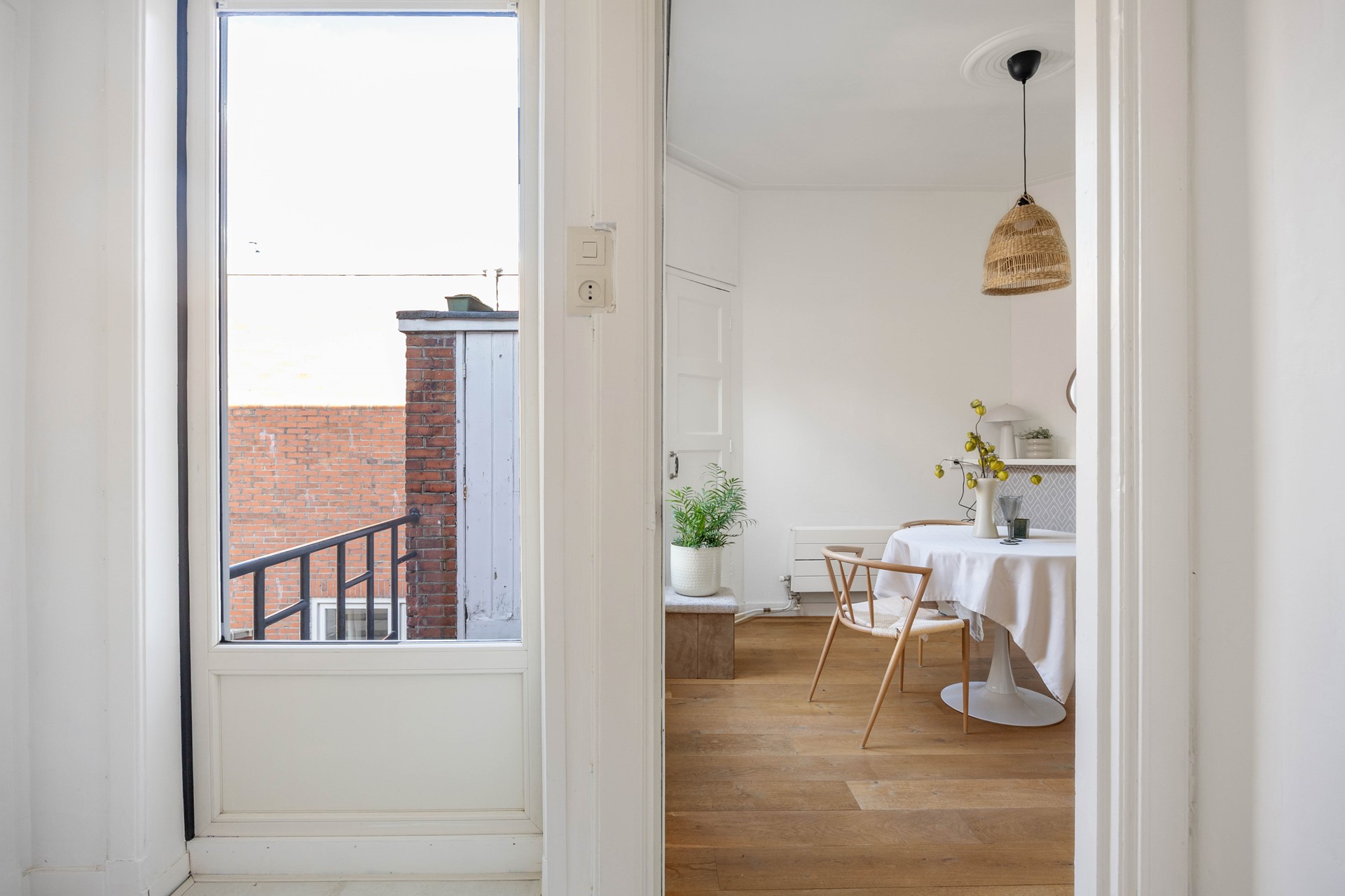 De woonkamer is een lichte ruimte van zo’n 24 m², met genoeg plek voor een ruime bank én een gezellige eethoek. Door de schuifdeur stap je zo het balkon op. Heerlijk om in de zomer de schuifdeur open te gooien en het buitengevoel naar binnen te halen.