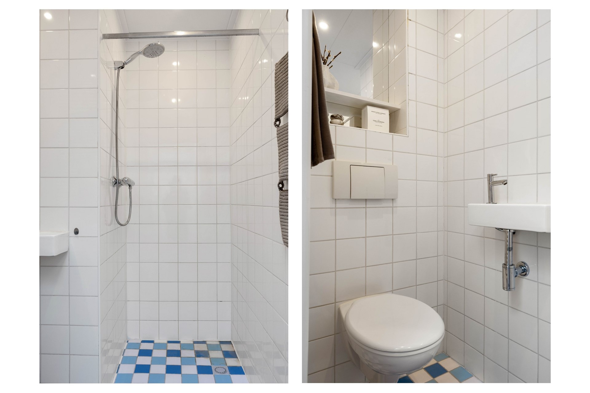 De badkamer (ongeveer 3 m²) is compact maar compleet, met een douche, toilet en wastafelmeubel.