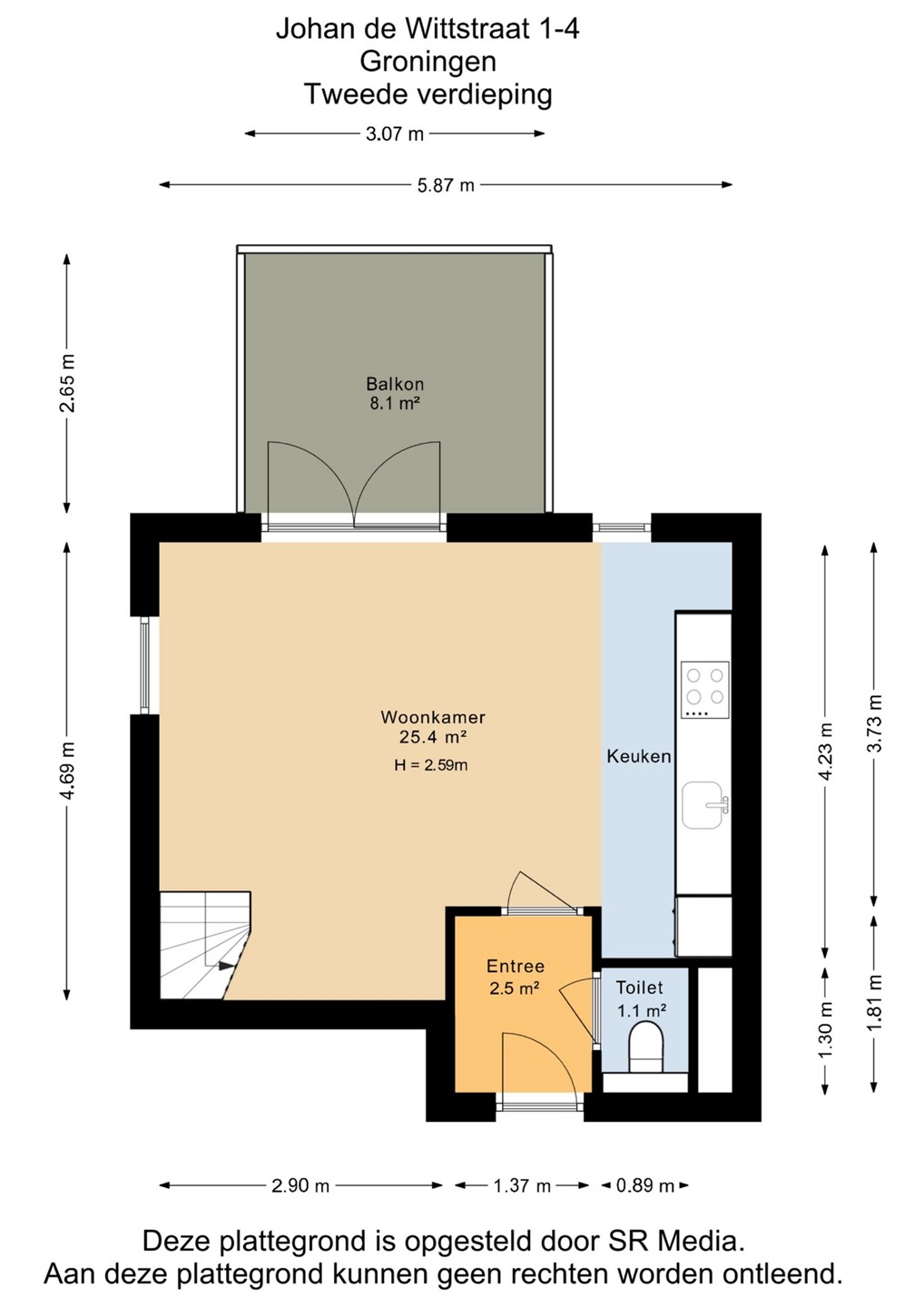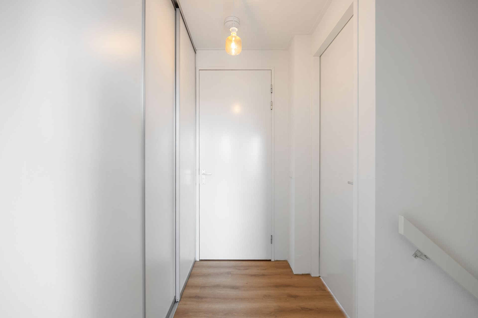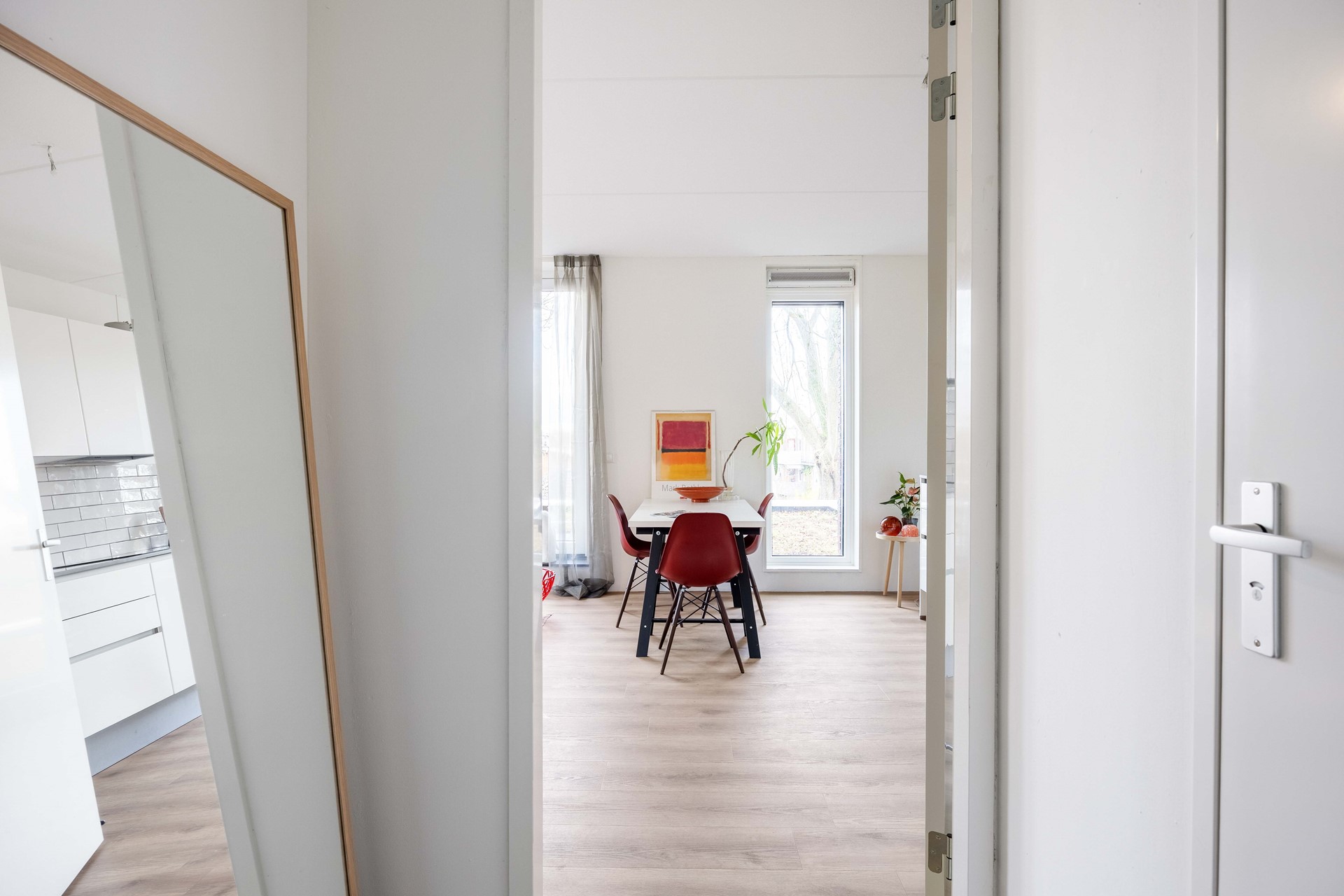 Het appartement ligt op de tweede verdieping van het complex. Via de centrale hal en het trappenhuis kom je bij de voordeur. Binnen in de hal vind je direct rechts het toilet en recht vooruit stap je de lichte woonkamer met open keuken in.