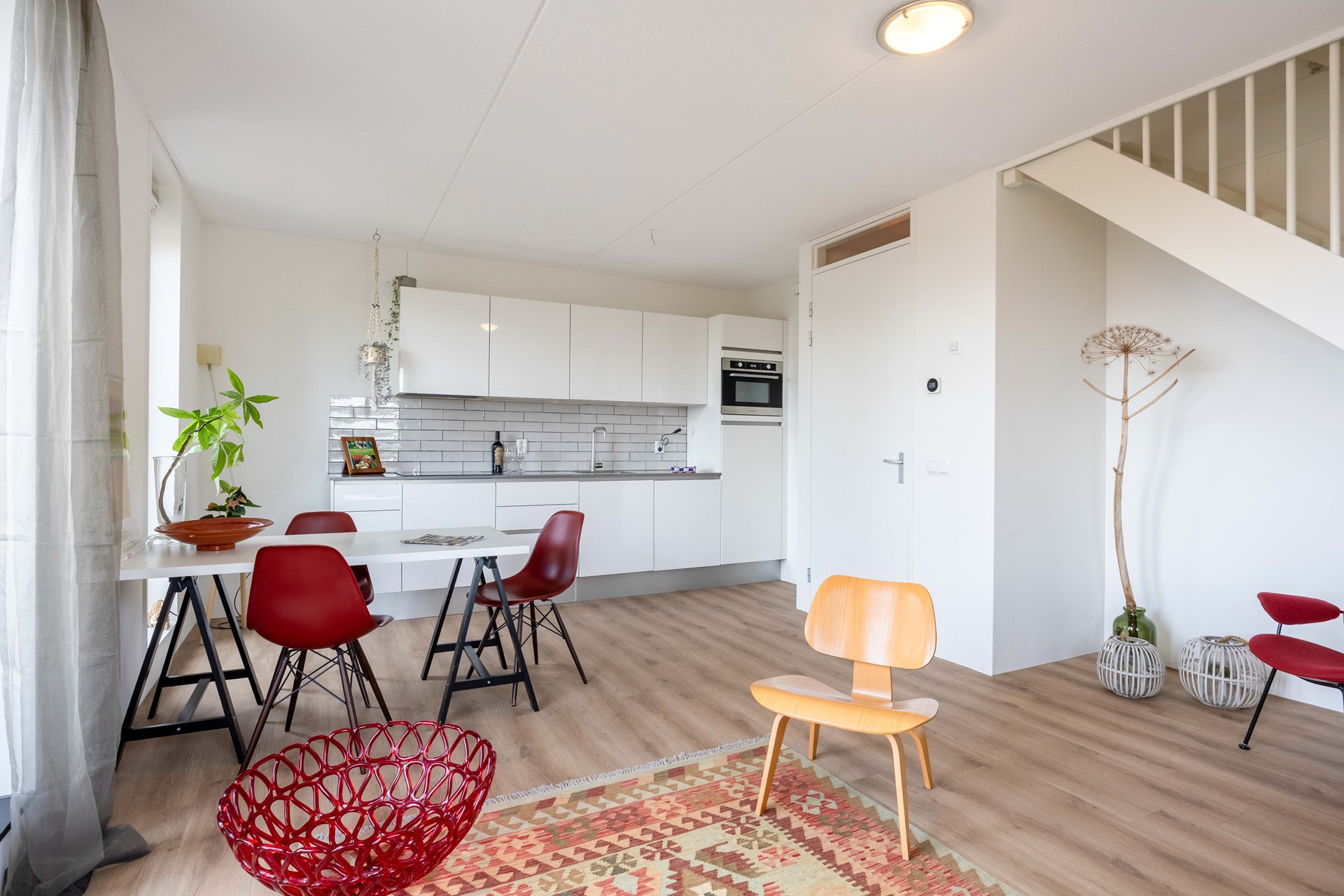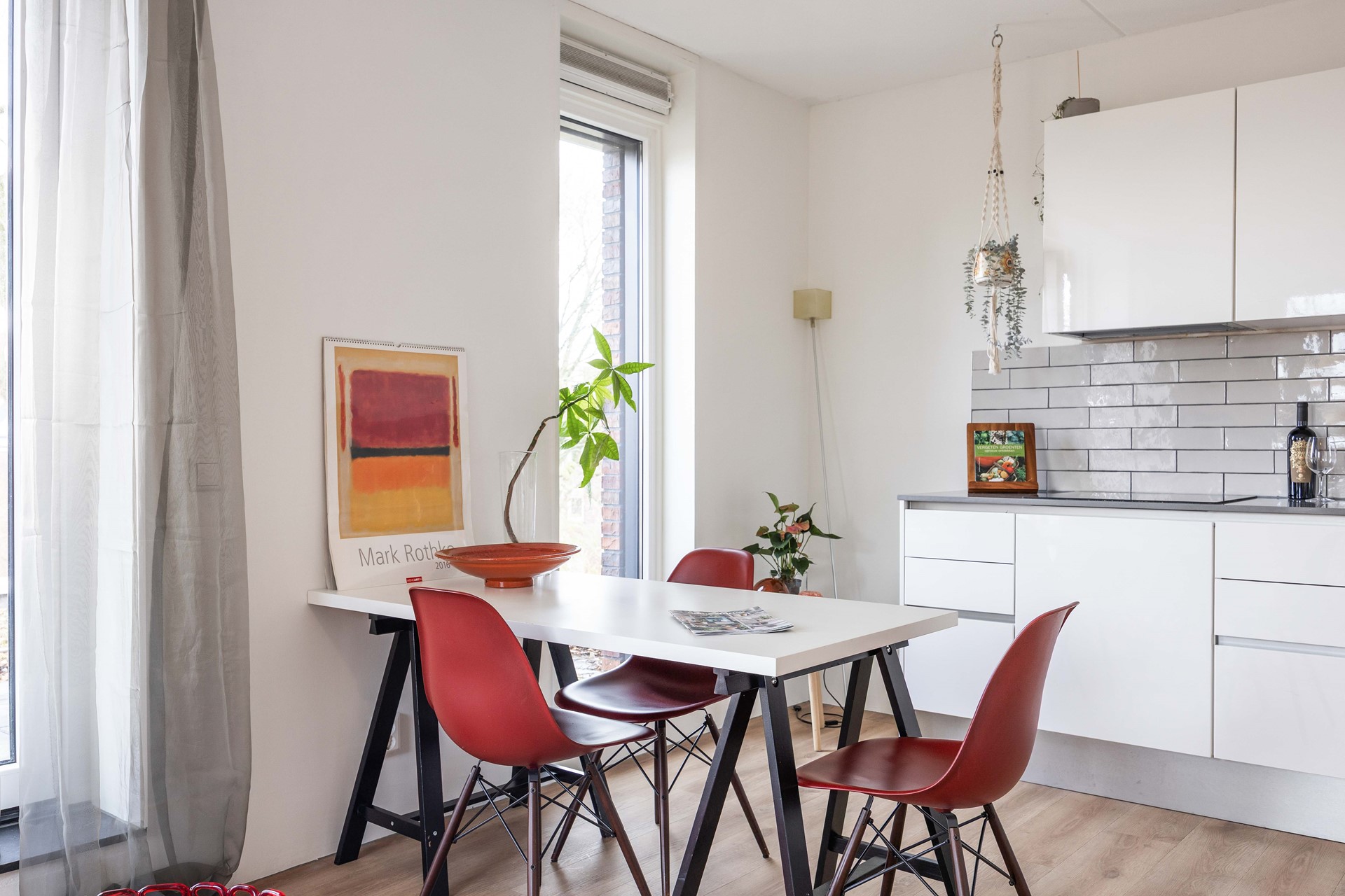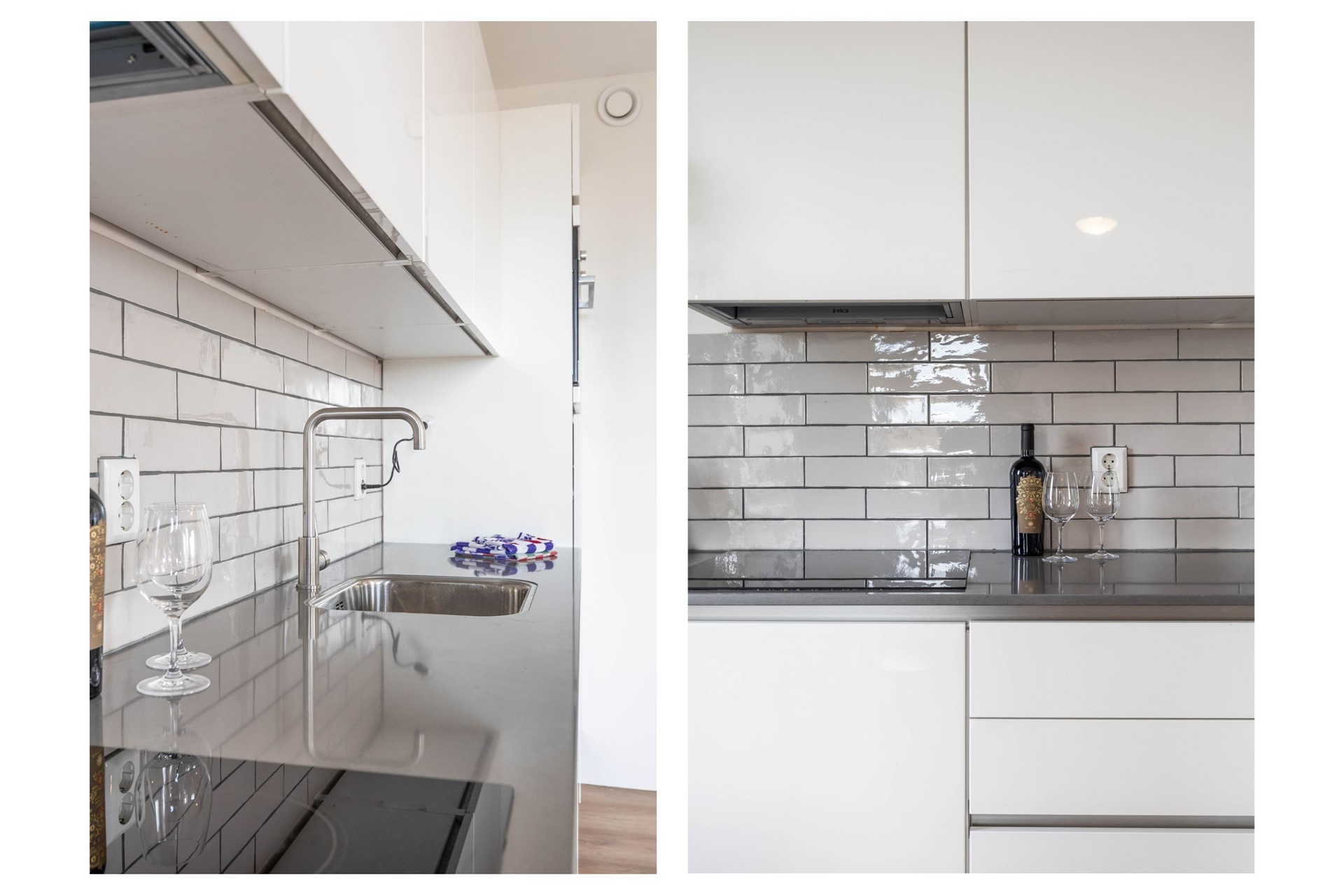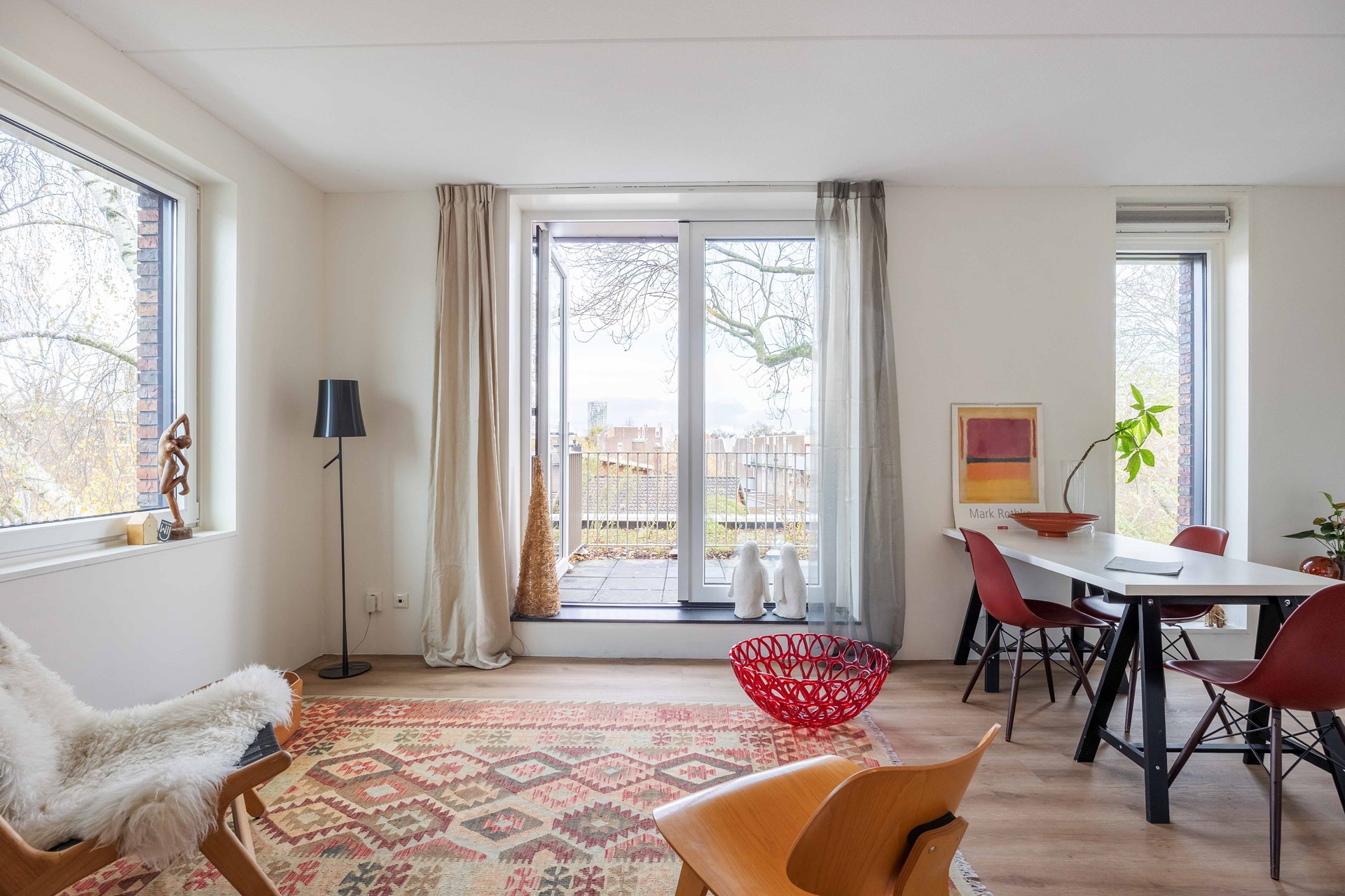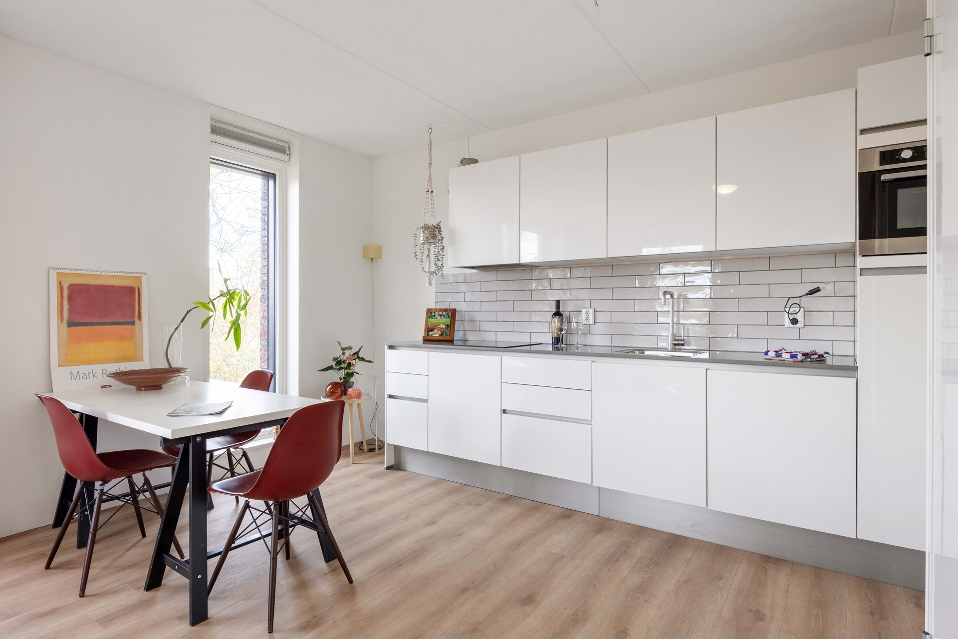 De woonkamer en keuken vormen samen een lichte ruimte van zo’n 25 m², met grote openslaande deuren naar het balkon van circa 8 m². Perfect voor een kop koffie in de ochtend of een gezellige borrel in de avond.