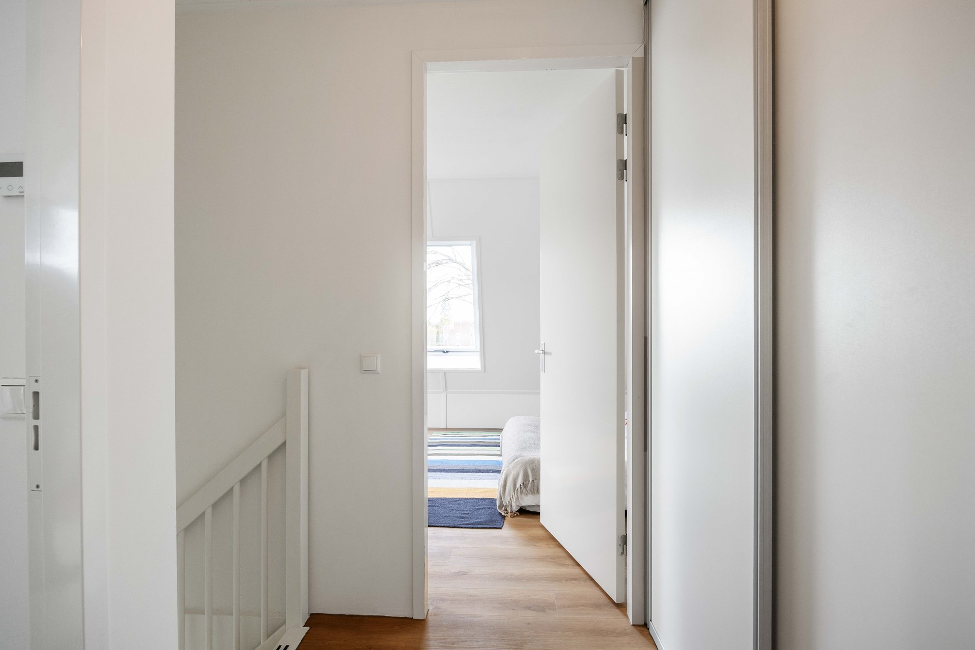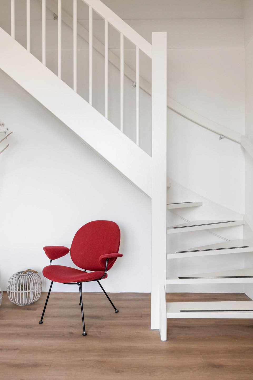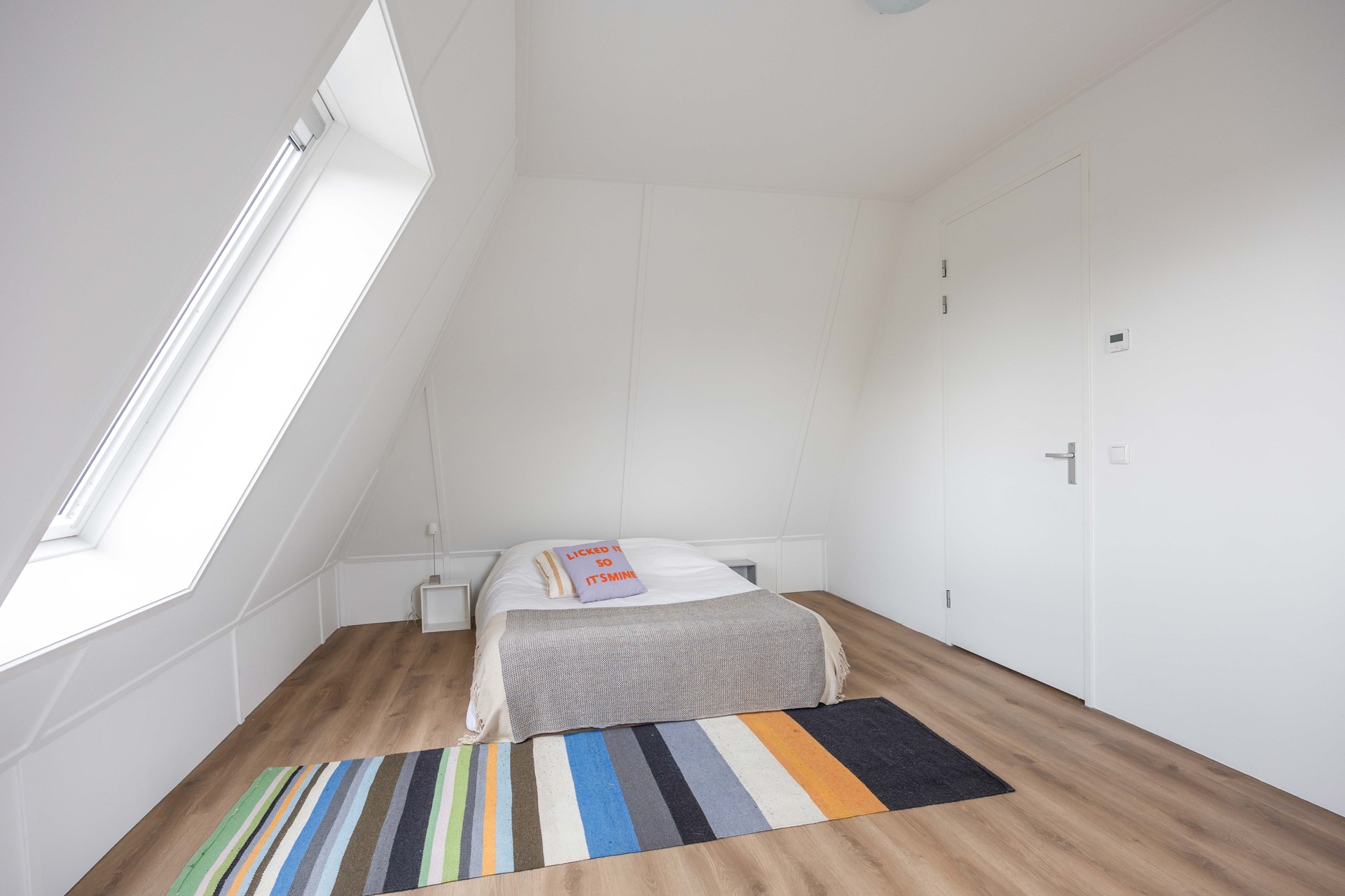 In de woonkamer leidt een open trap naar de bovenverdieping. Hier bevinden zich twee slaapkamers (circa 14 m² en 8 m²), de badkamer met douche en wastafel, én een handige bergruimte met de warmtepomp en een aansluiting voor de wasmachine.