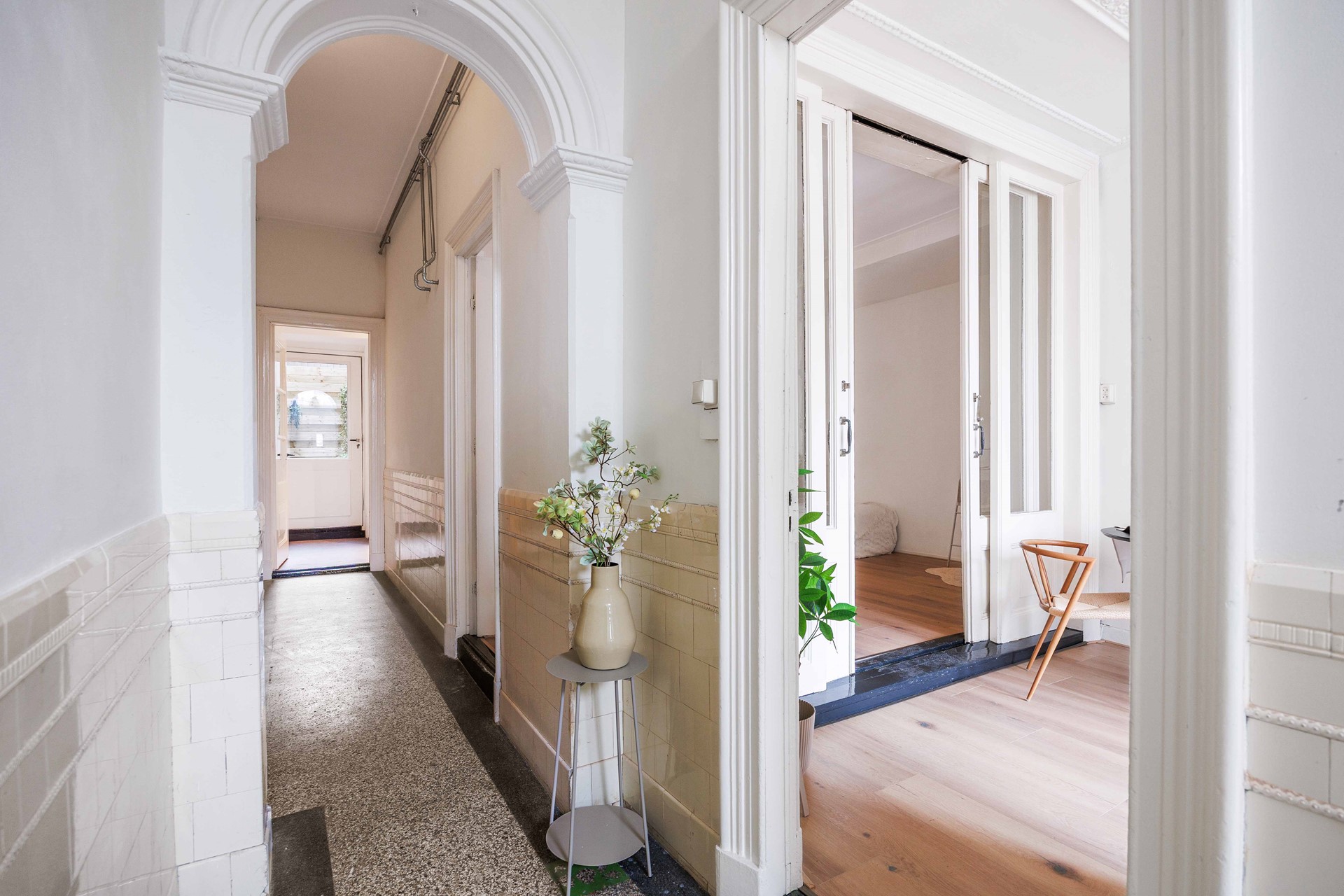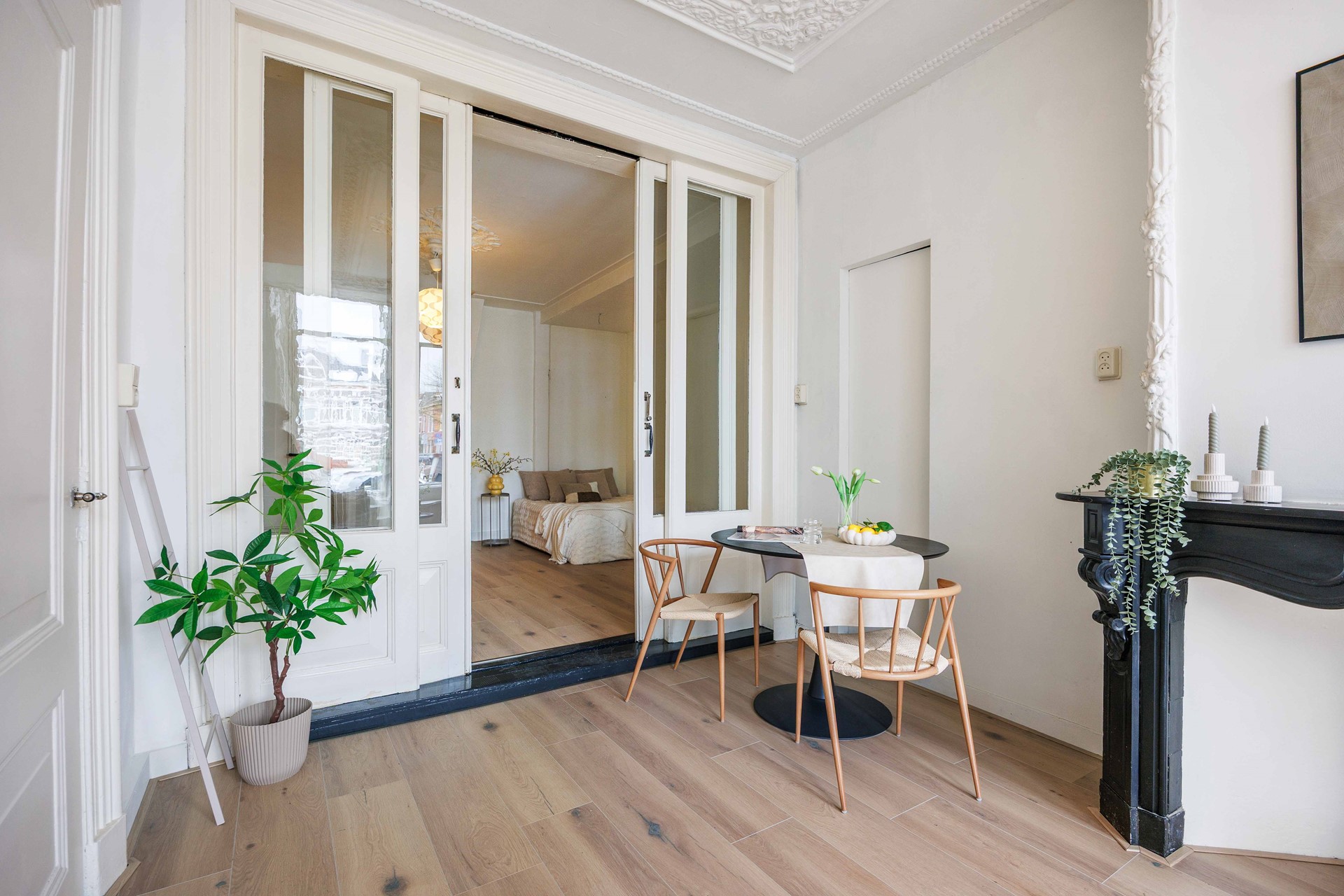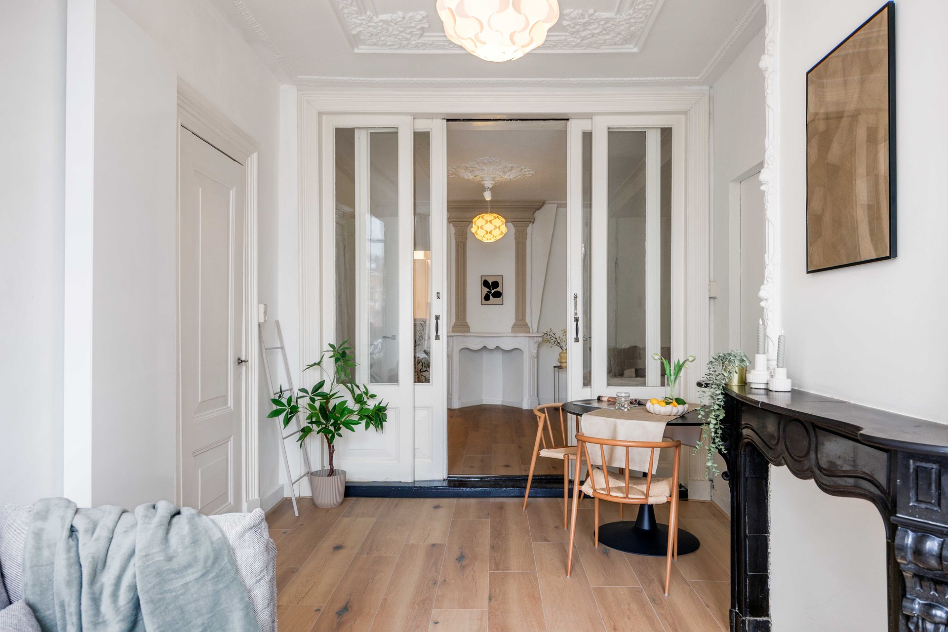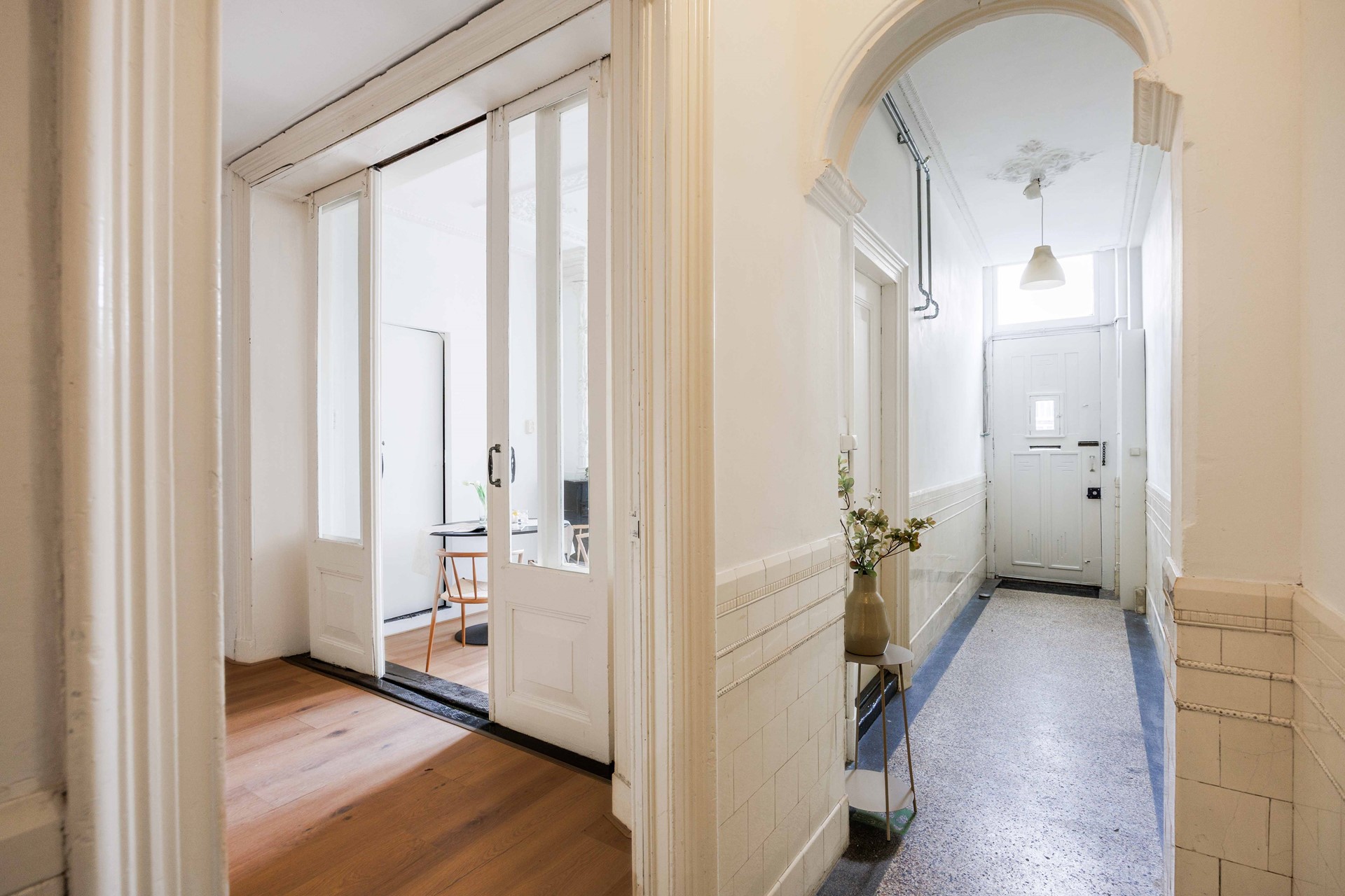 Bij binnenkomst kom je in een langgerekte hal. Aan de rechterzijde ligt de woonkamer (ca. 15 m²), een sfeervolle ruimte waar het karakter van het pand direct voelbaar is door de authentieke vensterbanken, een klassieke schouw en ensuite-deuren.