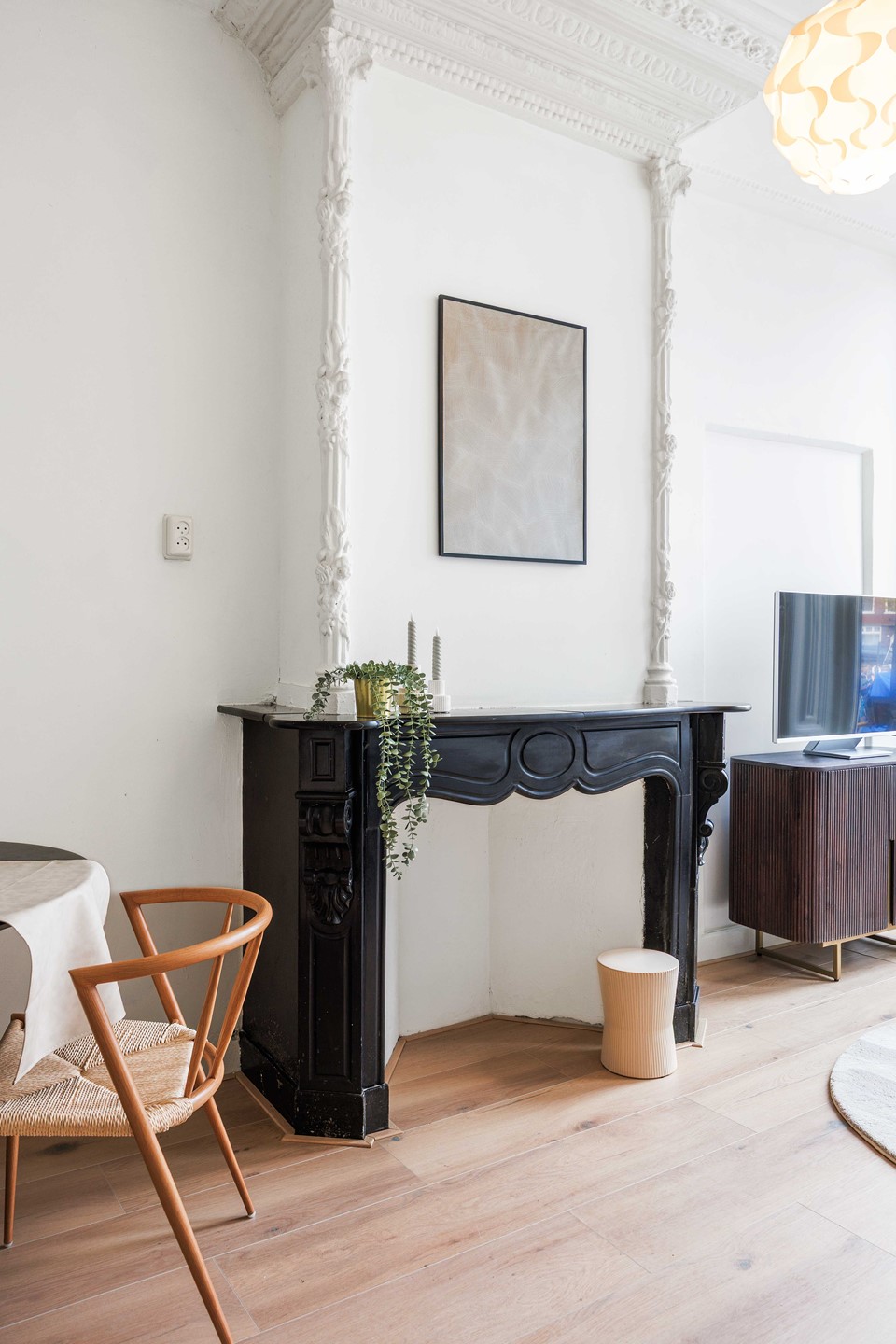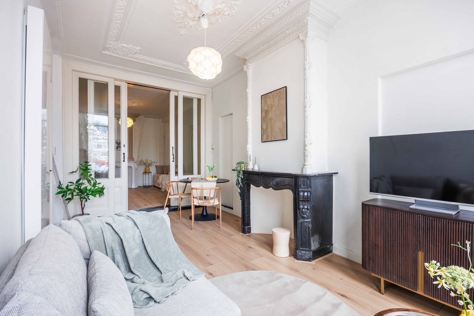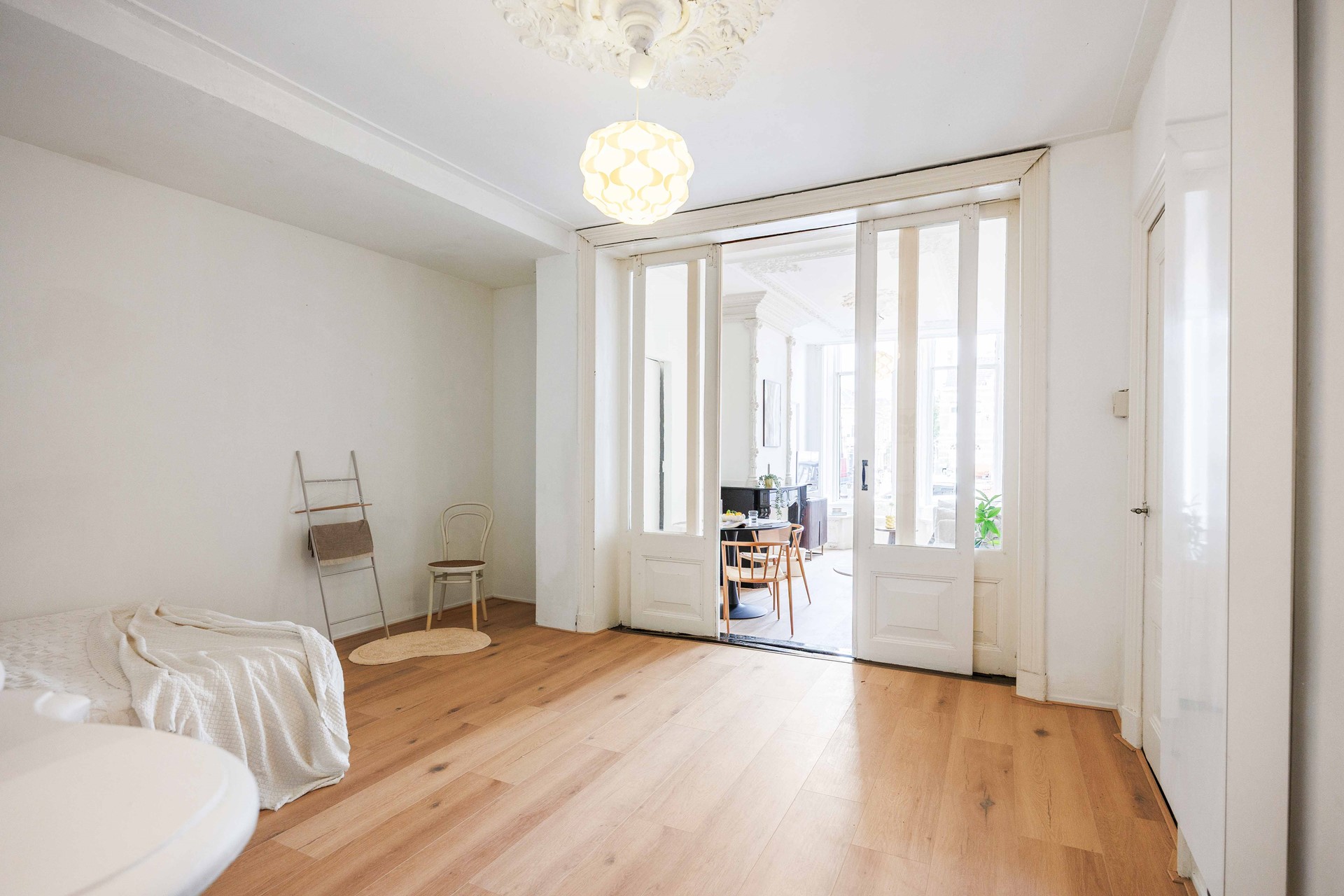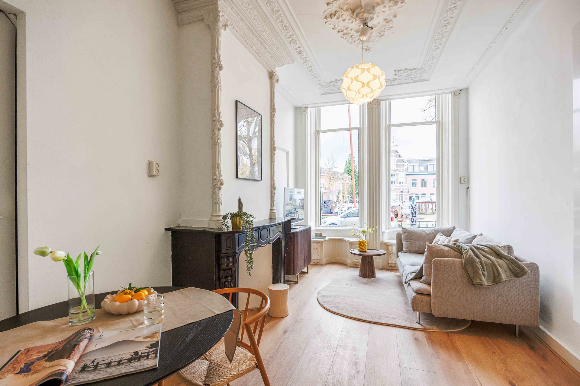 Bij binnenkomst kom je in een langgerekte hal. Aan de rechterzijde ligt de woonkamer (ca. 15 m²), een sfeervolle ruimte waar het karakter van het pand direct voelbaar is door de authentieke vensterbanken, een klassieke schouw en ensuite-deuren.