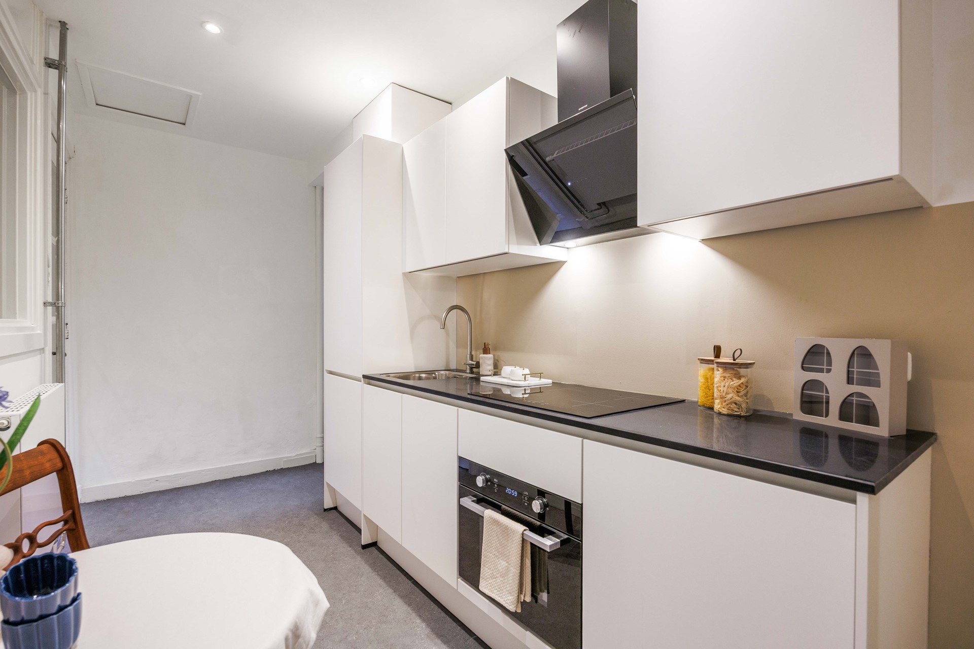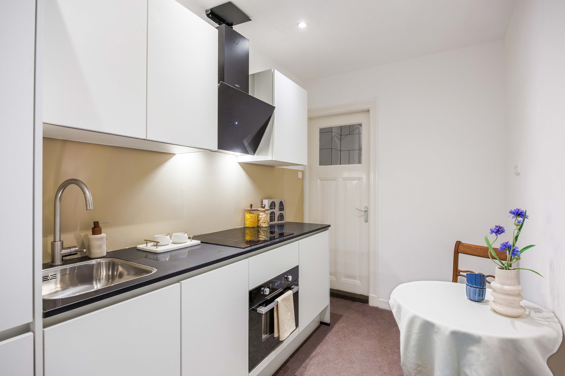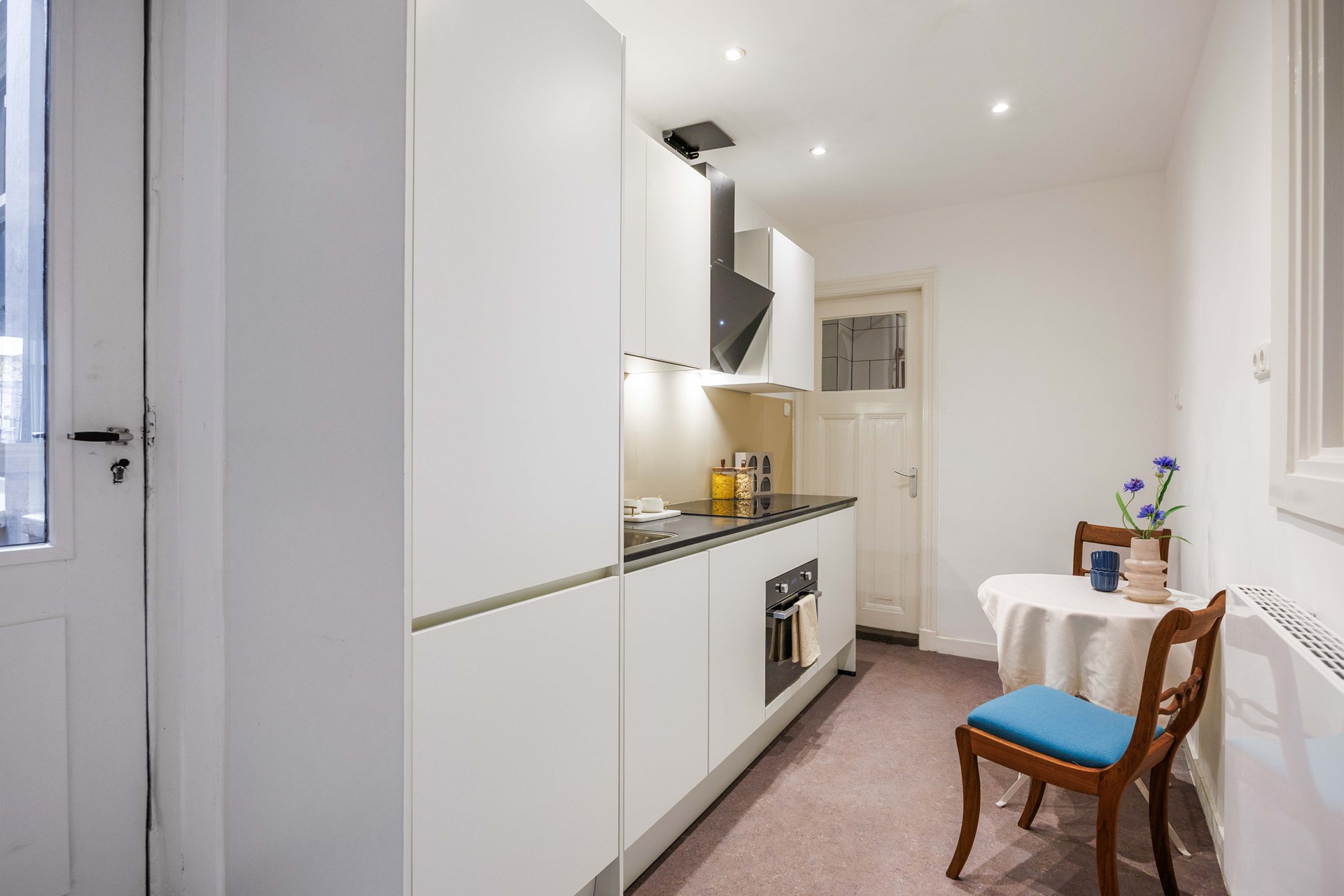 Aan de andere zijde van de hal vind je de keuken, die gemoderniseerd is en voorzien van de nodige inbouwapparatuur. Praktisch en stijlvol ingericht, met voldoende plek om comfortabel te koken. Aansluitend ligt de badkamer, voorzien van een douche en toilet.