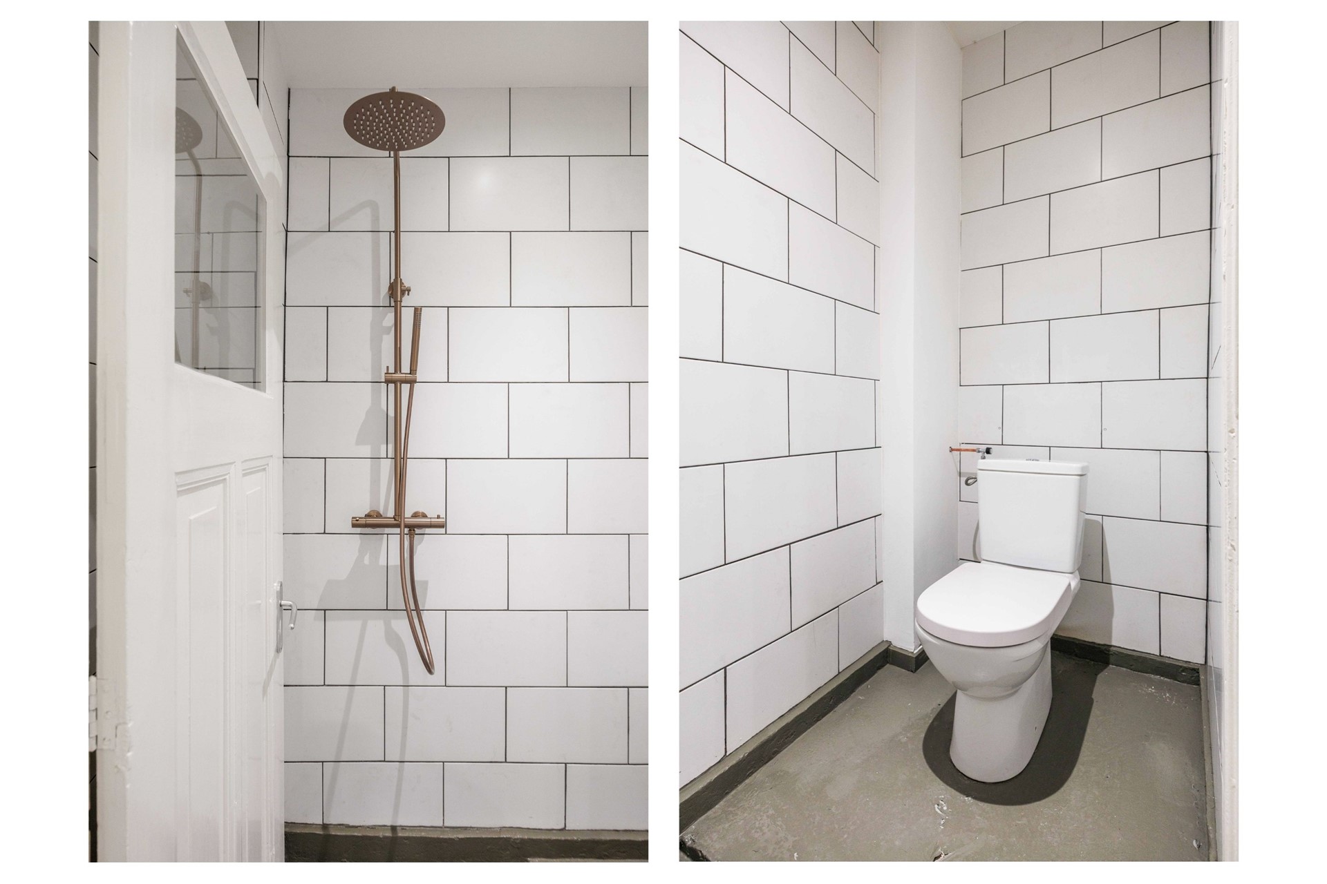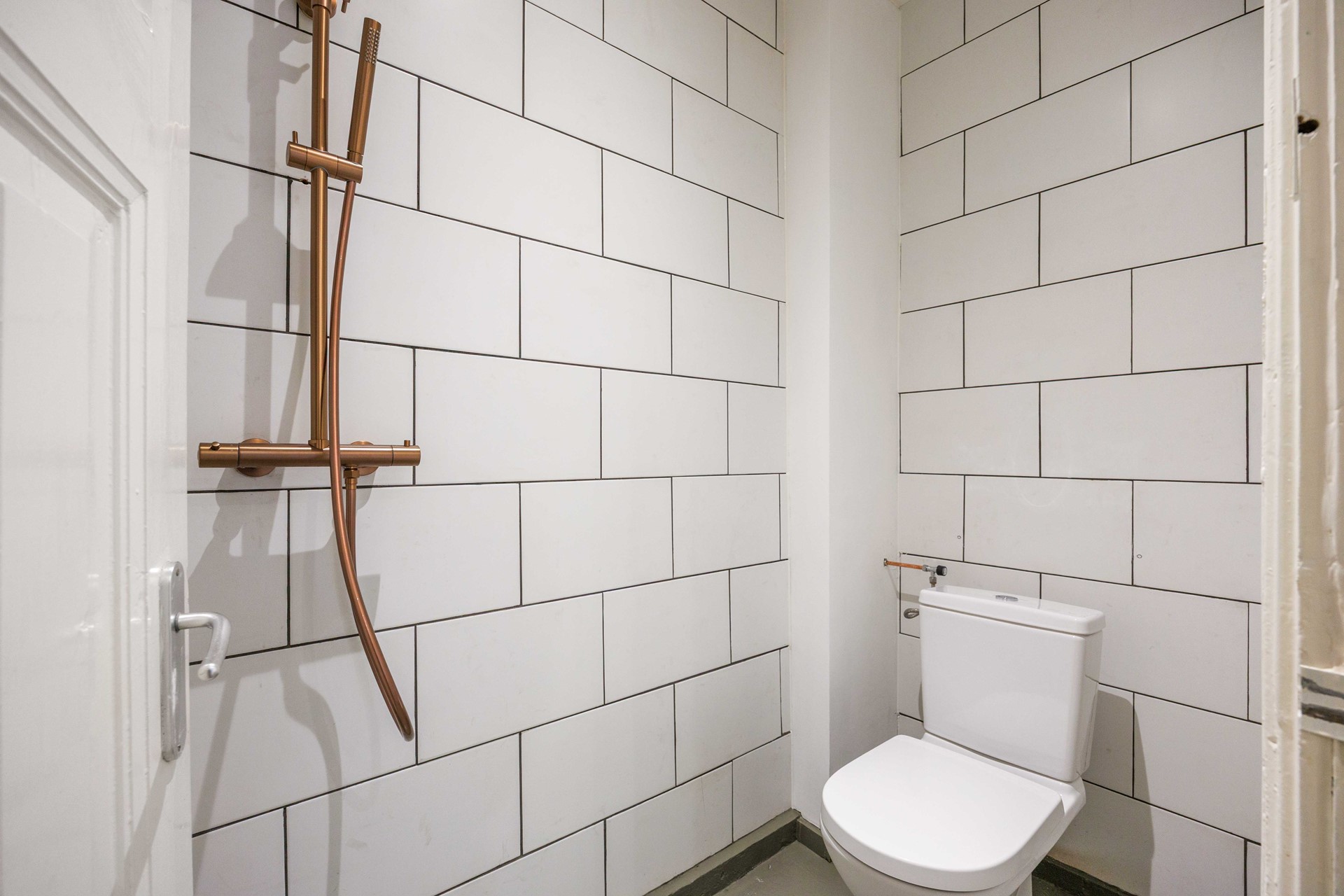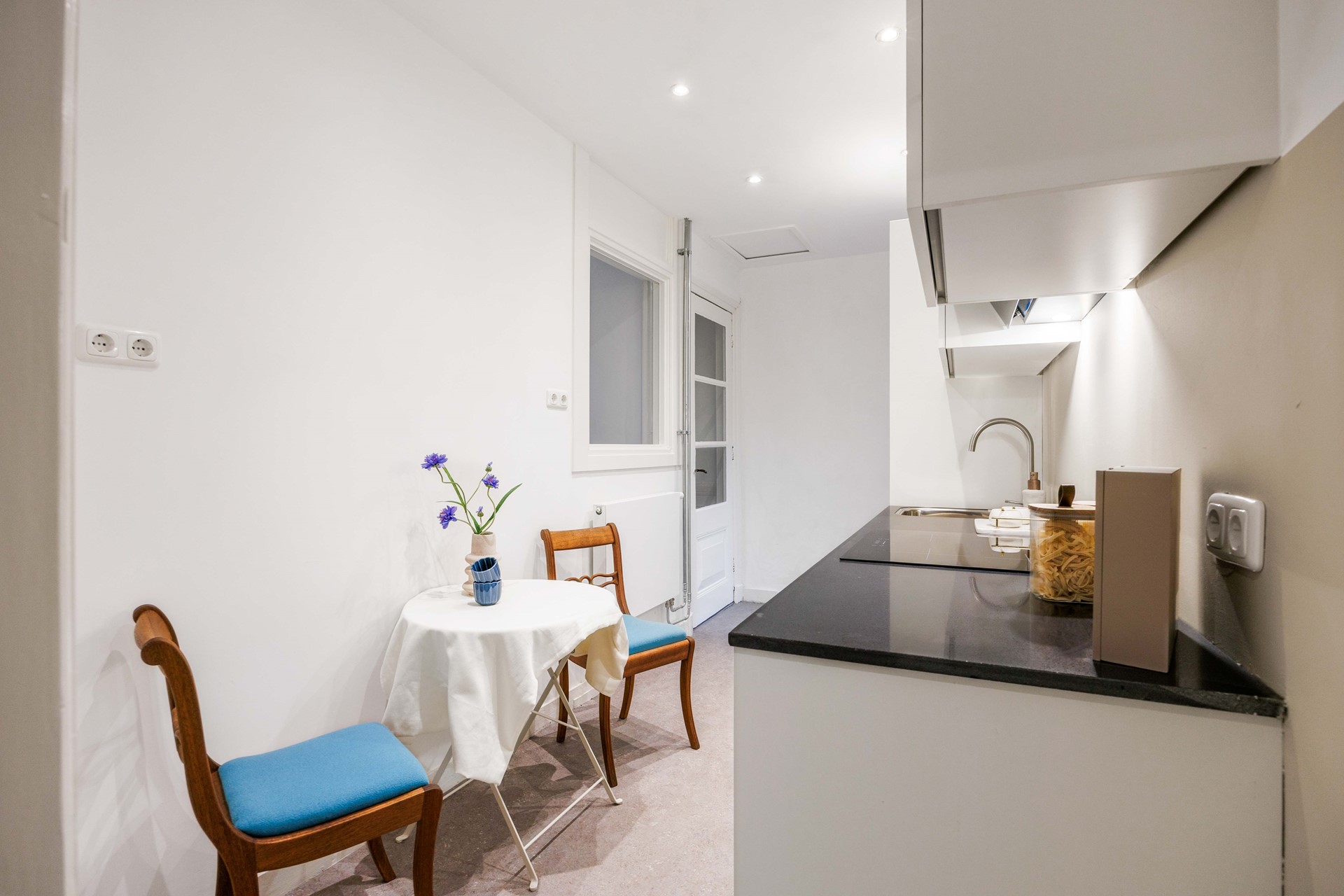 Aan de andere zijde van de hal vind je de keuken, die gemoderniseerd is en voorzien van de nodige inbouwapparatuur. Praktisch en stijlvol ingericht, met voldoende plek om comfortabel te koken. Aansluitend ligt de badkamer, voorzien van een douche en toilet.