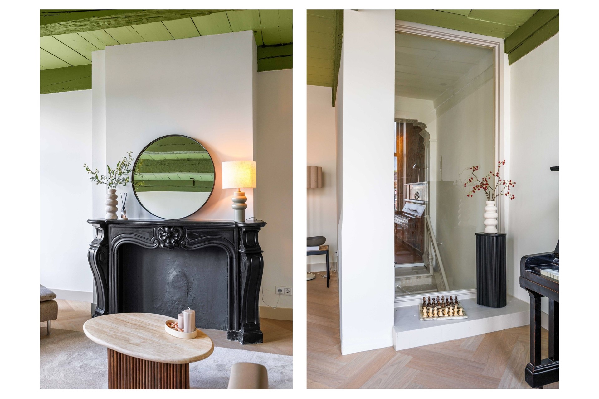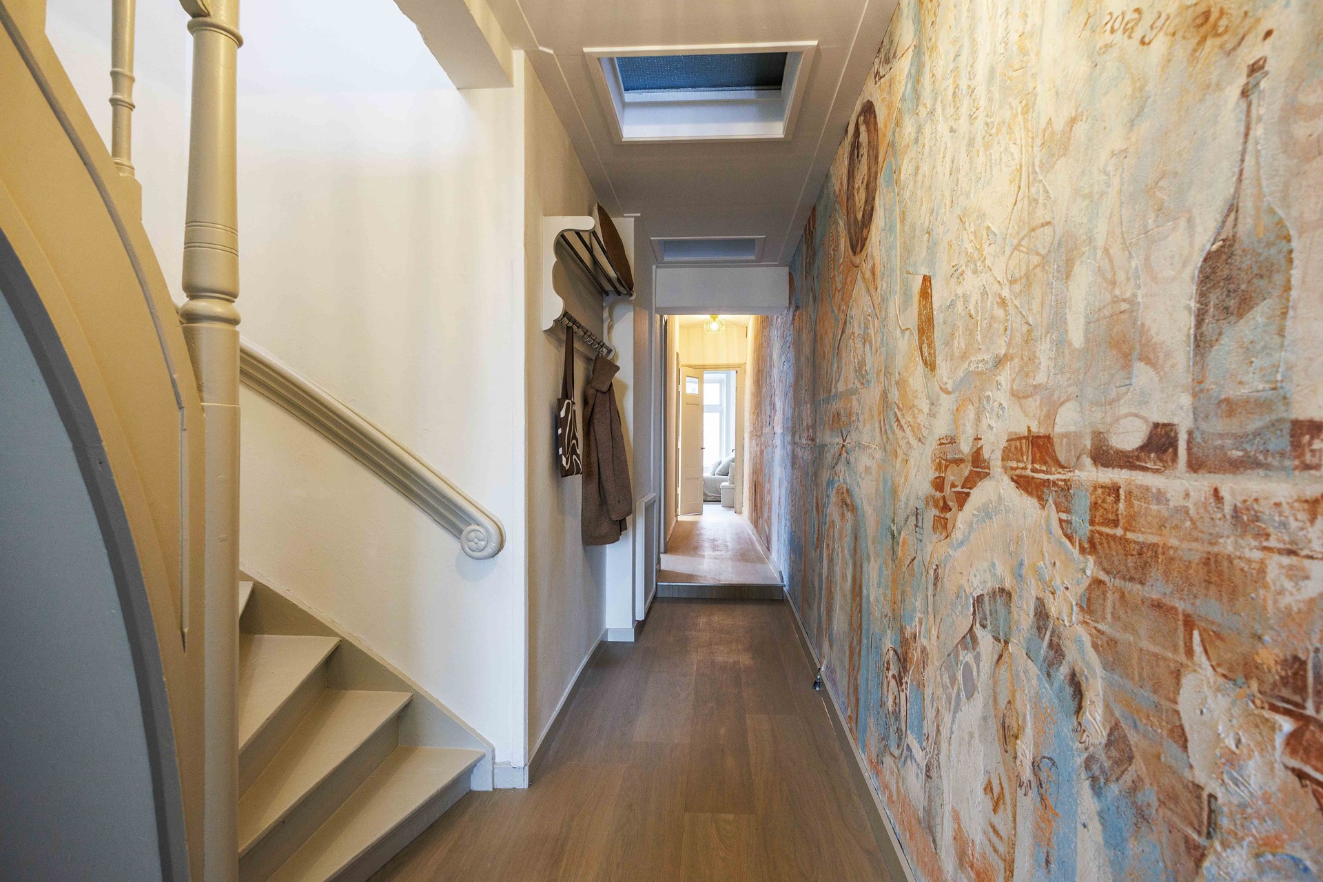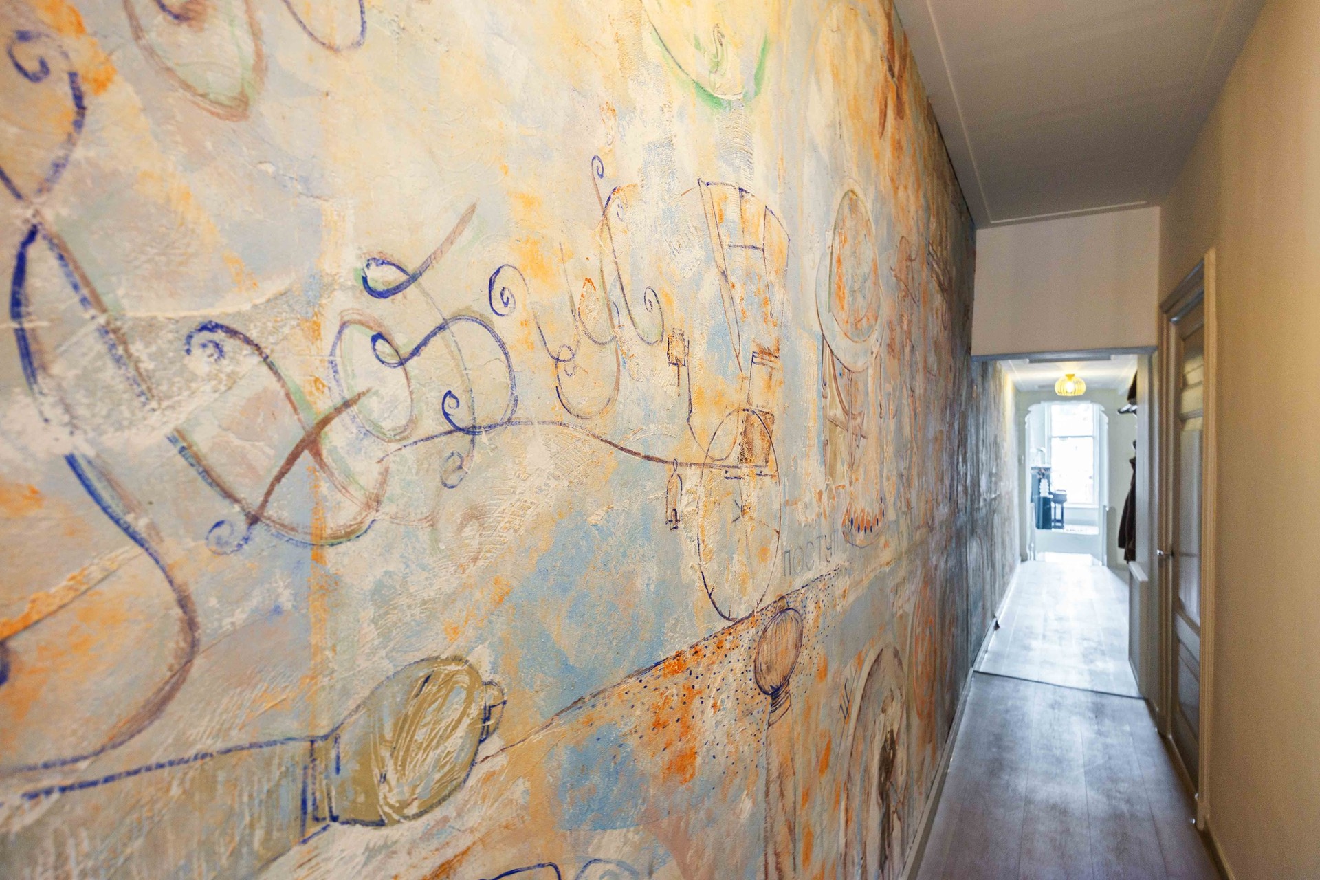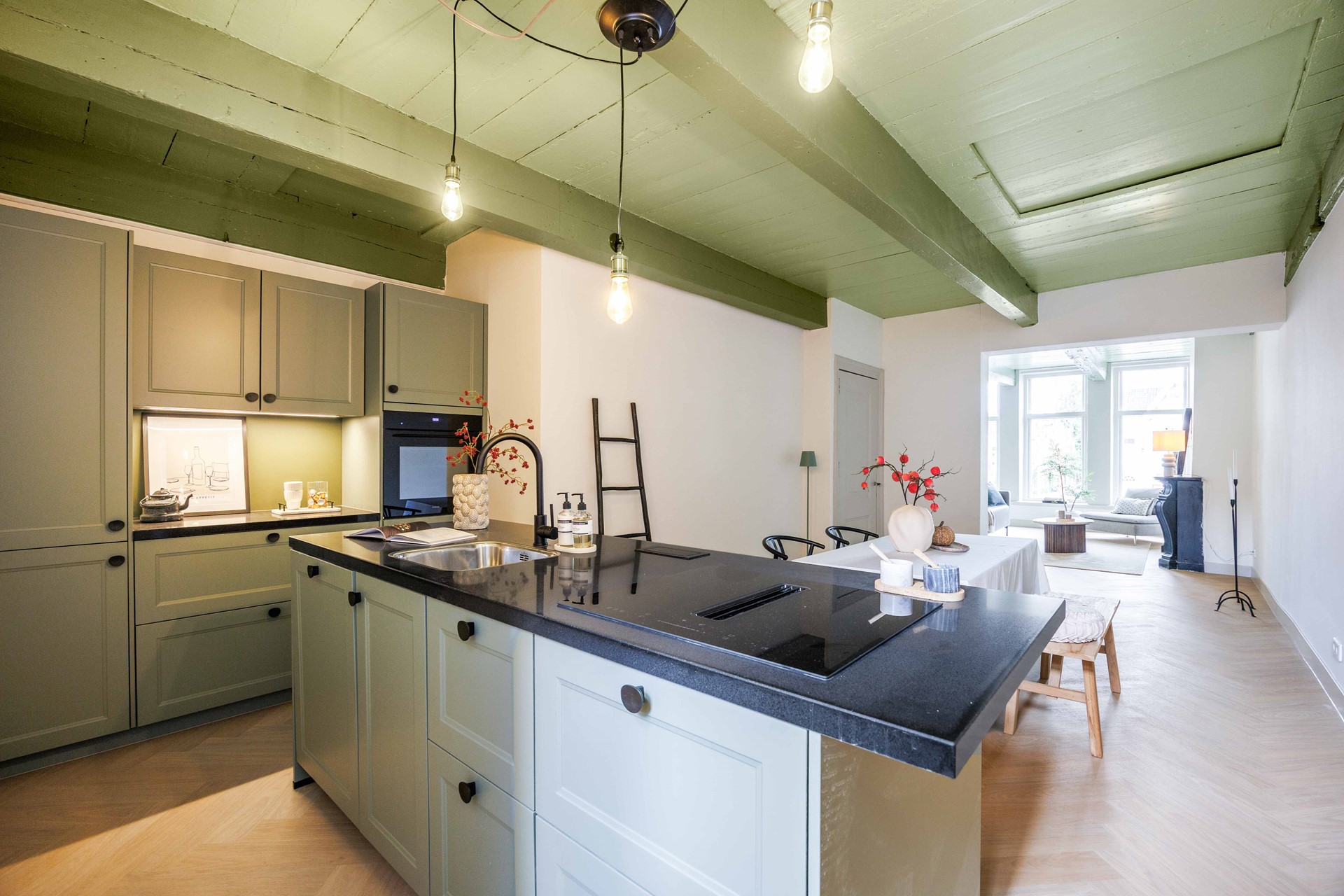 Bij binnenkomst stap je de hal binnen, die direct in het oog springt dankzij de bijzondere muurschilderingen. Aan de linkerkant van de hal bereik je de royale woonkamer met open keuken, samen goed voor zo’n 50 m². De woonkamer ademt sfeer door de authentieke details zoals de schouw en het plafond, die prachtig samengaan met moderne elementen zoals de strak afgewerkte vloer met vloerverwarming. Vergeet hierbij niet het hoogtepunt van deze locatie, namelijk het uitzicht. Een stijlvolle glazen wand zorgt voor een mooie doorkijk naar de artistiek vormgegeven hal. De open keuken is volledig gemoderniseerd, met behoud van het karakter van de woning. Je vindt hier alle benodigde inbouwapparatuur en een kookeiland.