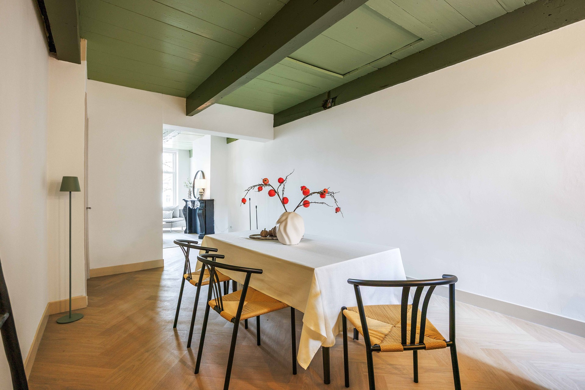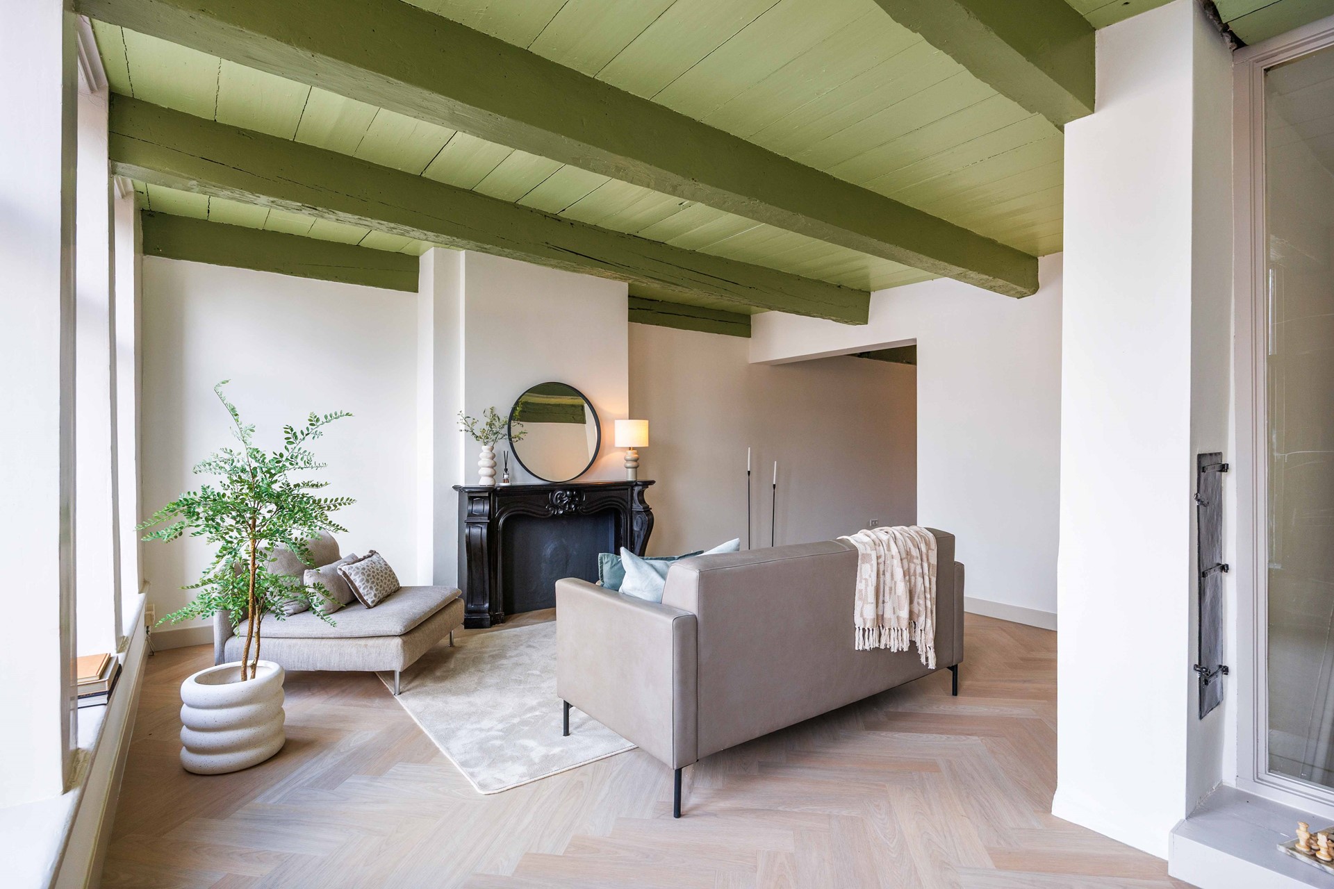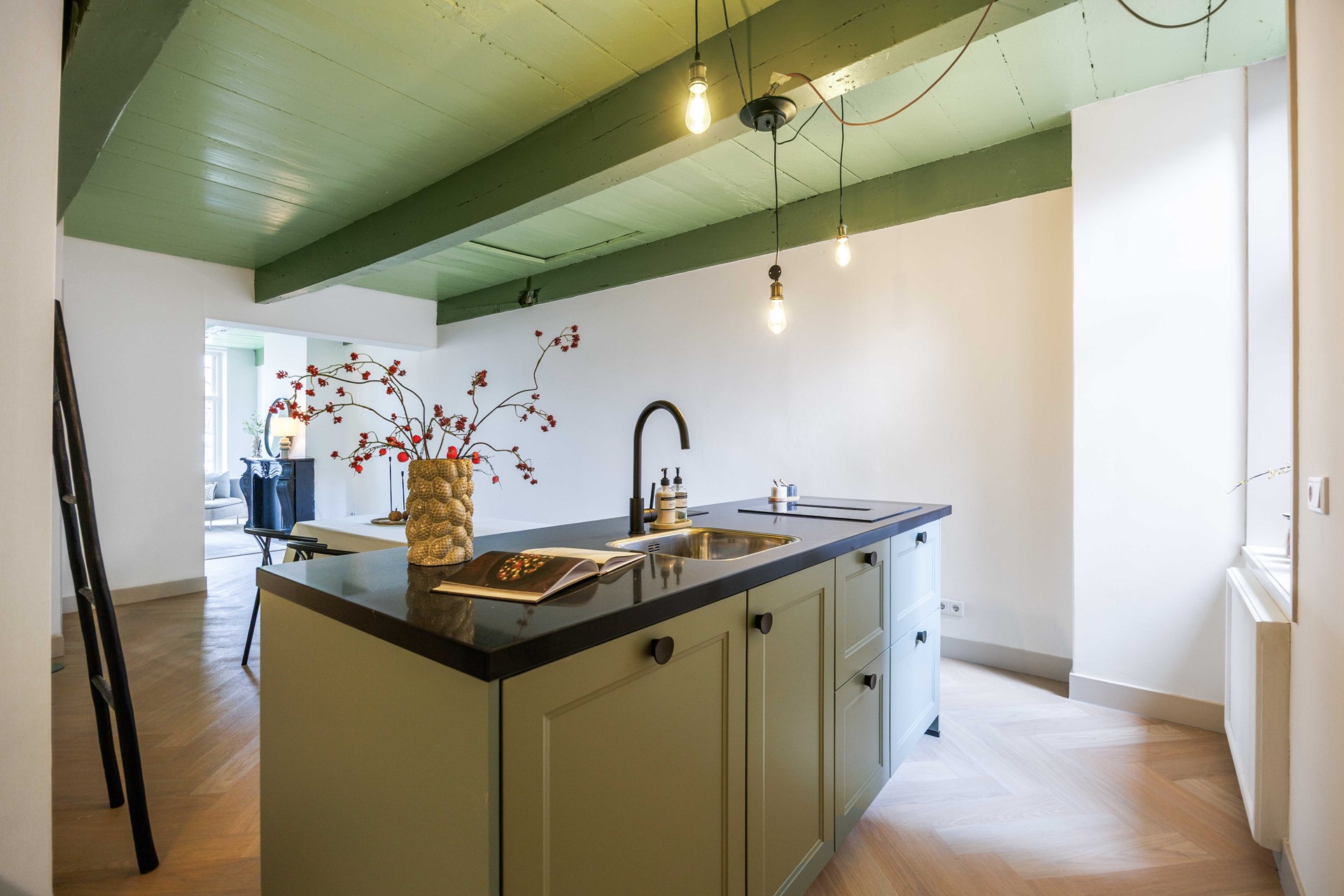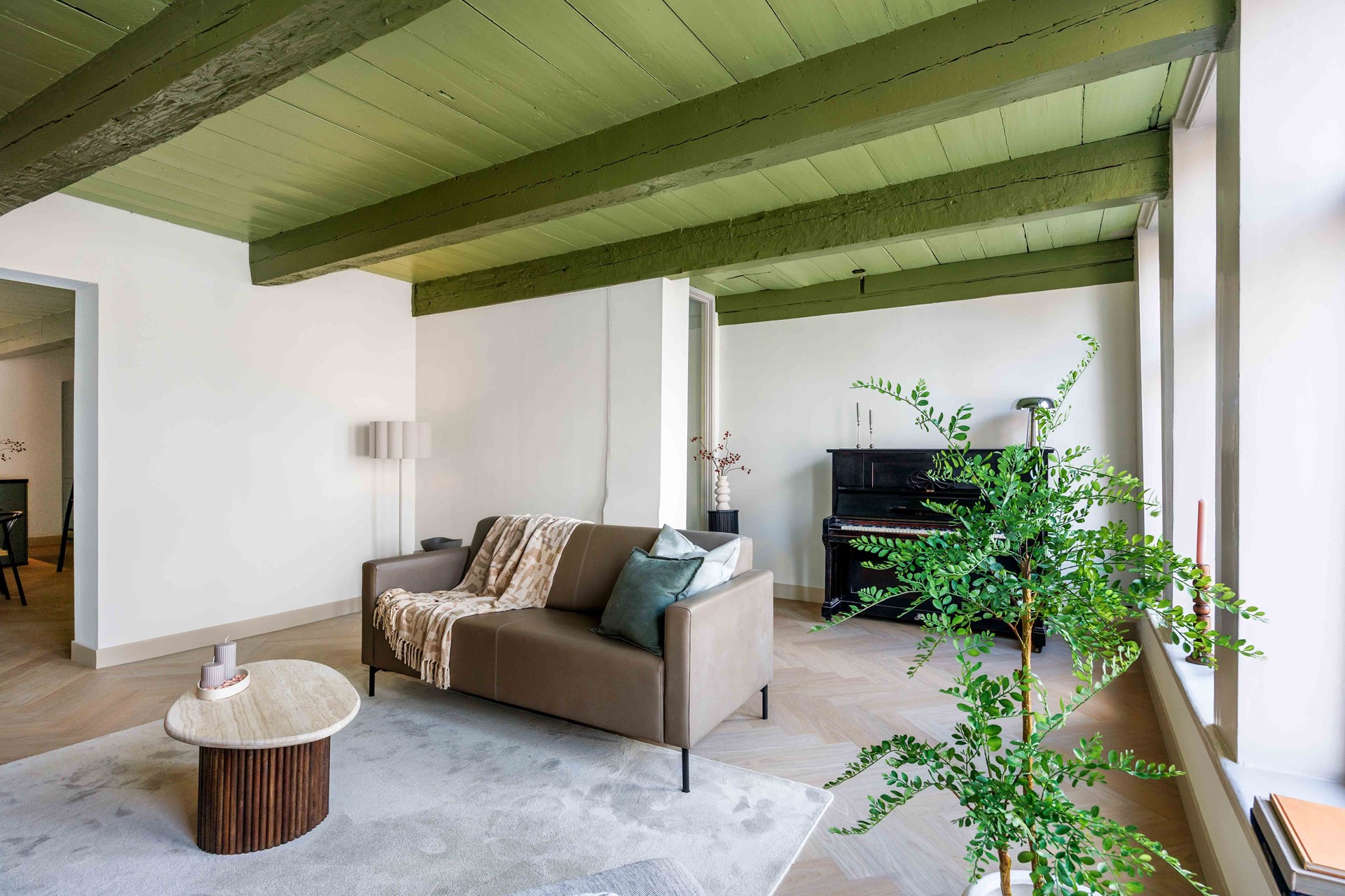 Bij binnenkomst stap je de hal binnen, die direct in het oog springt dankzij de bijzondere muurschilderingen. Aan de linkerkant van de hal bereik je de royale woonkamer met open keuken, samen goed voor zo’n 50 m². De woonkamer ademt sfeer door de authentieke details zoals de schouw en het plafond, die prachtig samengaan met moderne elementen zoals de strak afgewerkte vloer met vloerverwarming. Vergeet hierbij niet het hoogtepunt van deze locatie, namelijk het uitzicht. Een stijlvolle glazen wand zorgt voor een mooie doorkijk naar de artistiek vormgegeven hal. De open keuken is volledig gemoderniseerd, met behoud van het karakter van de woning. Je vindt hier alle benodigde inbouwapparatuur en een kookeiland.