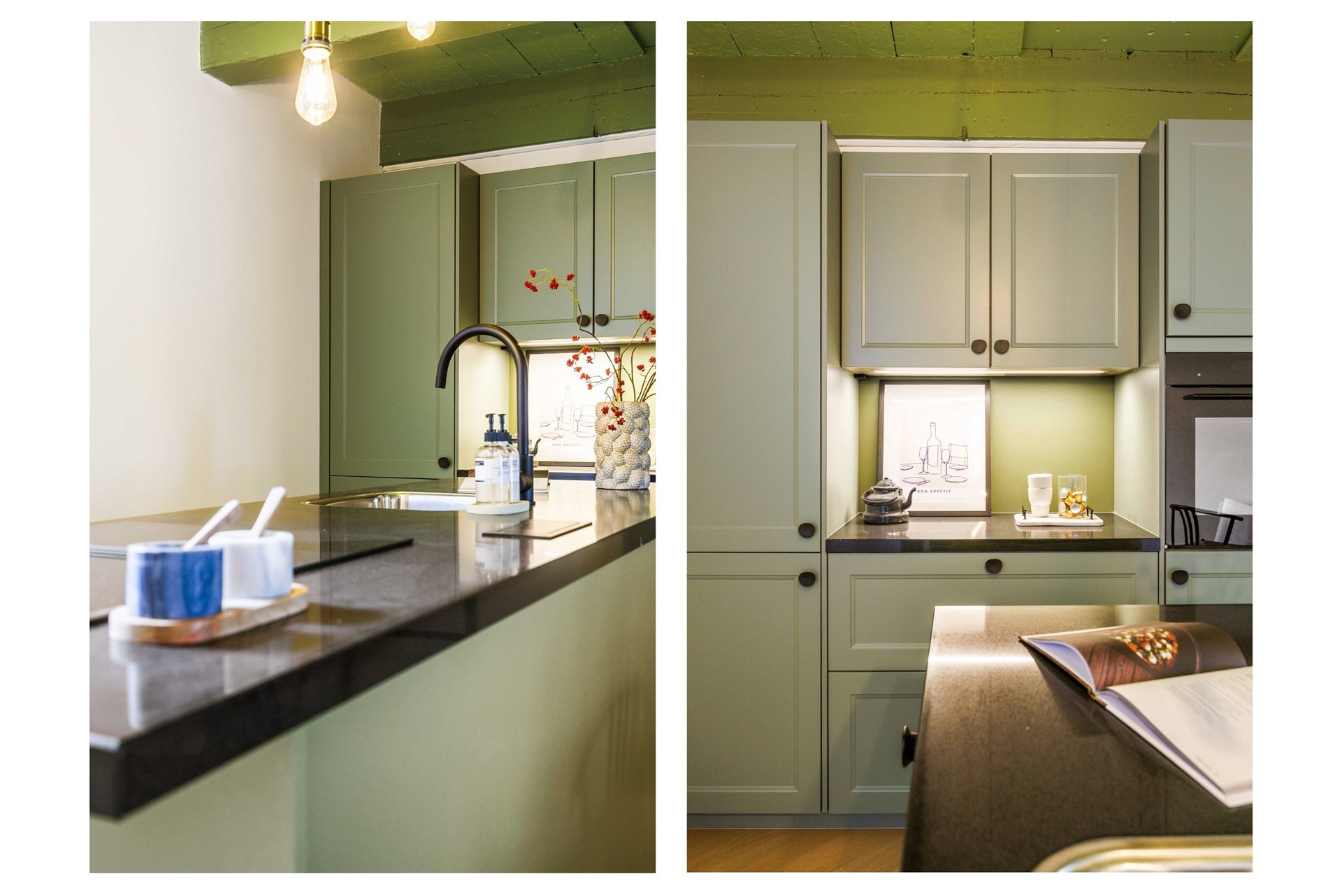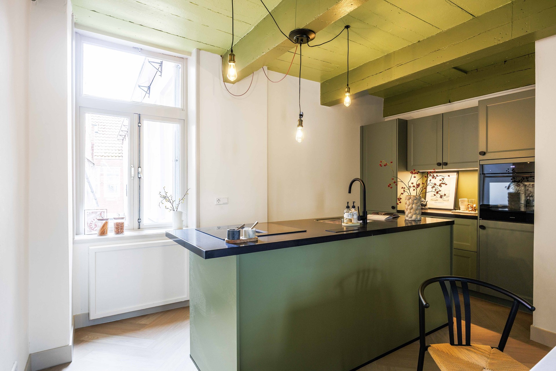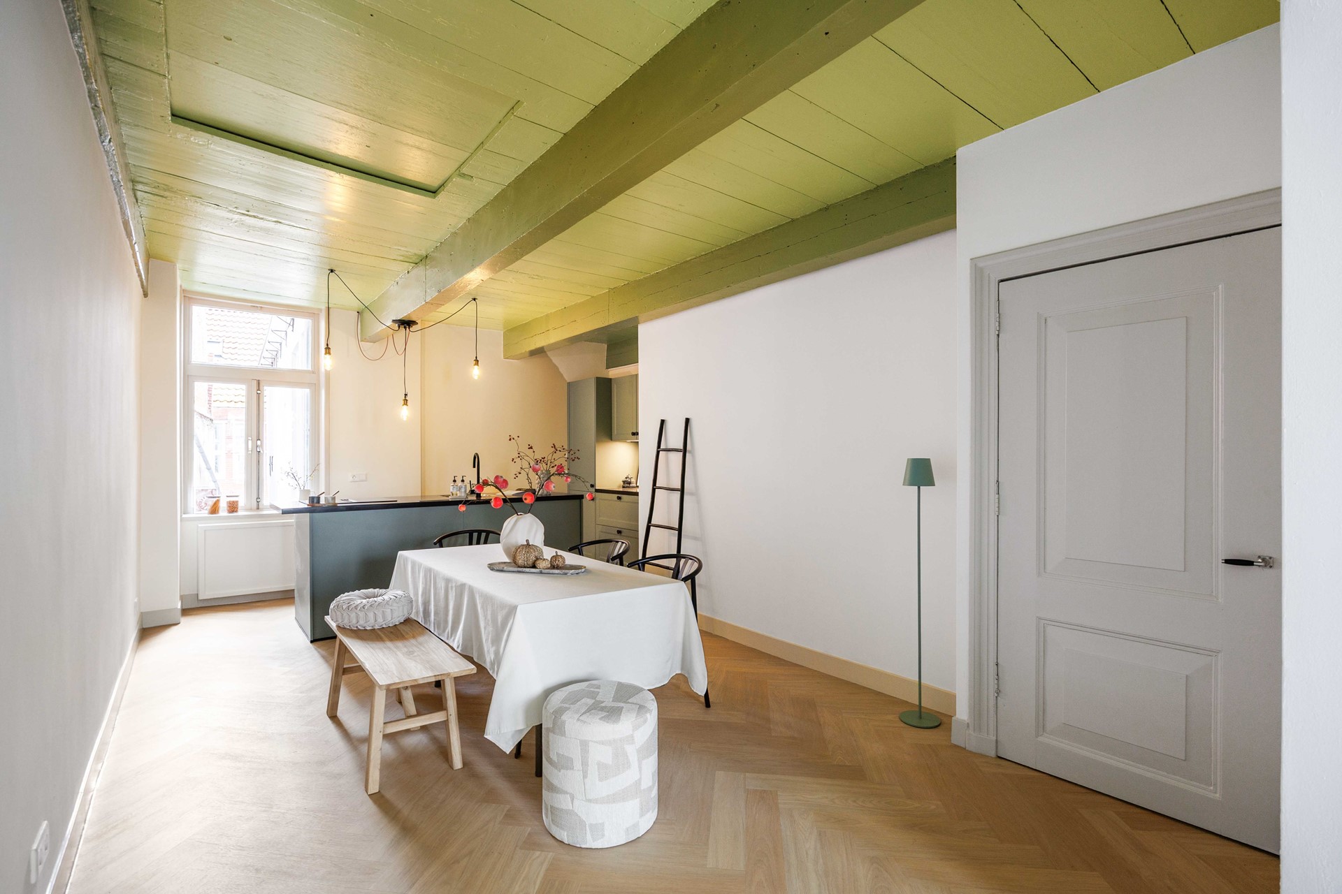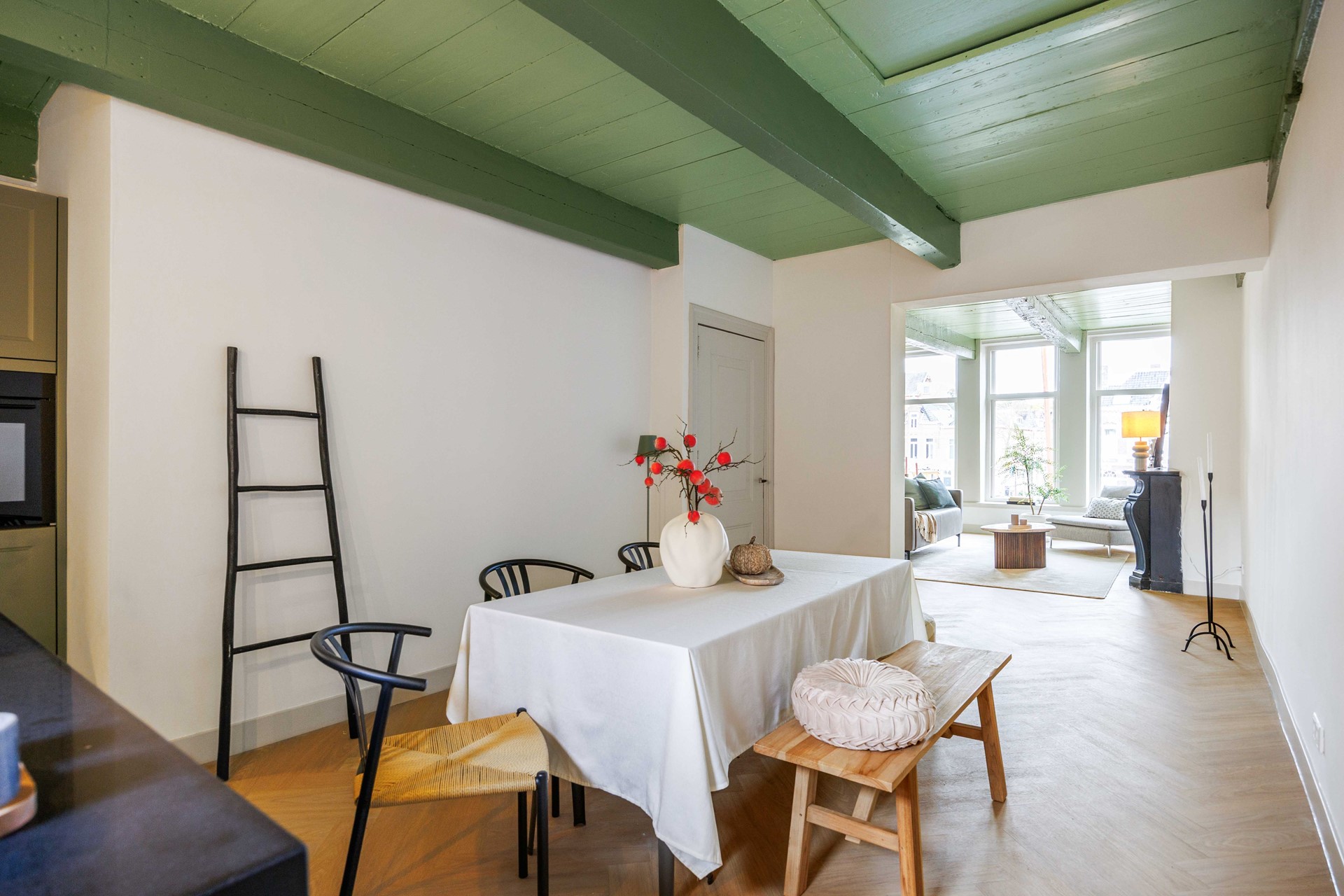 Bij binnenkomst stap je de hal binnen, die direct in het oog springt dankzij de bijzondere muurschilderingen. Aan de linkerkant van de hal bereik je de royale woonkamer met open keuken, samen goed voor zo’n 50 m². De woonkamer ademt sfeer door de authentieke details zoals de schouw en het plafond, die prachtig samengaan met moderne elementen zoals de strak afgewerkte vloer met vloerverwarming. Vergeet hierbij niet het hoogtepunt van deze locatie, namelijk het uitzicht. Een stijlvolle glazen wand zorgt voor een mooie doorkijk naar de artistiek vormgegeven hal. De open keuken is volledig gemoderniseerd, met behoud van het karakter van de woning. Je vindt hier alle benodigde inbouwapparatuur en een kookeiland.