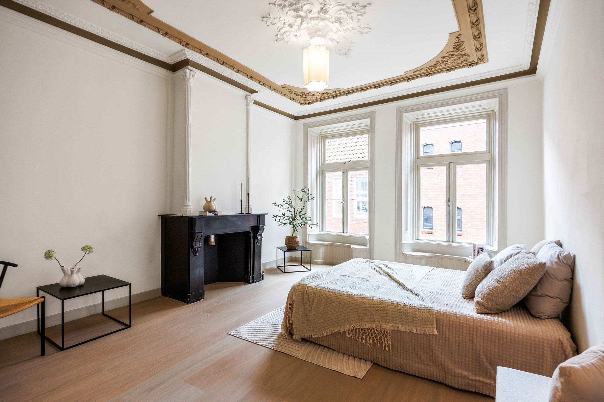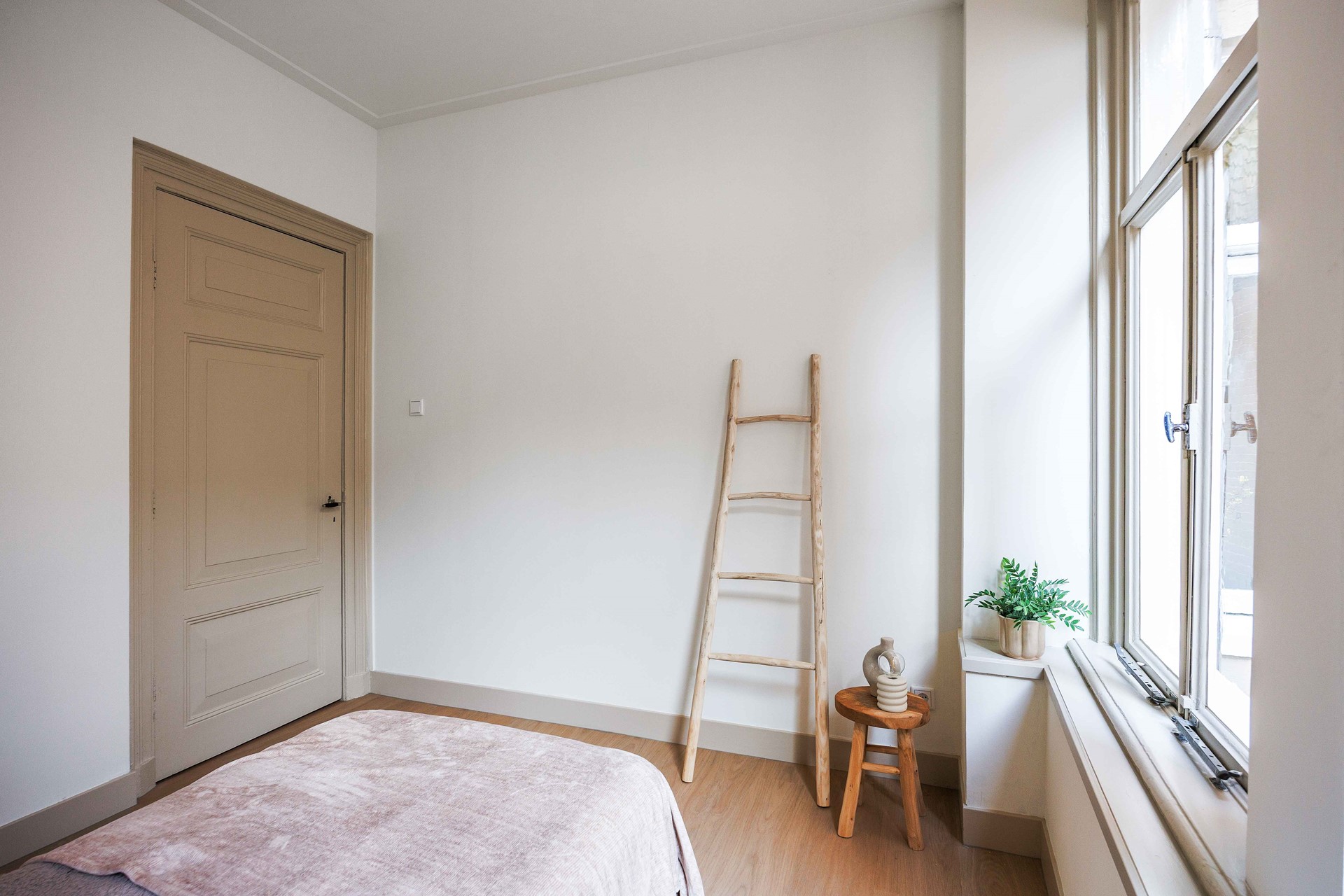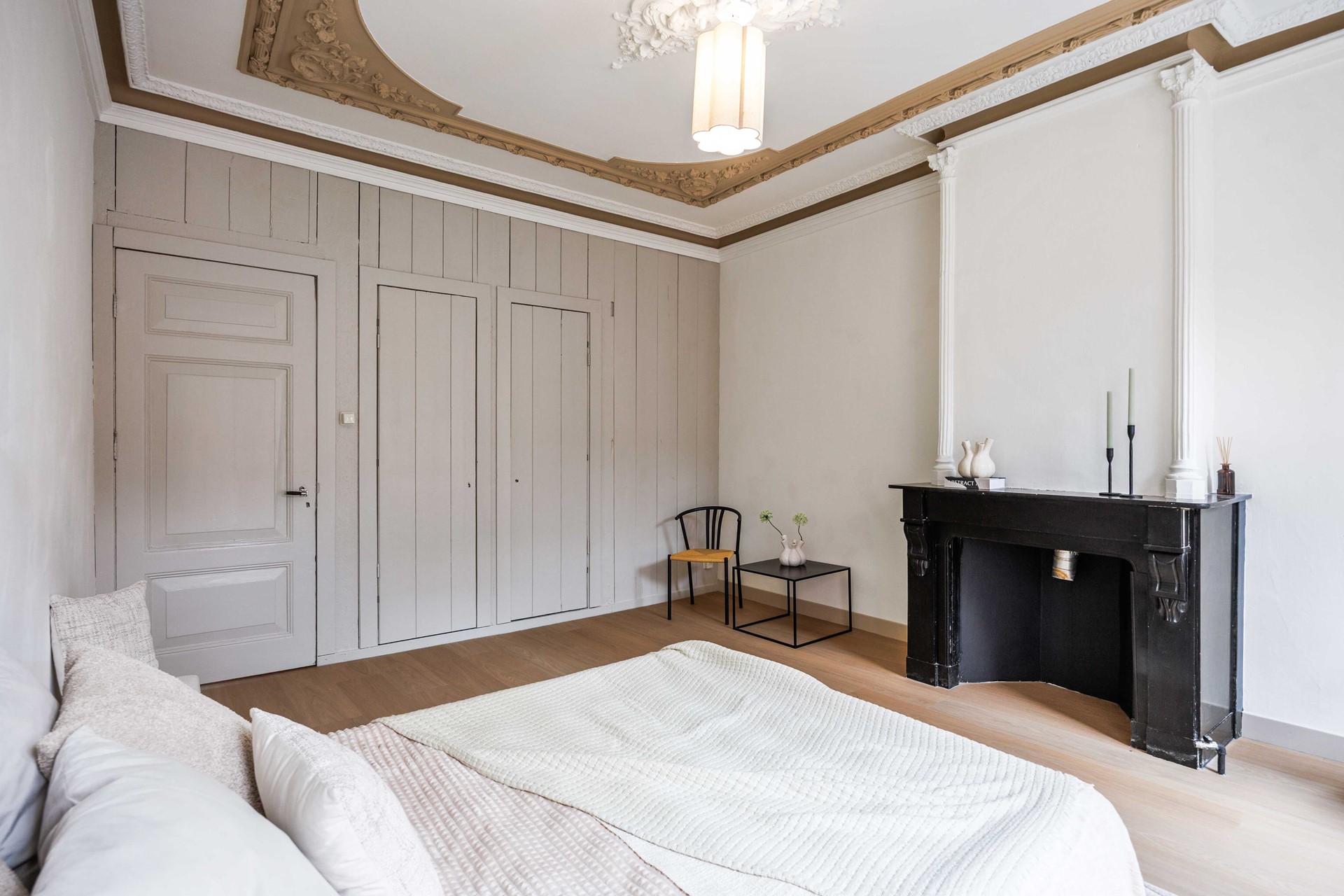 Loop je verder door de hal richting de achterzijde van de woning, dan kom je bij twee slaapkamers van ca. 19,4 m² en 9,1 m². In de master bedroom komen de originele elementen van het huis prachtig tot hun recht: denk aan authentieke vensterbanken, een sfeervolle schouw en een karakteristiek plafond. De badkamer is recent vernieuwd en modern uitgevoerd in aardse tinten. Hier vind je een inloopdouche, een toilet en een wastafelmeubel.
