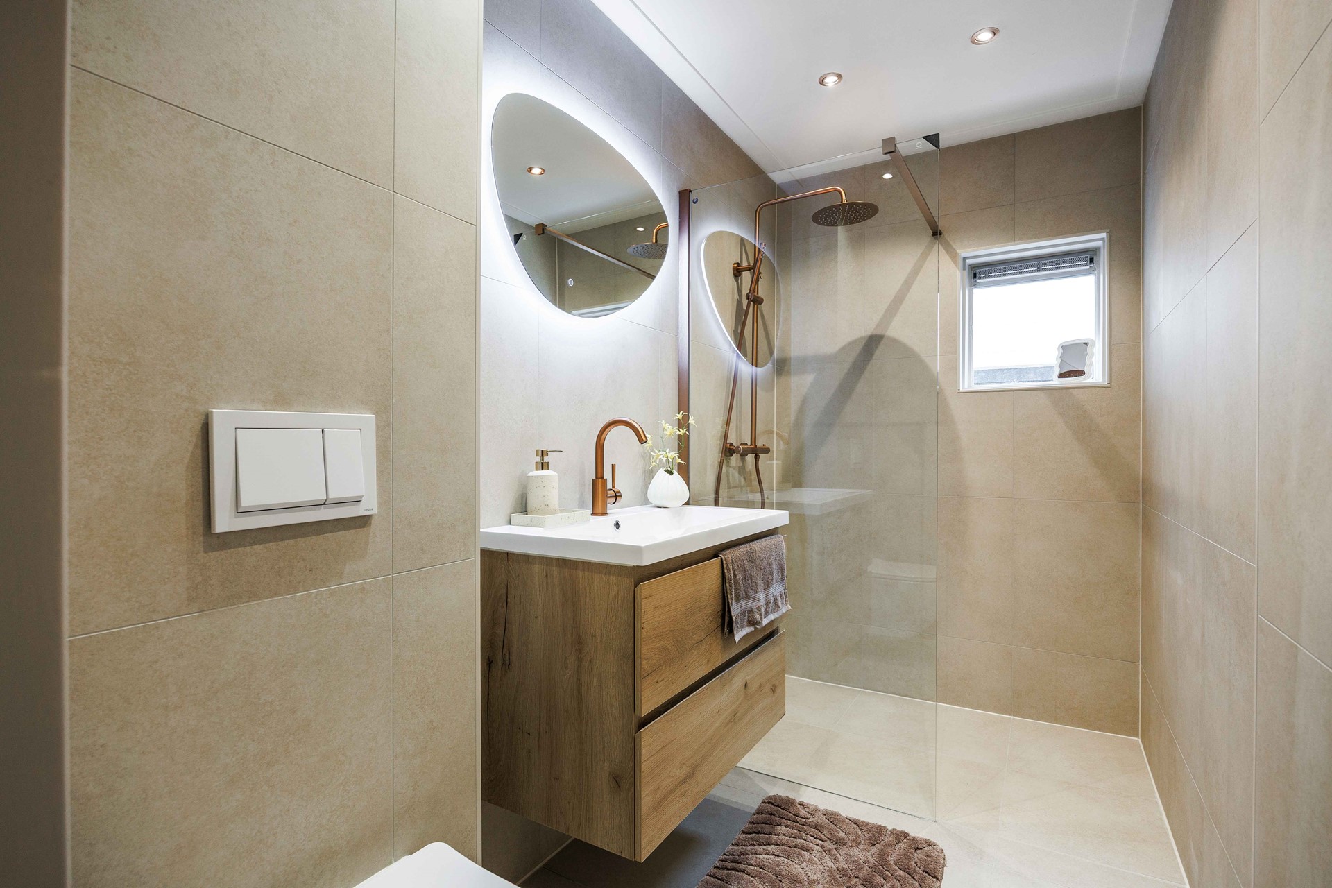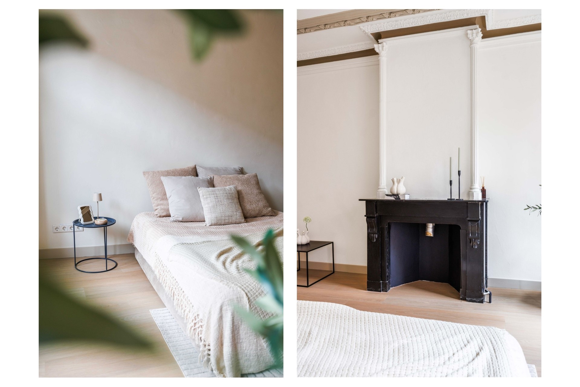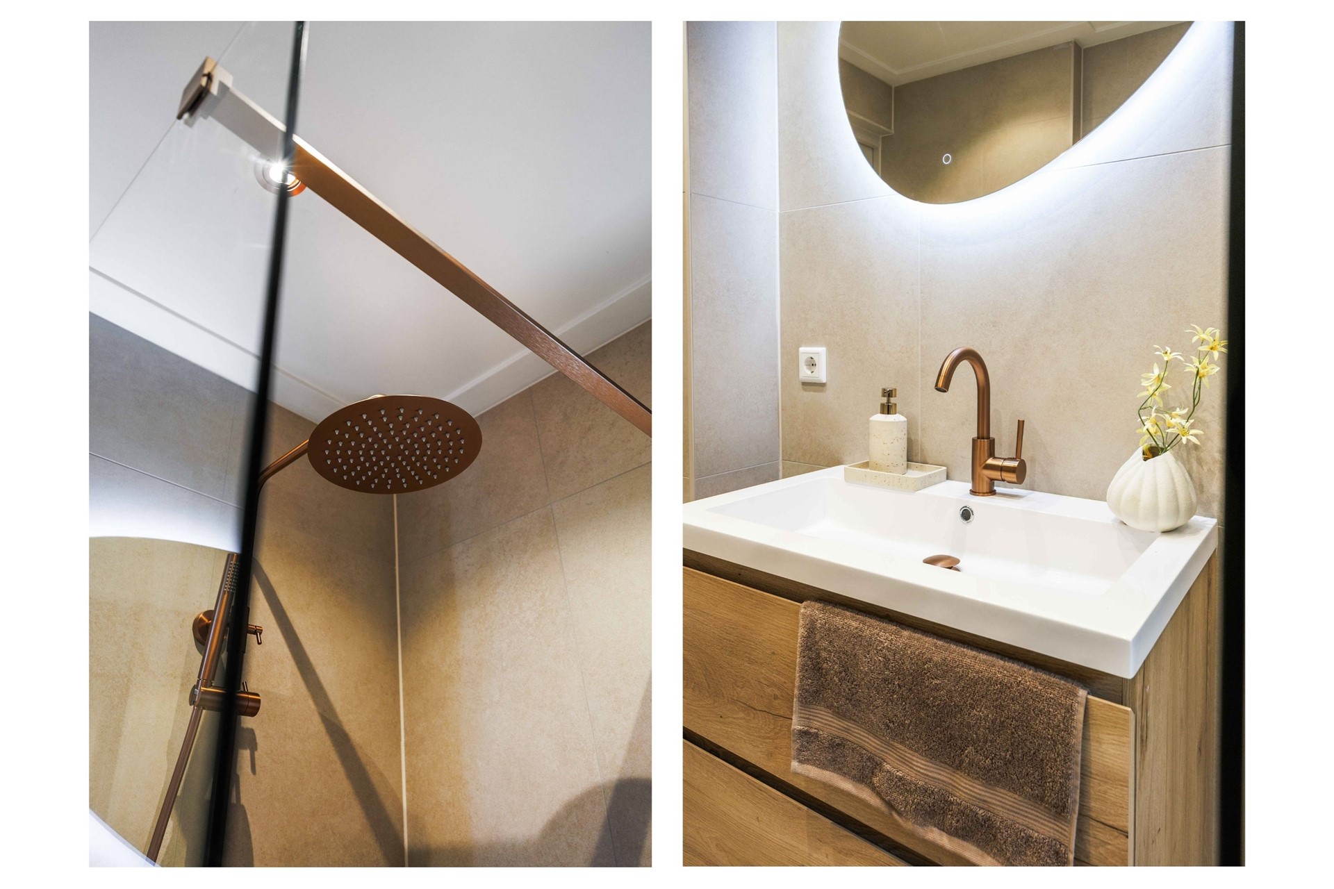 Loop je verder door de hal richting de achterzijde van de woning, dan kom je bij twee slaapkamers van ca. 19,4 m² en 9,1 m². In de master bedroom komen de originele elementen van het huis prachtig tot hun recht: denk aan authentieke vensterbanken, een sfeervolle schouw en een karakteristiek plafond. De badkamer is recent vernieuwd en modern uitgevoerd in aardse tinten. Hier vind je een inloopdouche, een toilet en een wastafelmeubel.