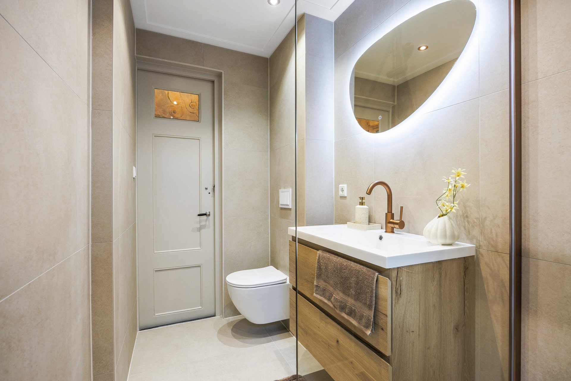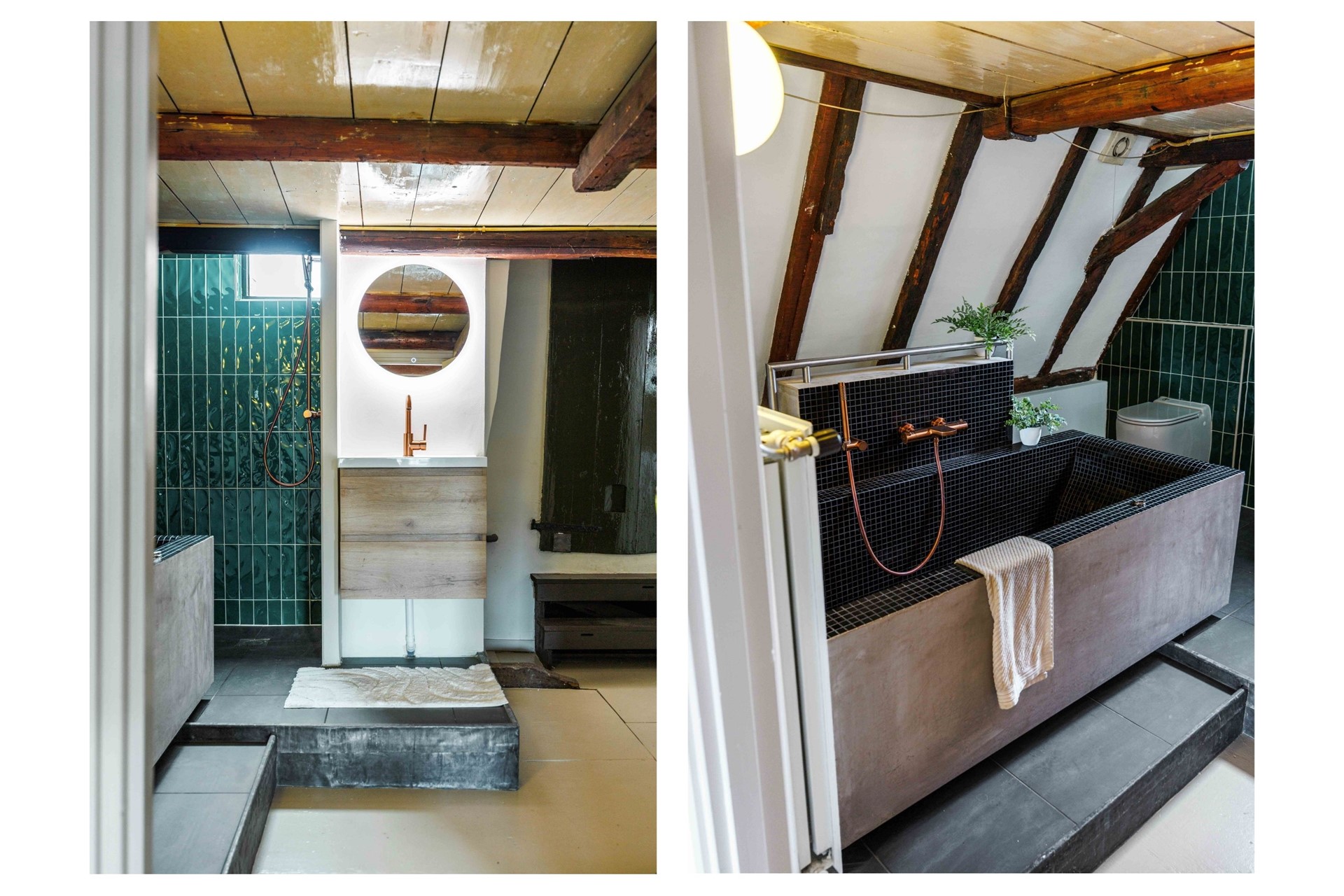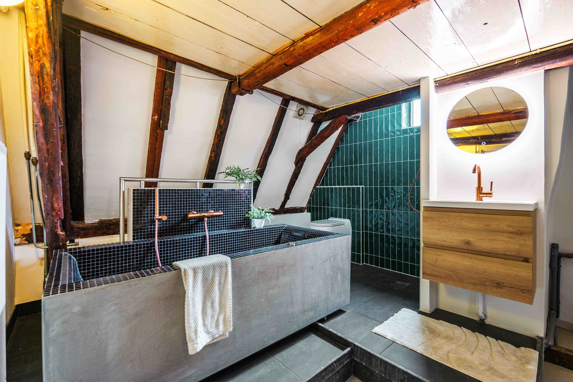 Aansluitend bevindt zich hier een tweede, ruime badkamer van ca. 15 m², voorzien van een ligbad, douche, toilet en wastafelmeubel. Vanuit deze badkamer is ook de zolder bereikbaar, die circa 23 m² aan bergruimte biedt.