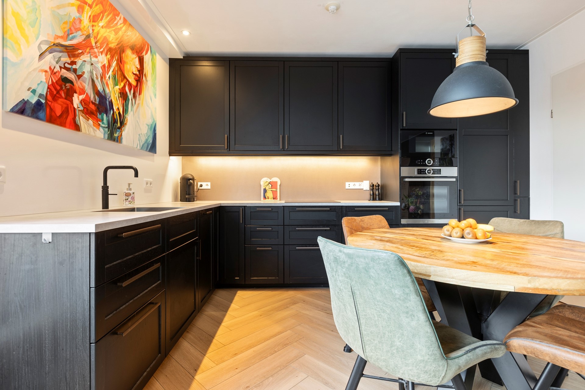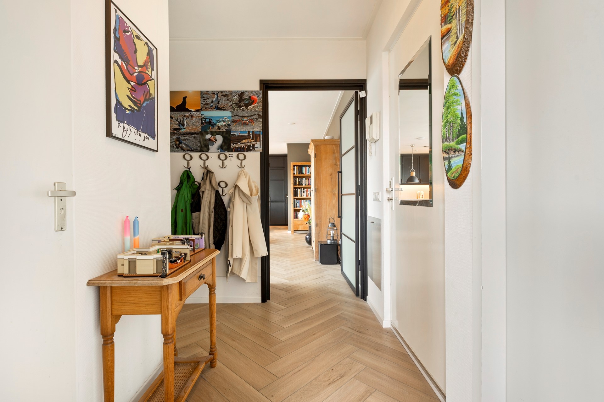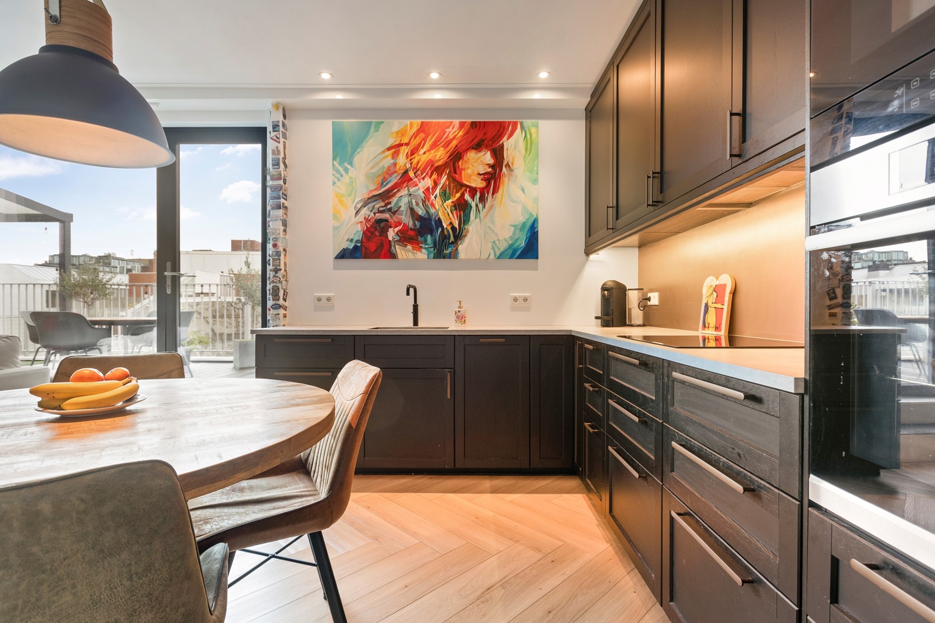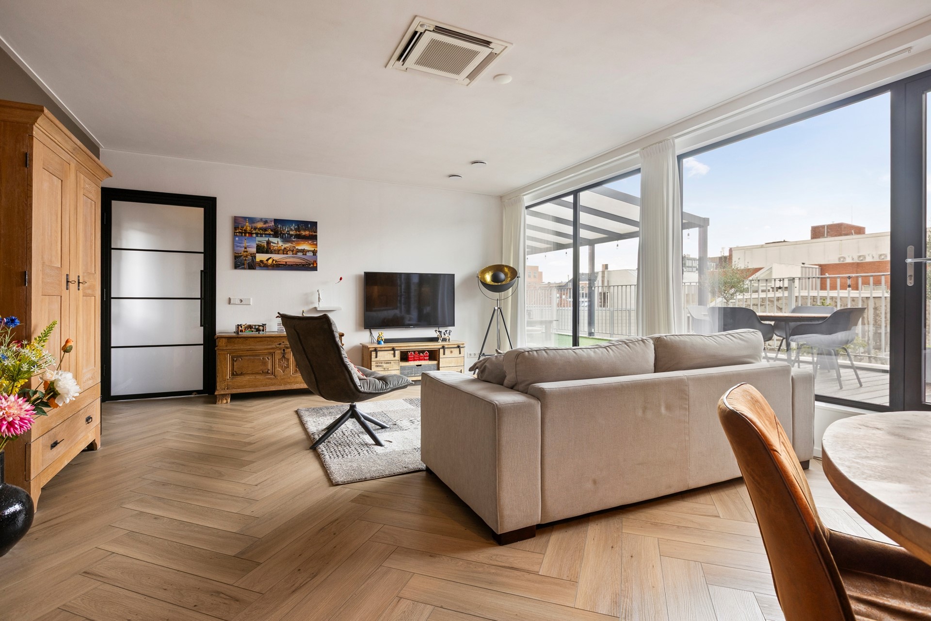 De woning ligt in een keurig appartementencomplex met slechts enkele appartementen op de derde verdieping. Via de gezamenlijke entree -welke gelegen is aan een gang van de Stoeldraaierstraat- met trappenhuis, of de lift, kom je bij het appartement. Binnen stap je de hal in, die toegang geeft tot alle ruimtes. Eerst is er de lichte woonkamer met open keuken van circa 37 m². De keuken is modern en volledig uitgerust met verschillende inbouwapparatuur van kwaliteit. Denk aan een inductiekookplaat, oven, magnetron, vaatwasser, afzuigsysteem, koelkast en vriezer. Naast de keuken zit een bergkast met de aansluitingen voor de wasmachine. Vanuit de woonkamer met grote raampartijen met triple beglazing loop je direct het indrukwekkende terras op van maar liefst 42 m² (!), deels voorzien van een overkapping: een heerlijke plek om volop van buiten te genieten. En dat middenin het centrum!
