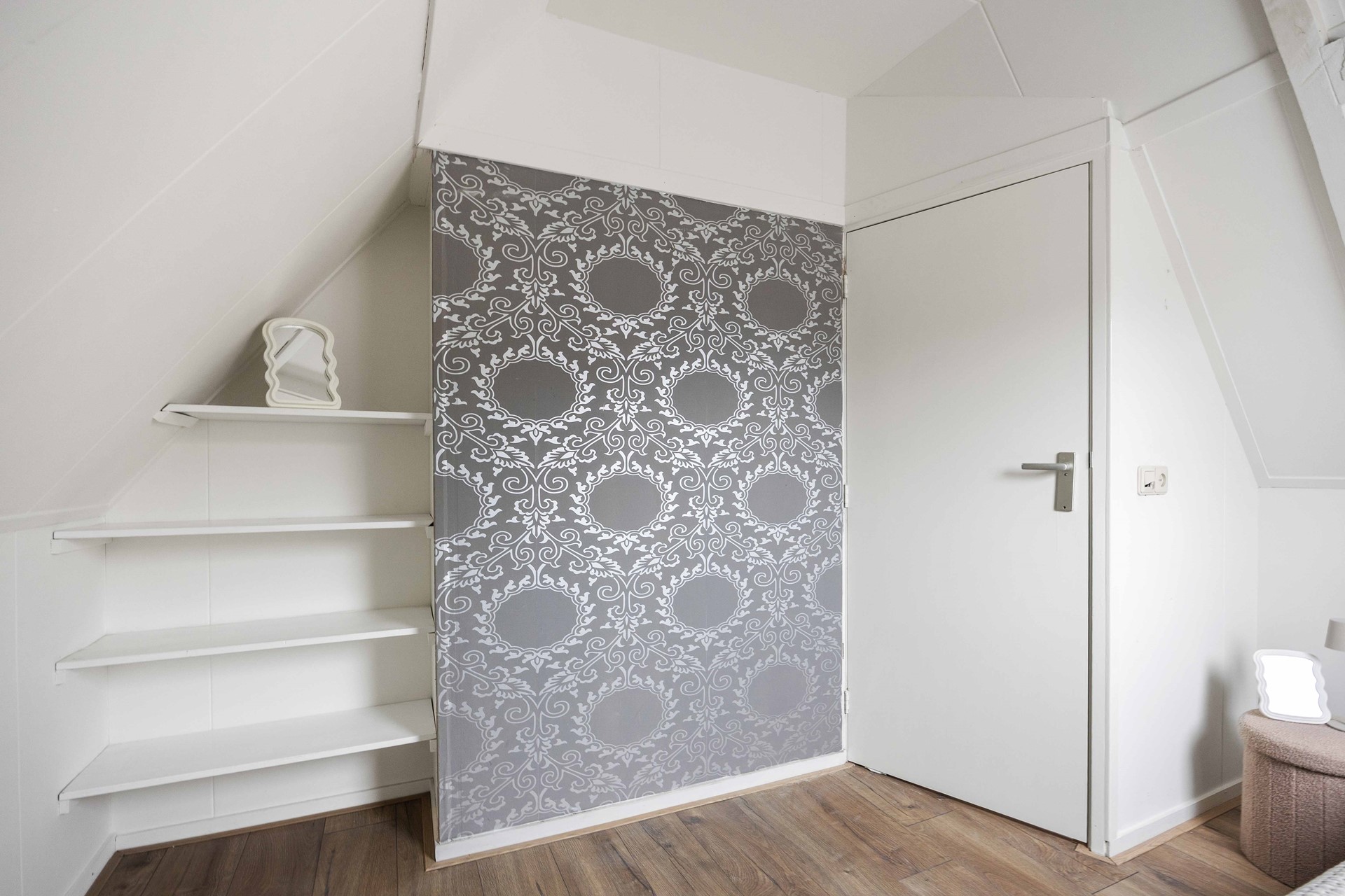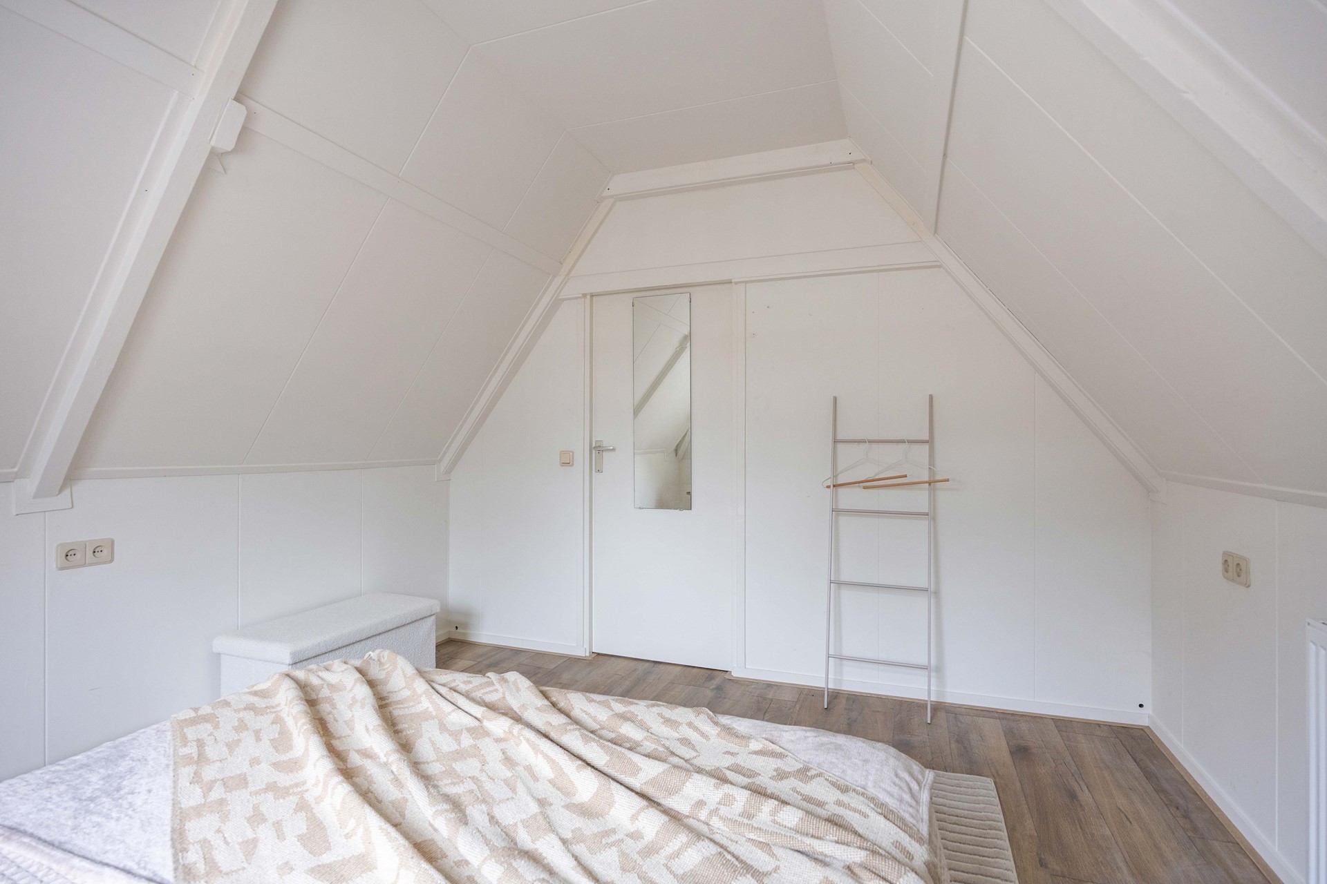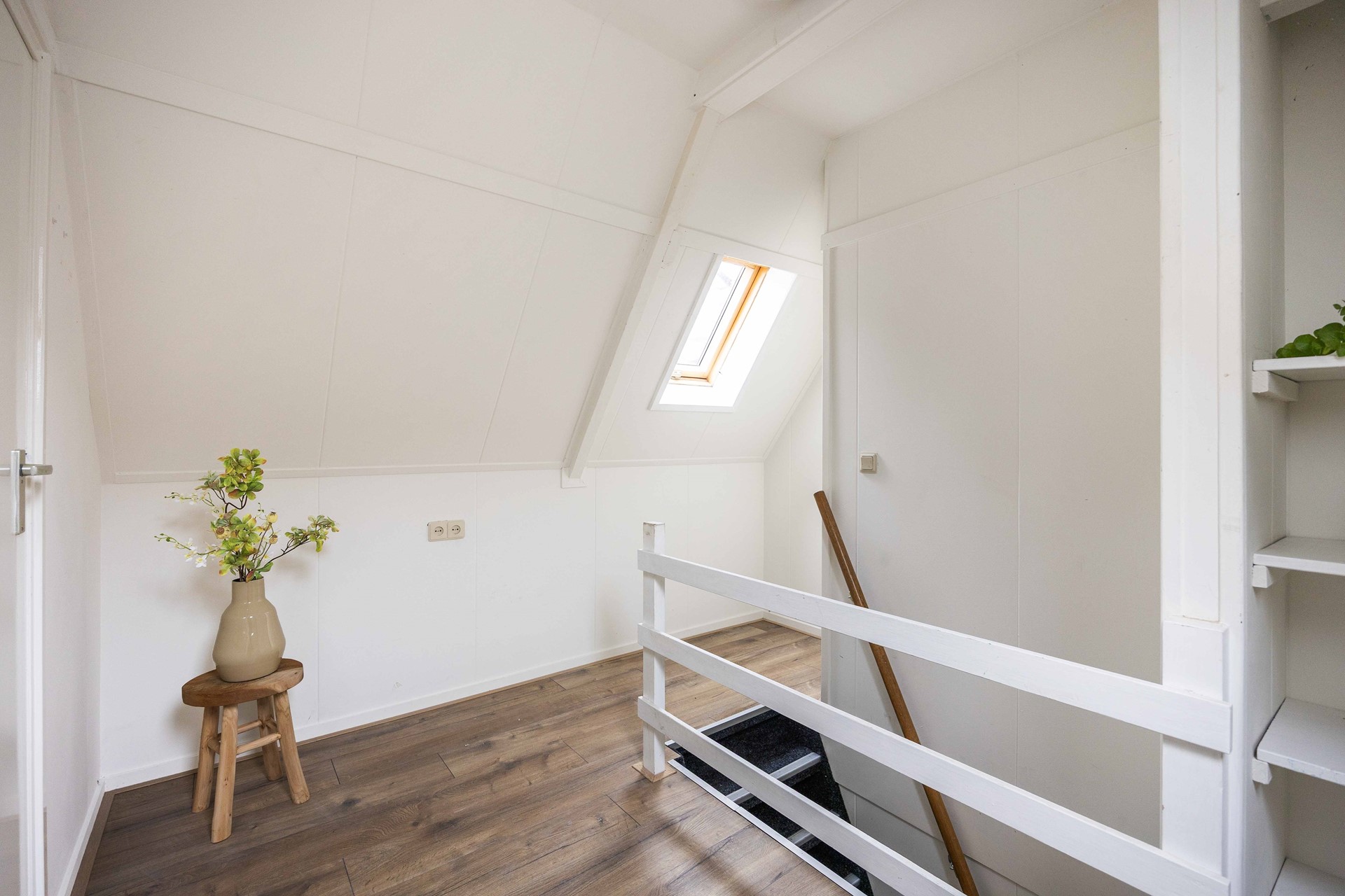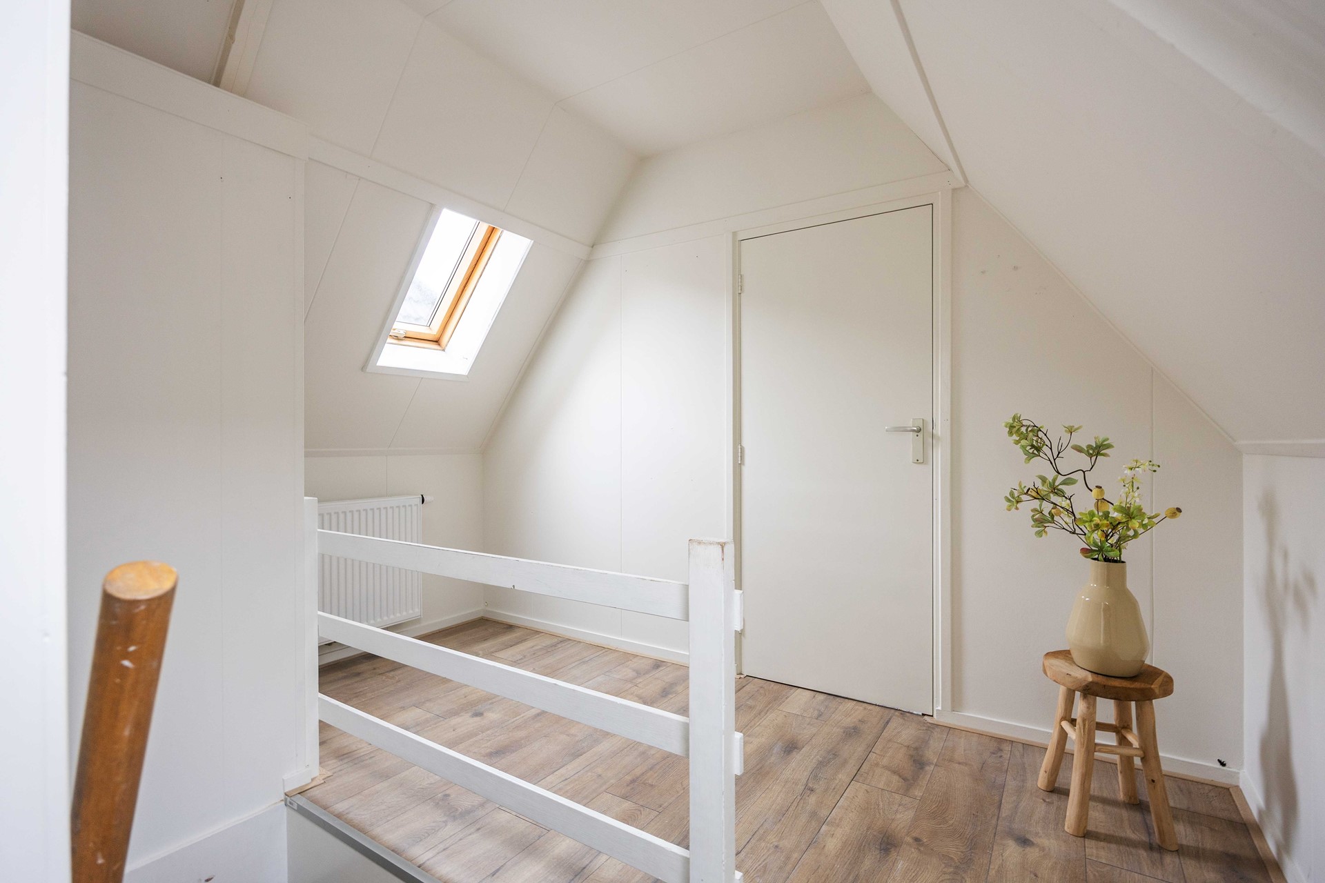 Het toilet bevindt zich in de hal. Vanaf daar leidt een trap naar de bovenverdieping, waar de twee slaapkamers (ca. 11 m² en 6 m²) zich bevinden.