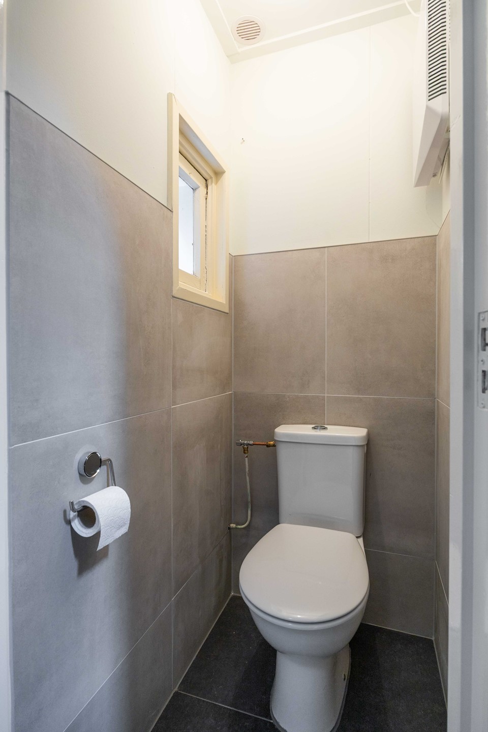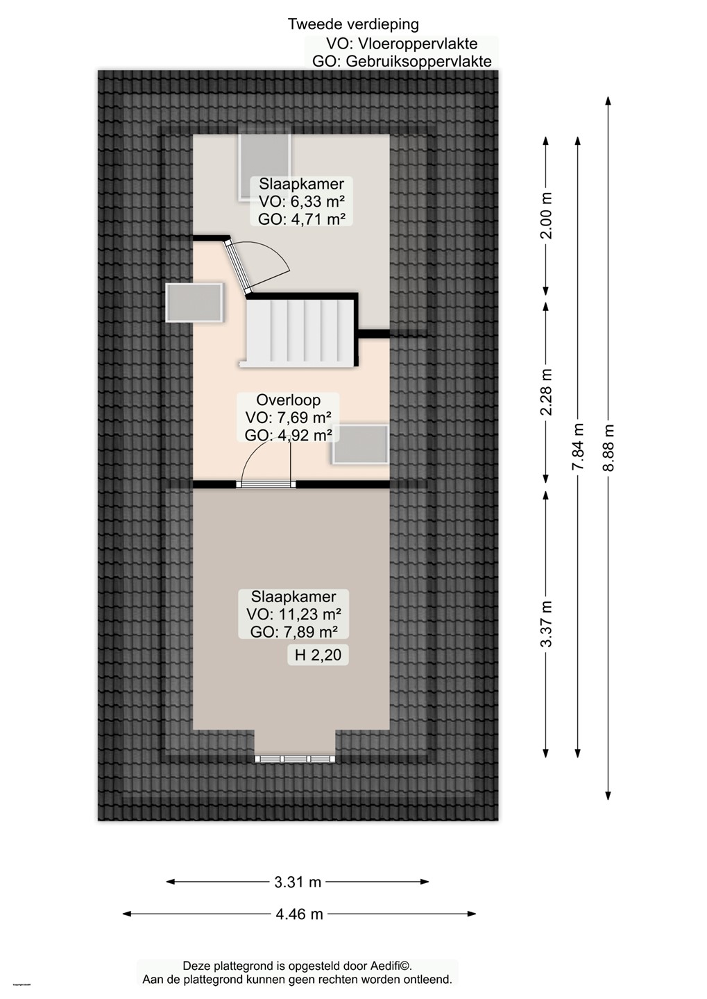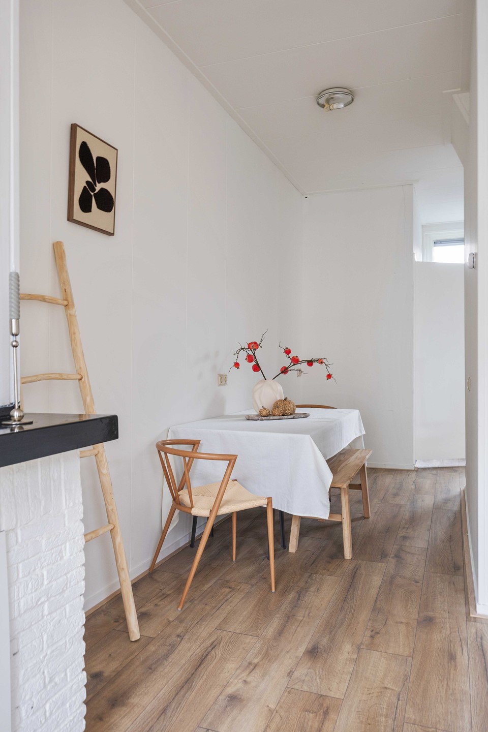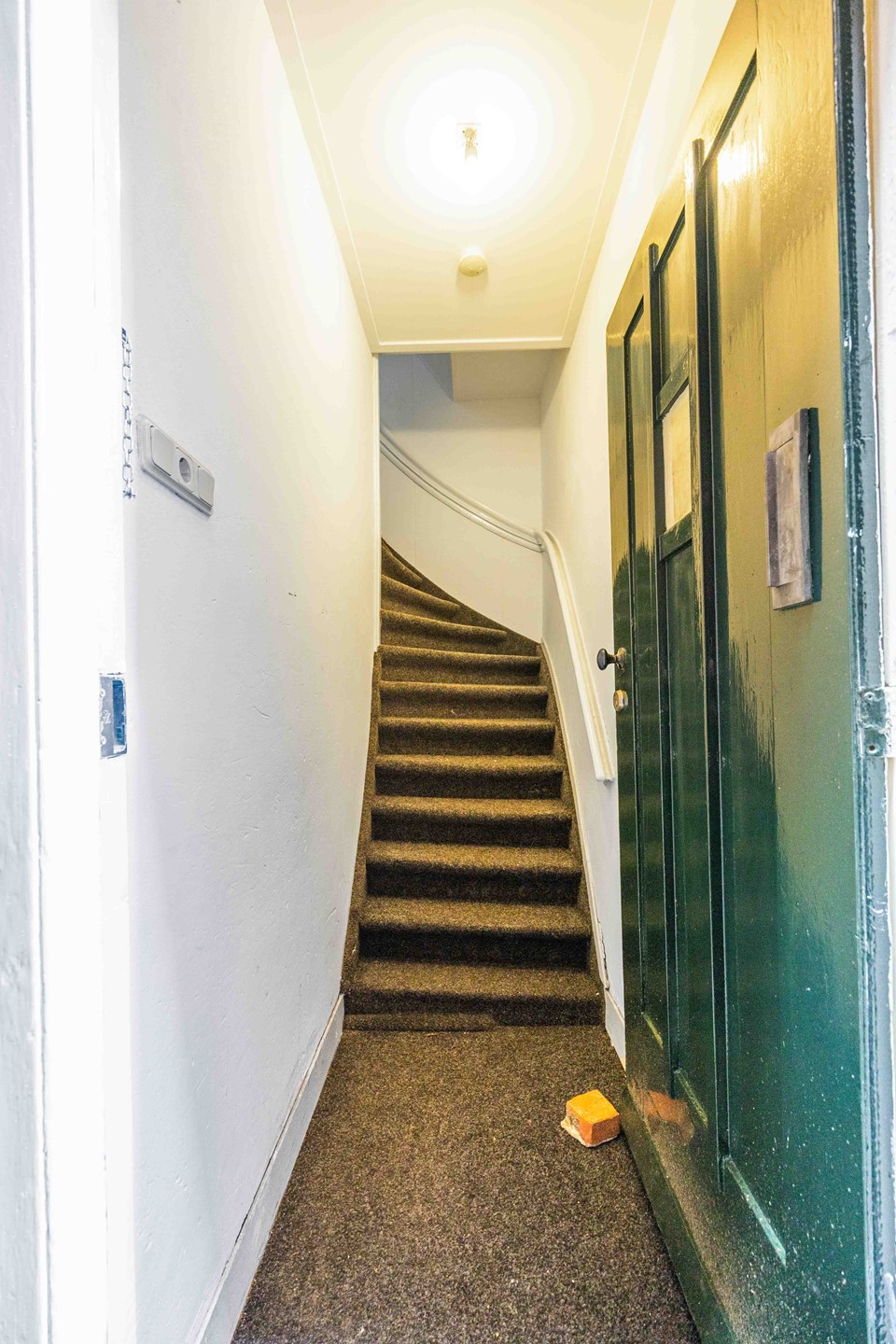 Het toilet bevindt zich in de hal. Vanaf daar leidt een trap naar de bovenverdieping, waar de twee slaapkamers (ca. 11 m² en 6 m²) zich bevinden.