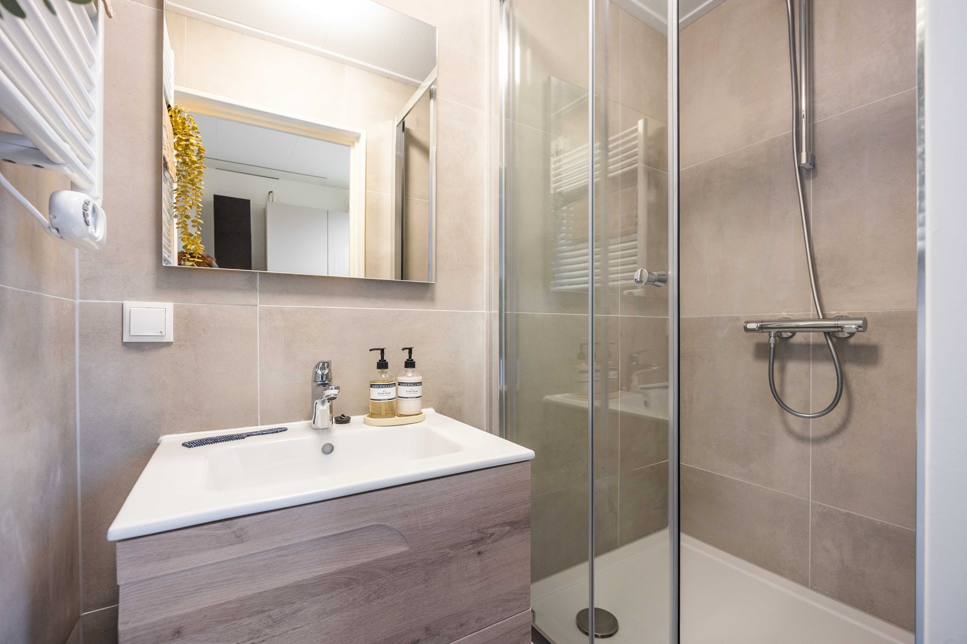 Via een steegje kom je bij de voordeur, die toegang geeft tot de trap naar de eerste verdieping waar het appartement ligt. Je stapt binnen in een hal die uitkomt in de ruime woonkamer van circa 31 m² met open keuken. De keuken is modern en verzorgd en uitgerust met alle basisvoorzieningen. Hier vind je ook de aansluiting voor de wasmachine. Vanuit de keuken bereik je de badkamer, ingericht met een douche, wastafel en meubel.